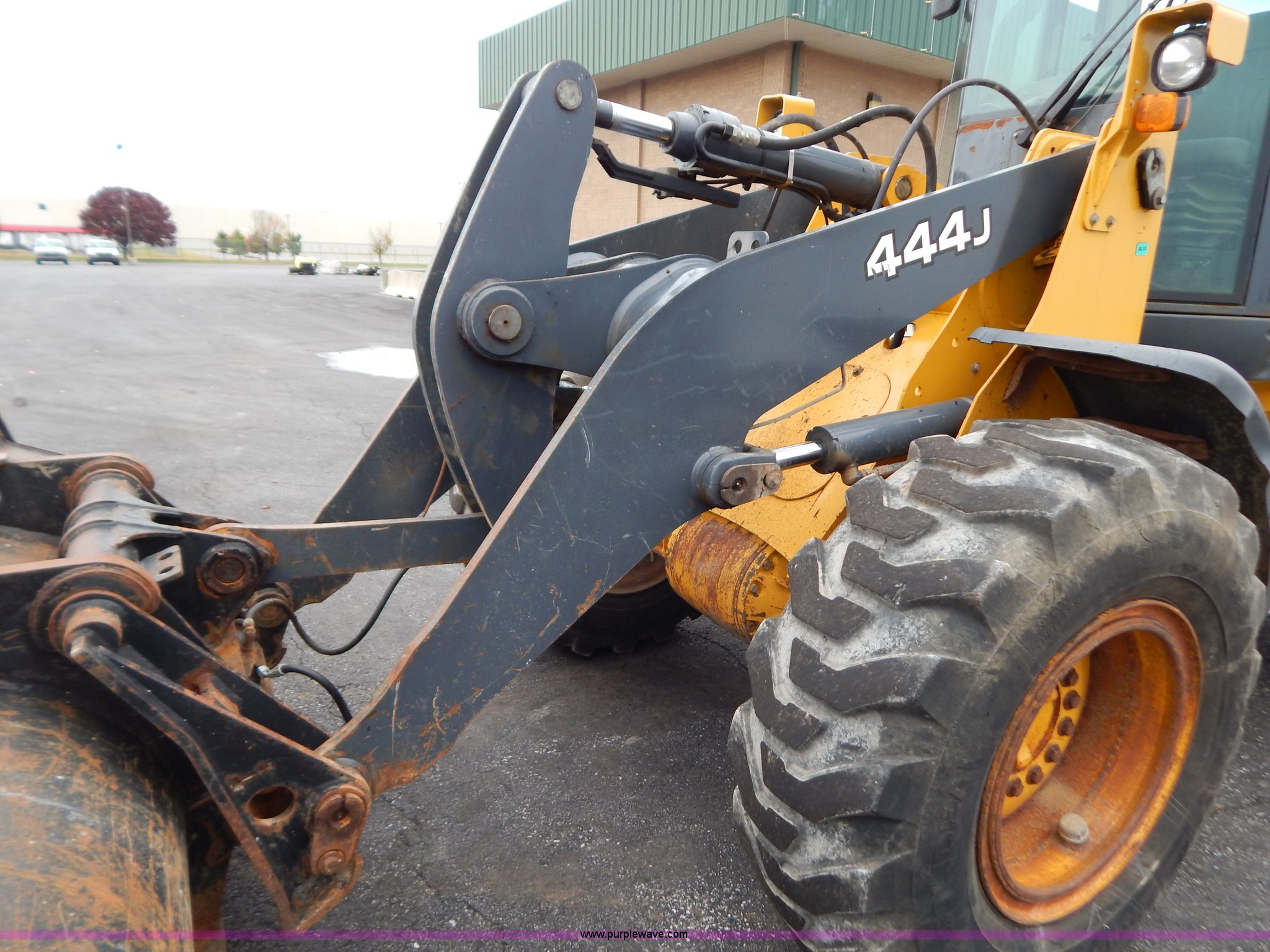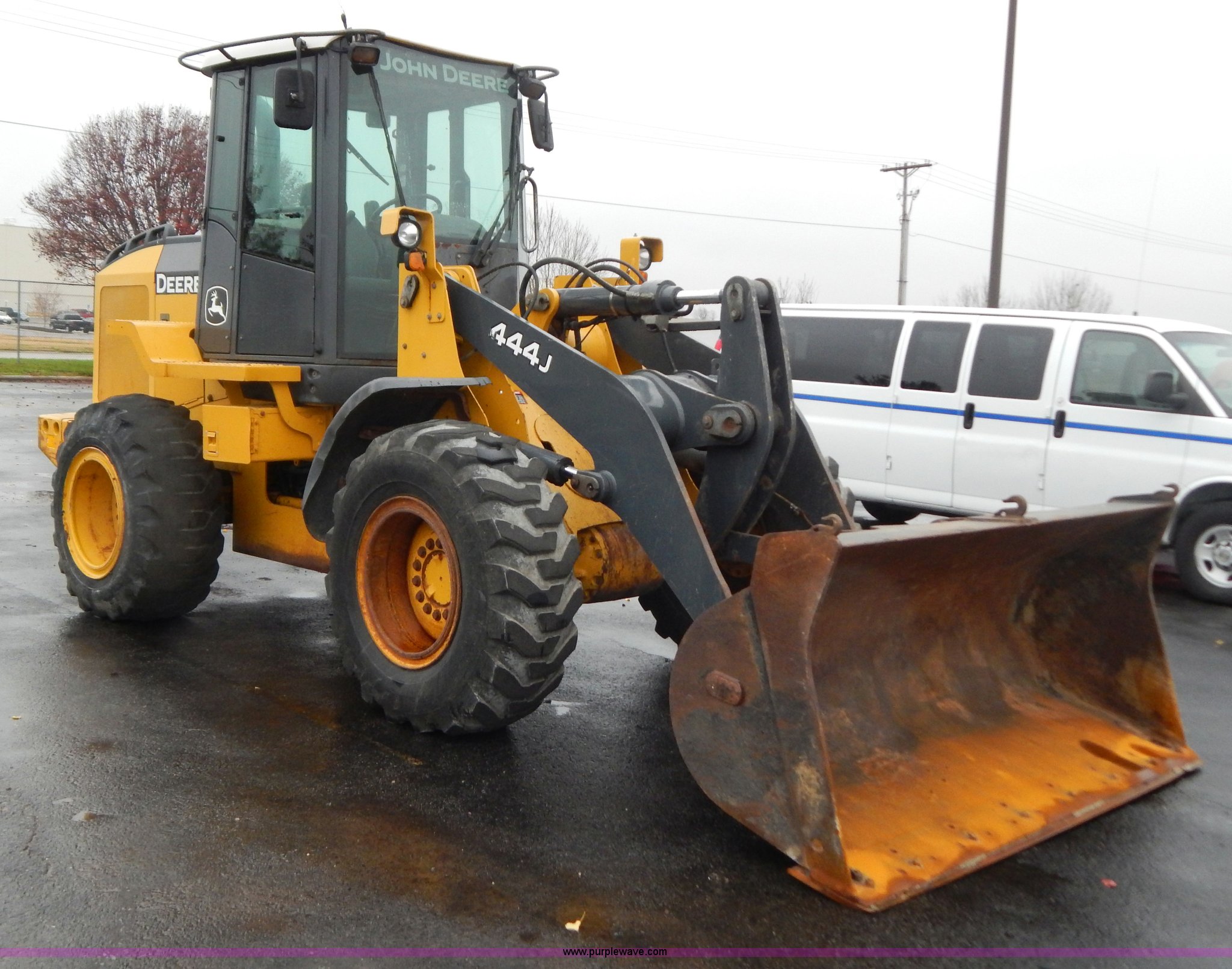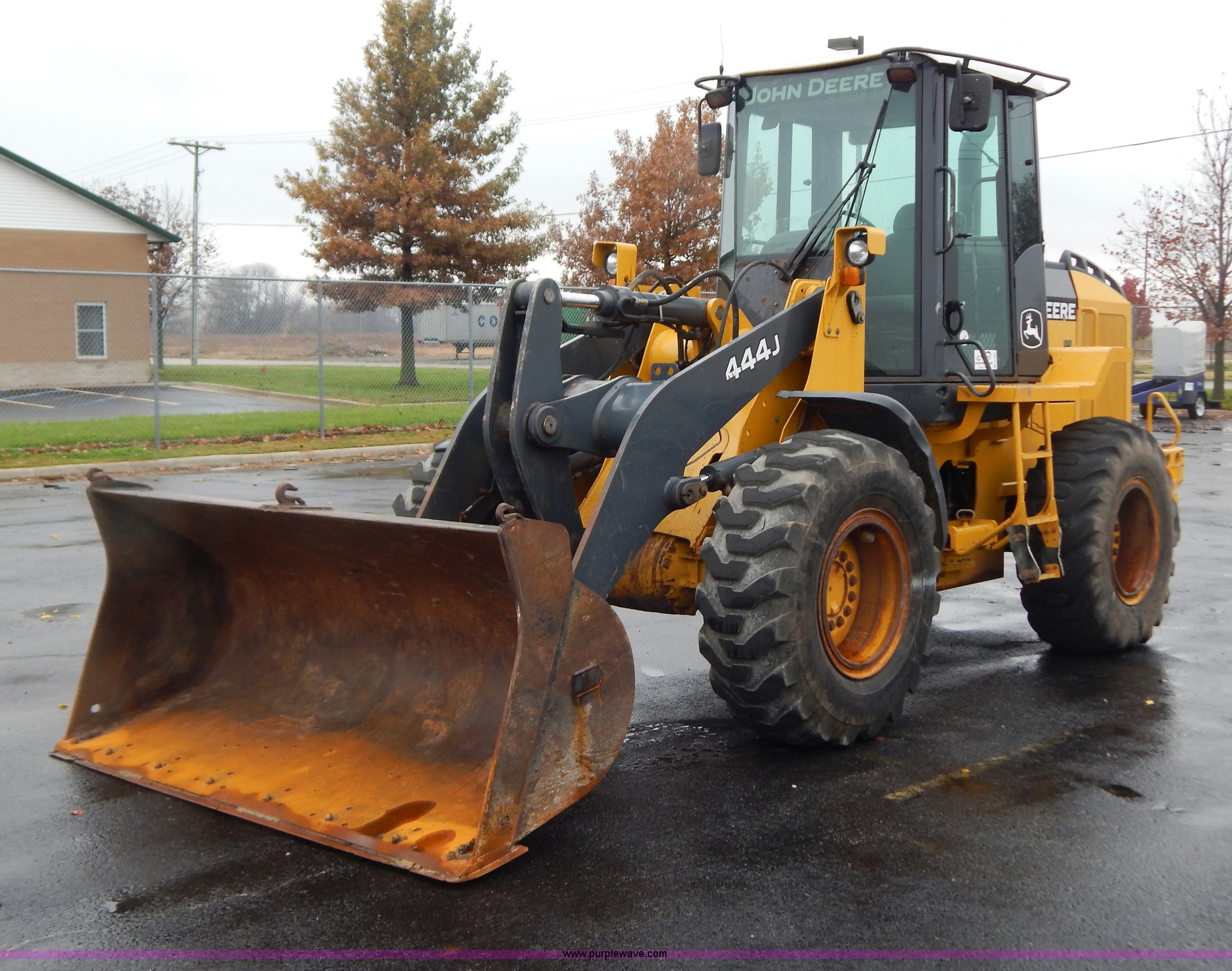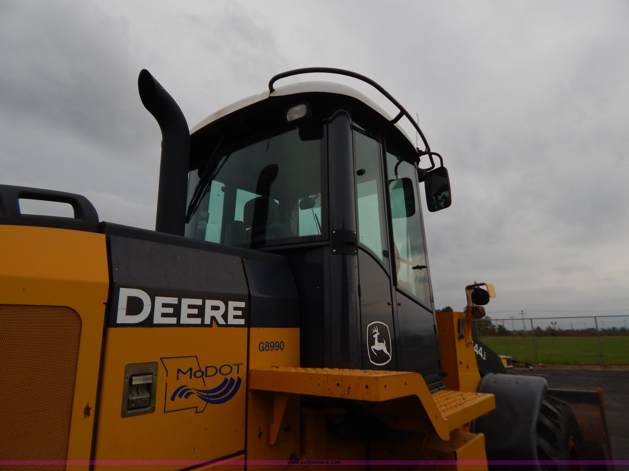 Purple Wave is selling a used Wheel Loader in Missouri. This item is a 2004 John Deere 444J loader with the following: 5,322 hours on meter, John Deere 4.5L turbo diesel engine, Four speed shuttle shift transmission, Enclosed cab, Heat, Joystick loader control, Front and rear work lights, 95"W smooth cutting edge bucket, 2.50 cubic yard capacity, Rear counter weight, Rear pin hitch, 17.5-25 tires, Rear axle noise, Serial DW444JZ591190, MoDOT ID G8990
