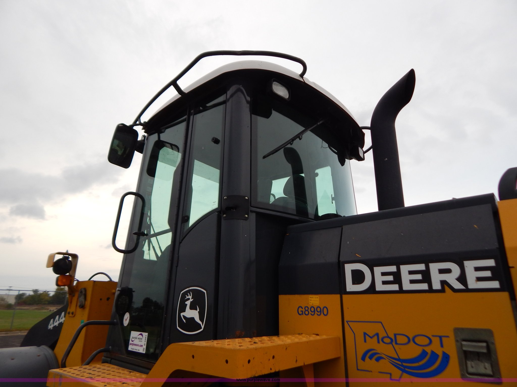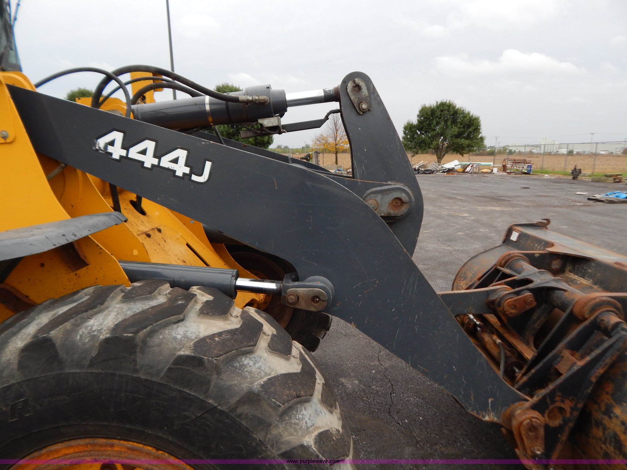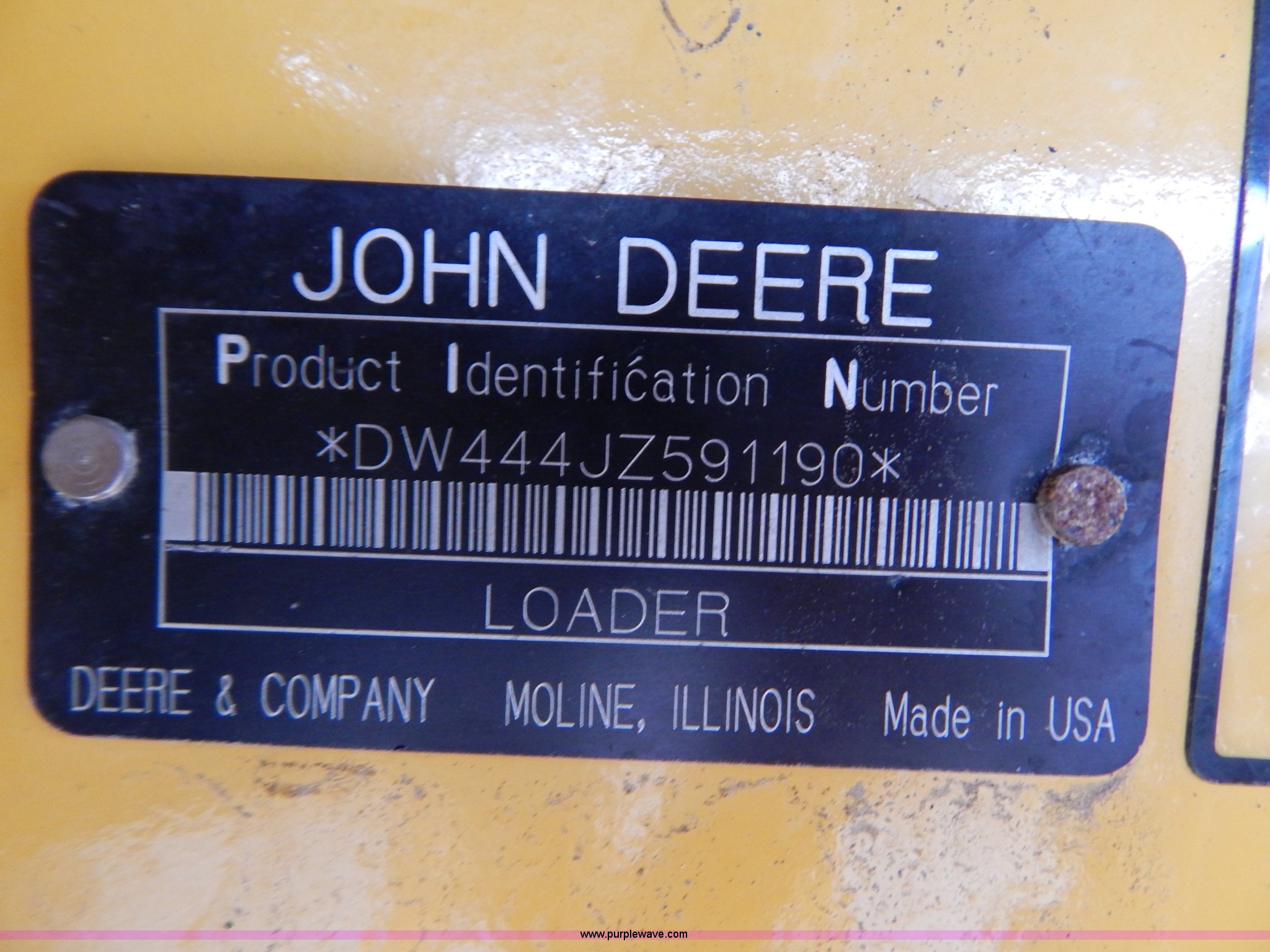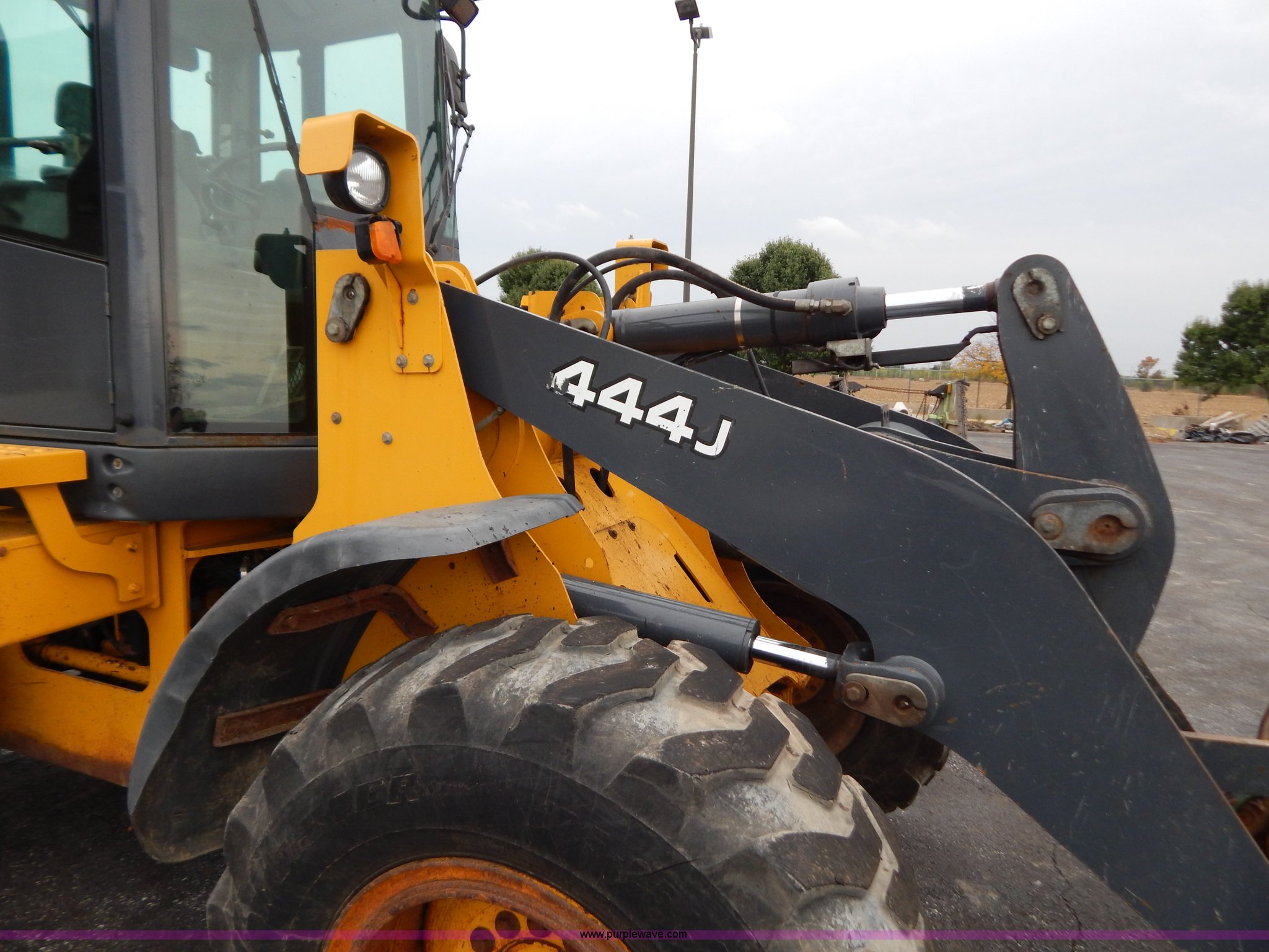 Purple Wave is selling a used Wheel Loader in Missouri. This item is a 2004 John Deere 444J loader with the following: 5,322 hours on meter, John Deere 4.5L turbo diesel engine, Four speed shuttle shift transmission, Enclosed cab, Heat, Joystick loader control, Front and rear work lights, 95"W smooth cutting edge bucket, 2.50 cubic yard capacity, Rear counter weight, Rear pin hitch, 17.5-25 tires, Rear axle noise, Serial DW444JZ591190, MoDOT ID G8990