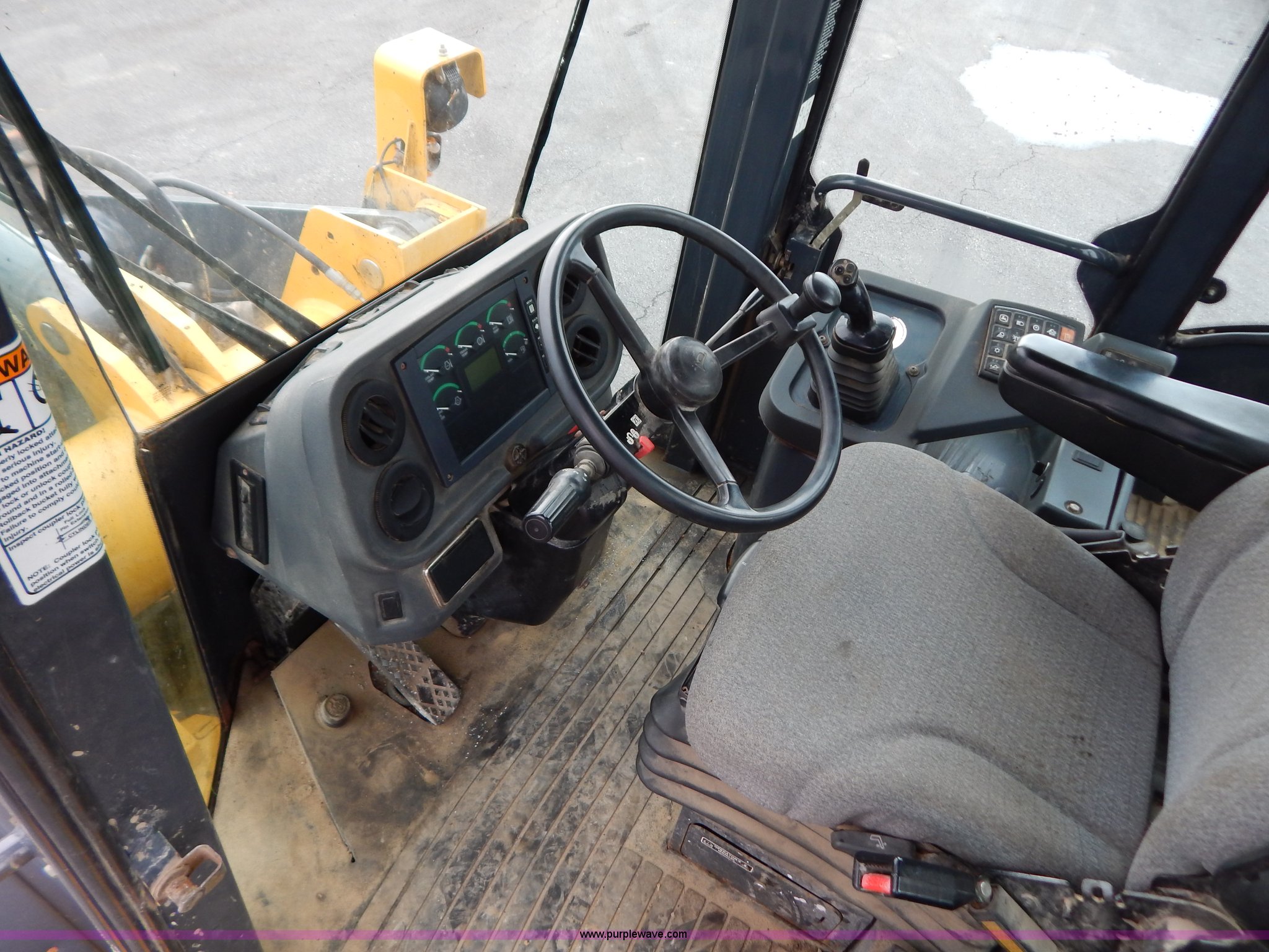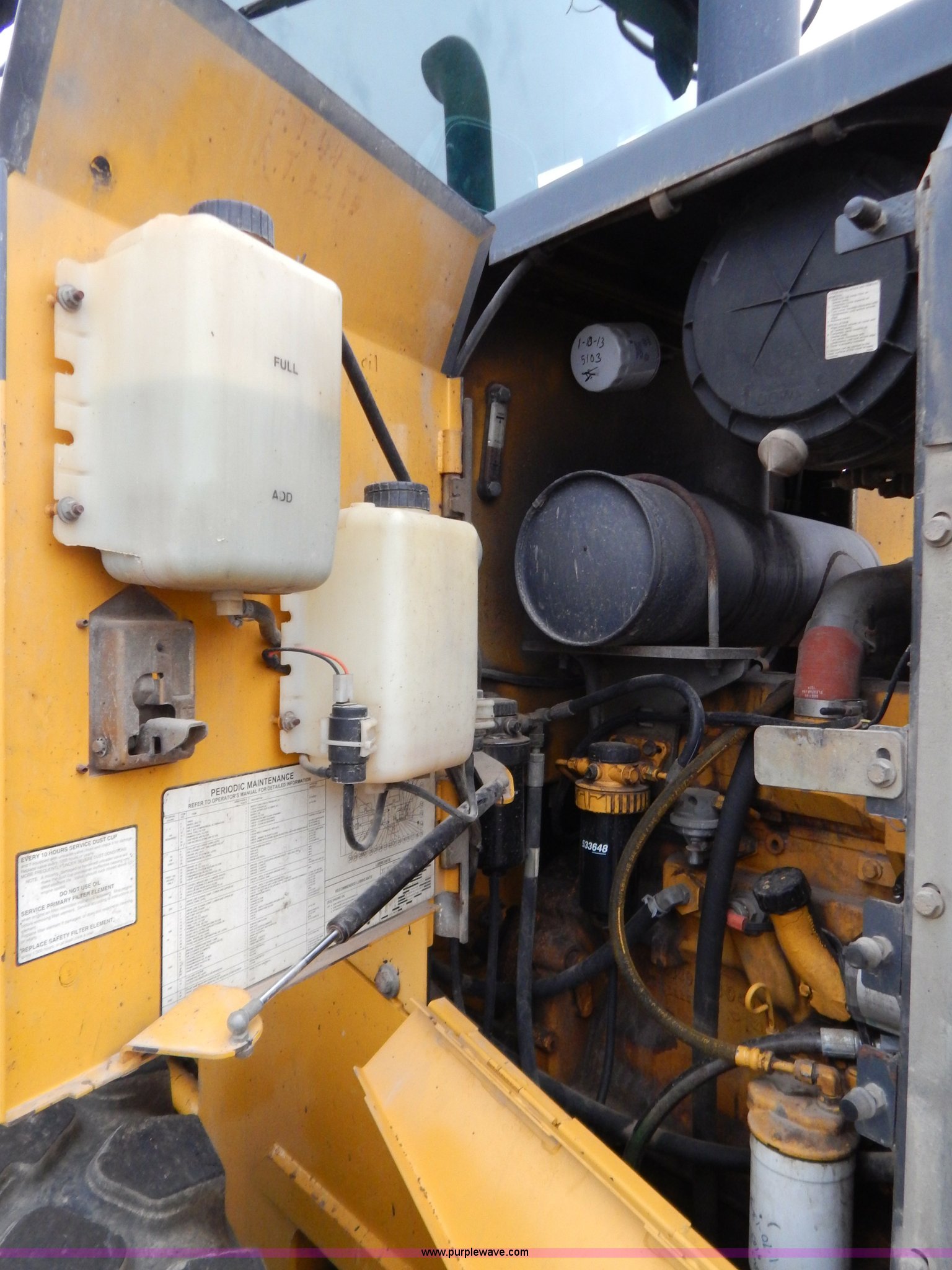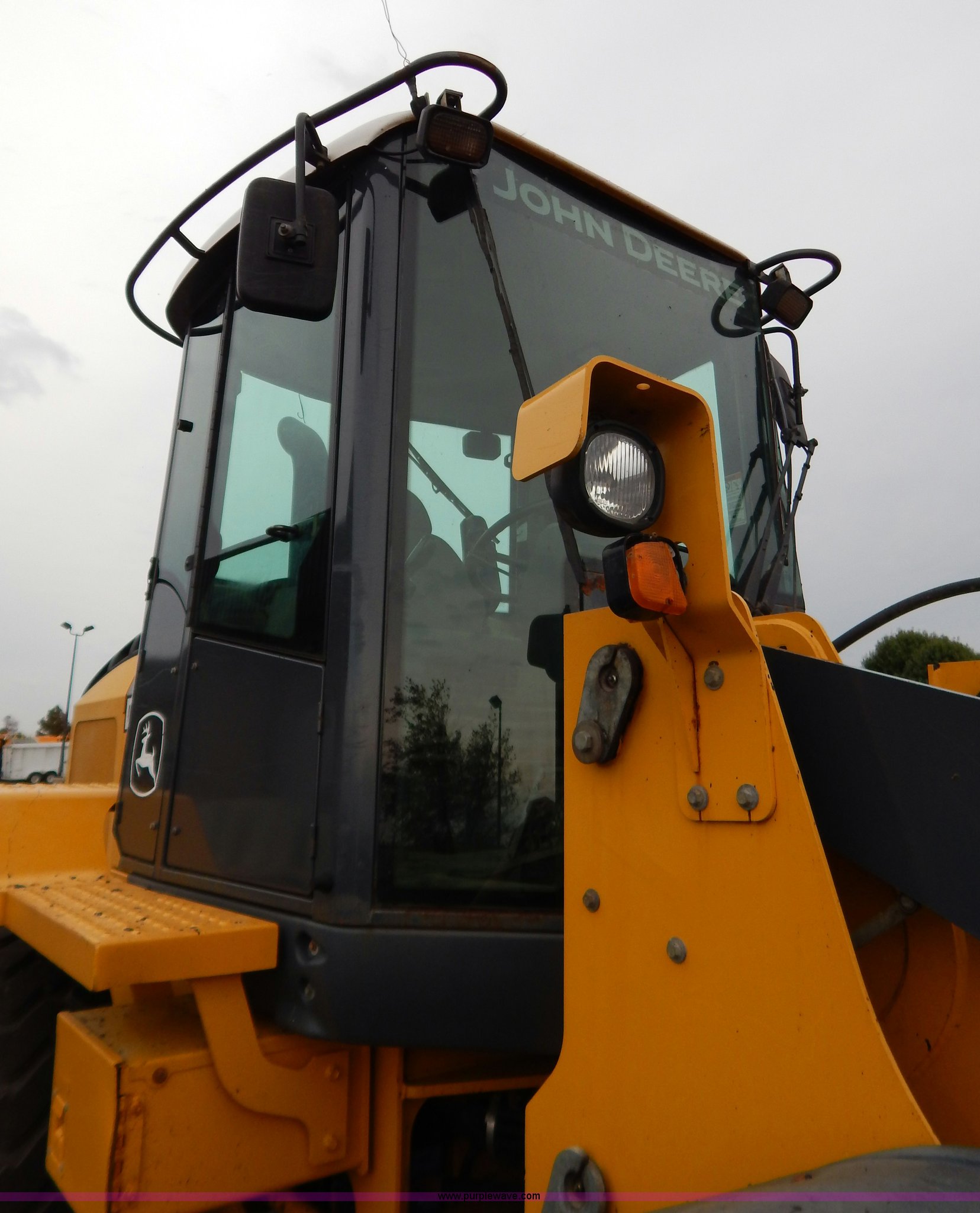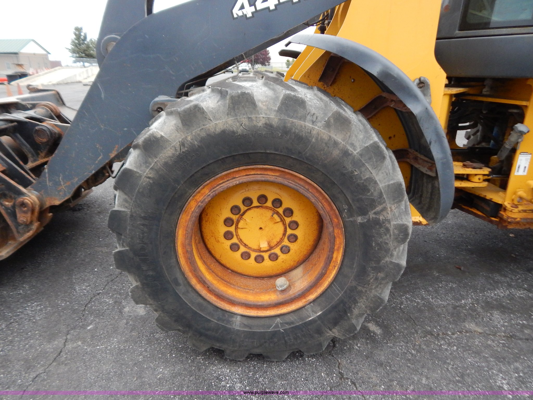Purple Wave is selling a used Wheel Loader in Missouri. This item is a 2004 John Deere 444J loader with the following: 5,322 hours on meter, John Deere 4.5L turbo diesel engine, Four speed shuttle shift transmission, Enclosed cab, Heat, Joystick loader control, Front and rear work lights, 95"W smooth cutting edge bucket, 2.50 cubic yard capacity, Rear counter weight, Rear pin hitch, 17.5-25 tires, Rear axle noise, Serial DW444JZ591190, MoDOT ID G8990