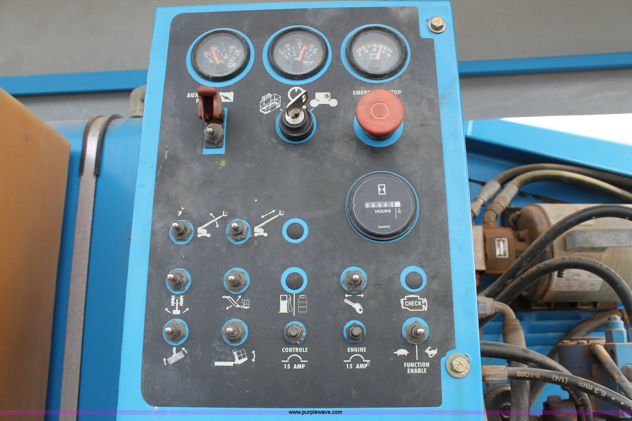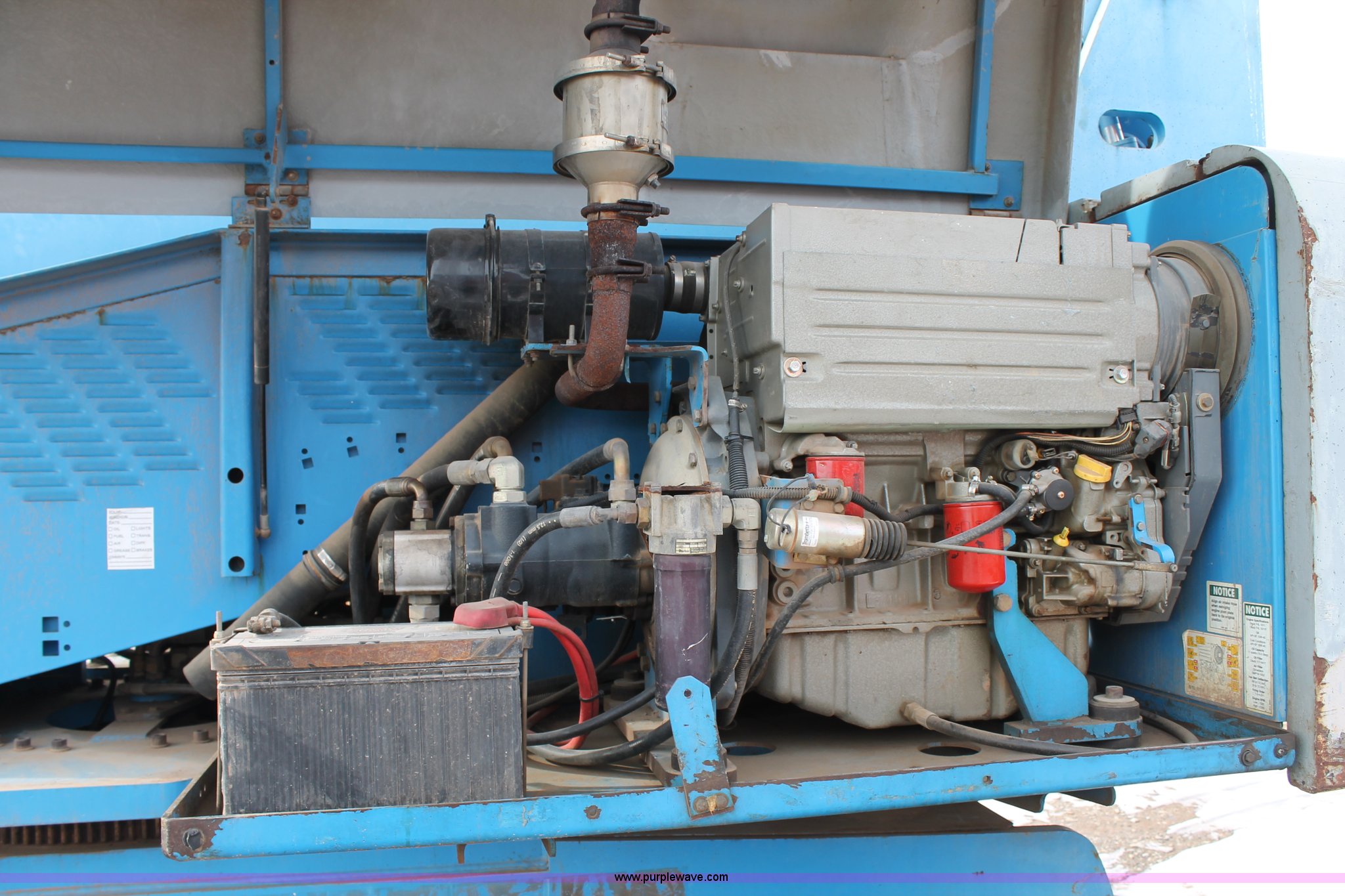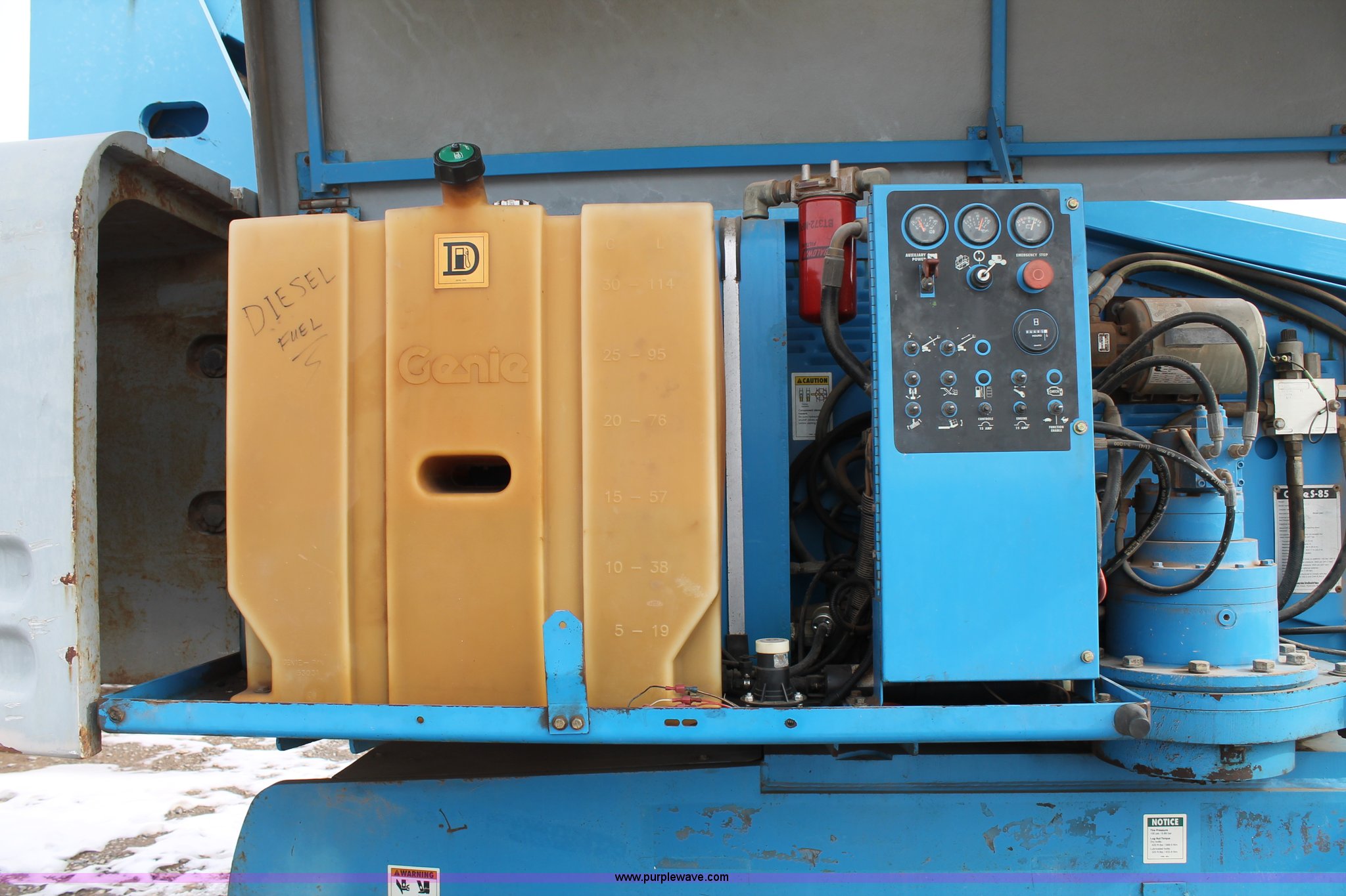 Purple Wave is selling a used Boom Lift in Oklahoma. This item is a 2000 Genie S85 boom lift with the following: 4,481 hours on meter, Four cylinder diesel engine, Engine replaced at 3,436 hours, Four wheel drive, 91' working height, 85' platform height, 76.5' horizontal reach, 500 lbs lift capacity, 360 degree continuous rotation turntable, Self-leveling platform with hydraulic platform rotation, 15-22.5 tires