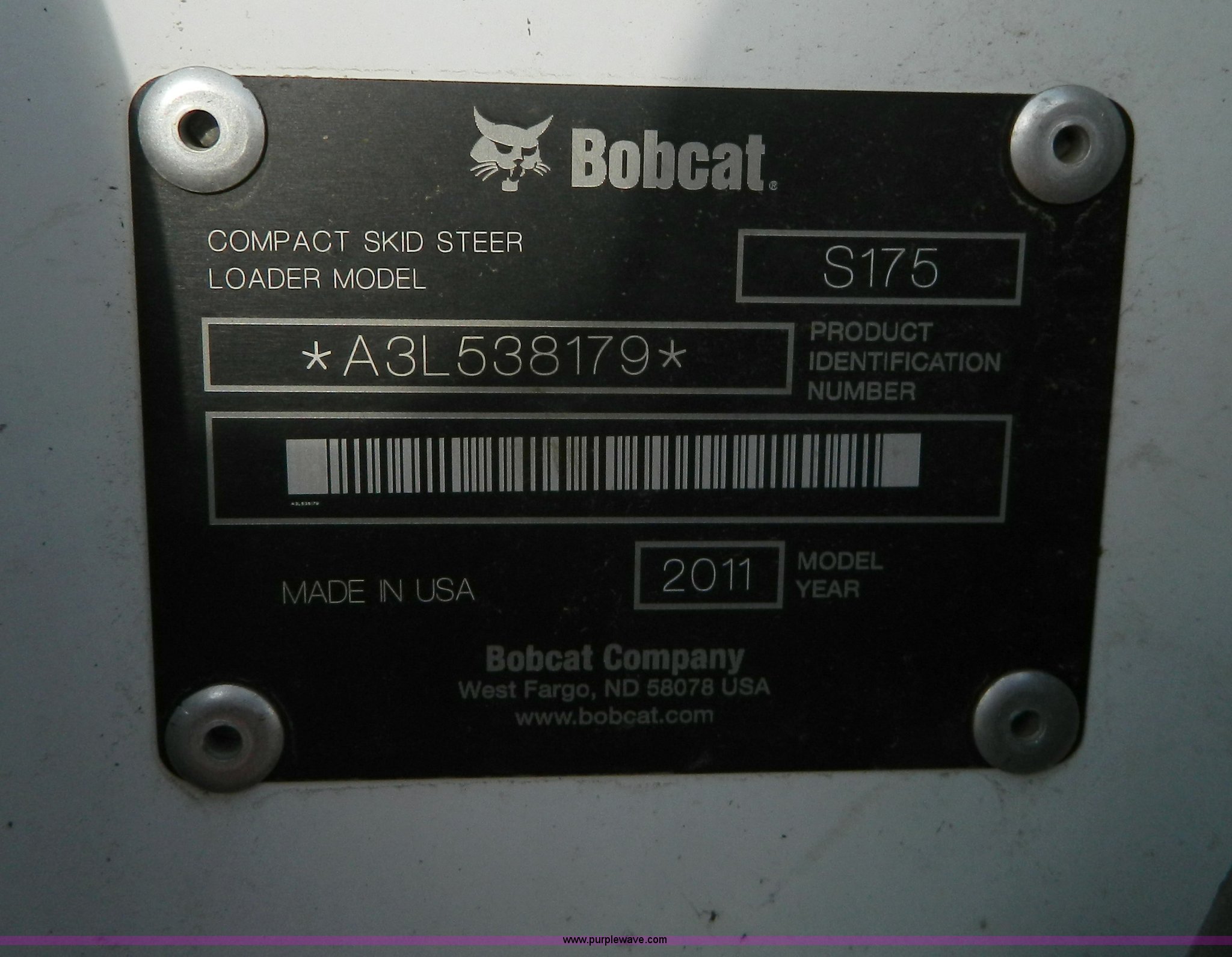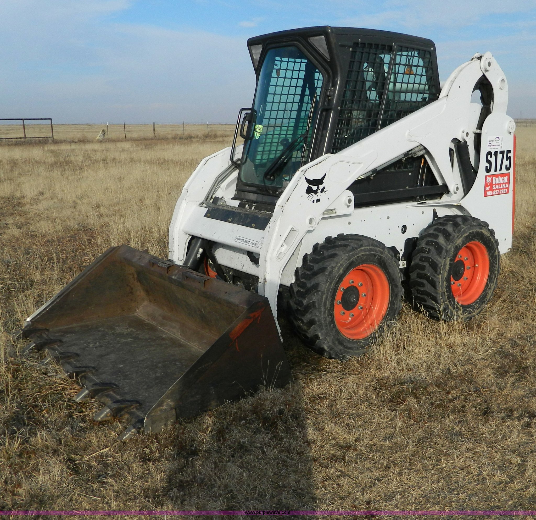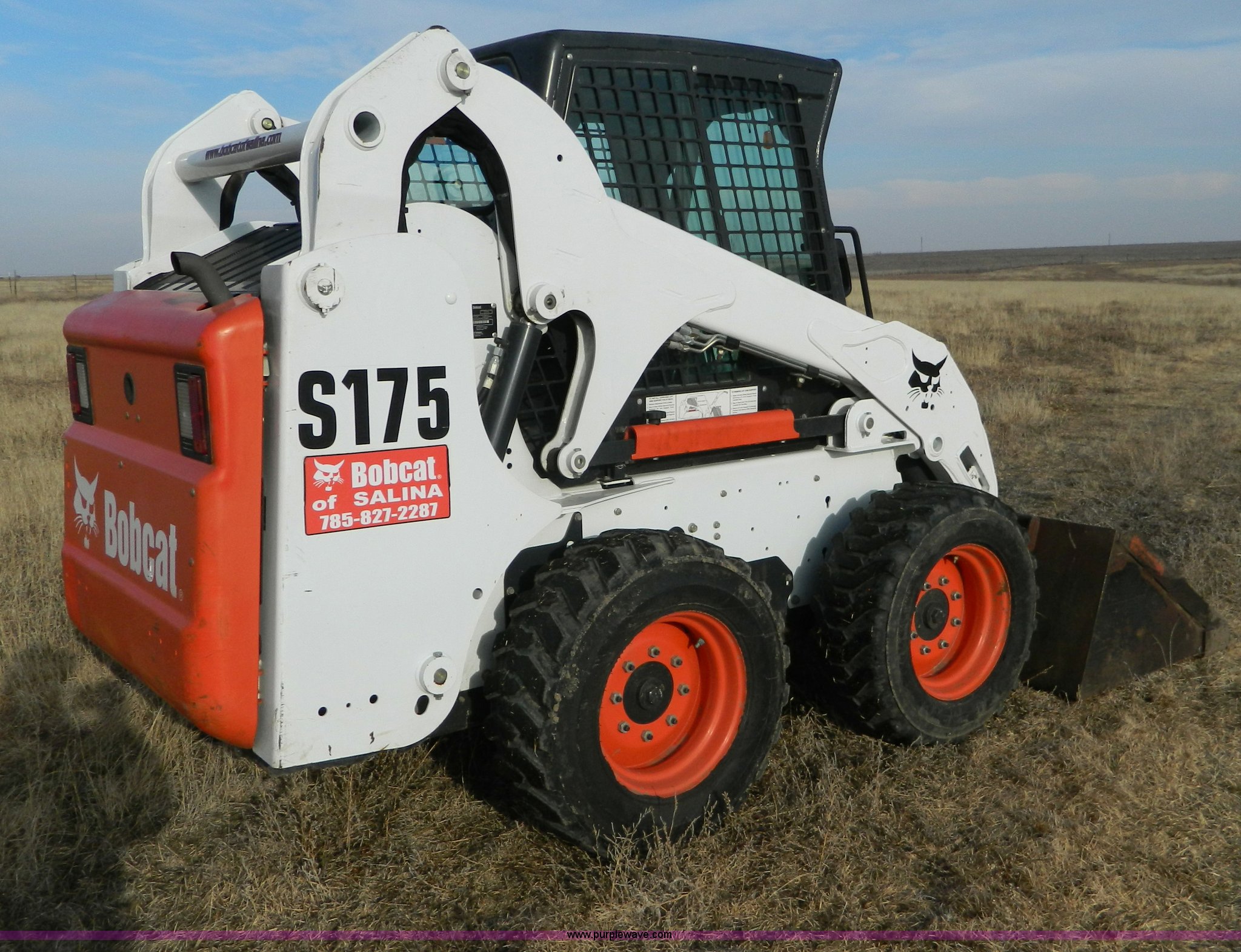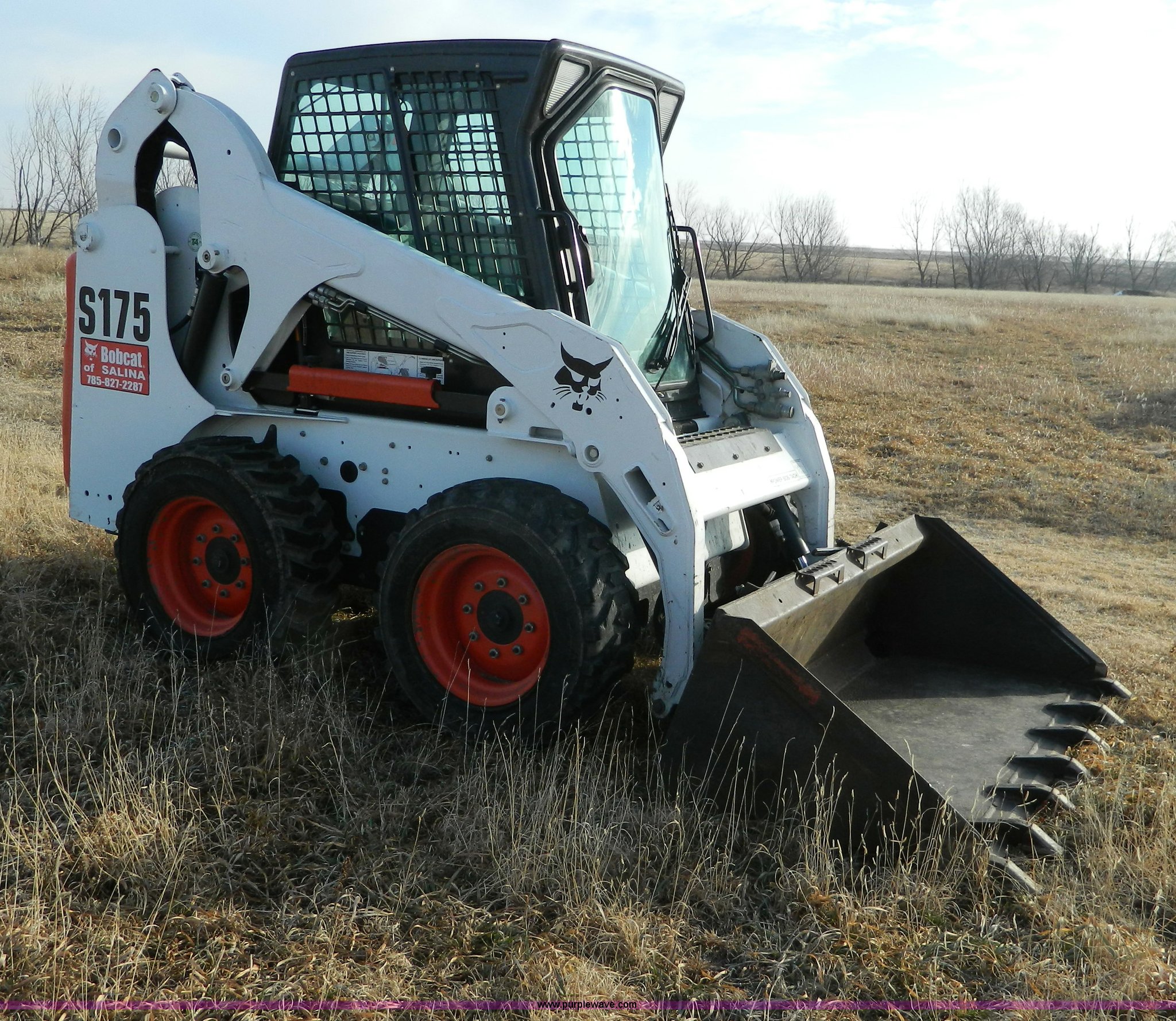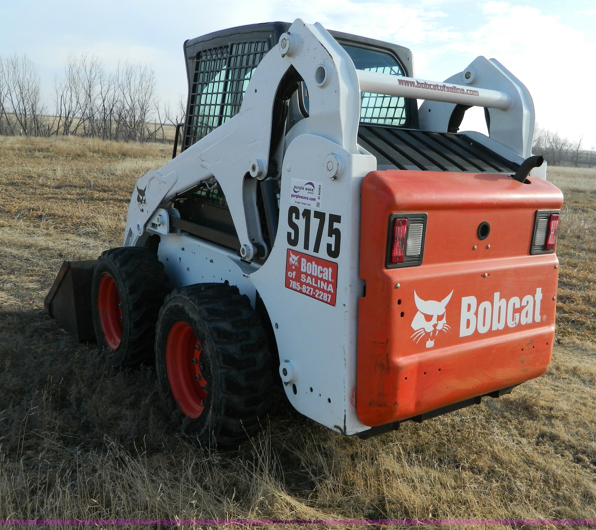 Purple Wave is selling a used Skid Steer Loader in Kansas. This item is a 2011 Bobcat S175 skid steer with the following: 472 hours on meter, Kubota V2203-MDI four cylinder diesel engine, 46 HP, Engine serial BJ0055, Hydrostatic transmission, Enclosed cab, Heat, Windshield wipers, Hand and foot controls, Spring suspension seat, High flow auxiliary hydraulics, Front and rear work lights, 67"W buckets, Weld-on cutting edge, Pinned teeth, 10-16.5 tires, 1,750 lbs rated load capacity, 6,220 lbs. base operating weight, Serial A3L538179