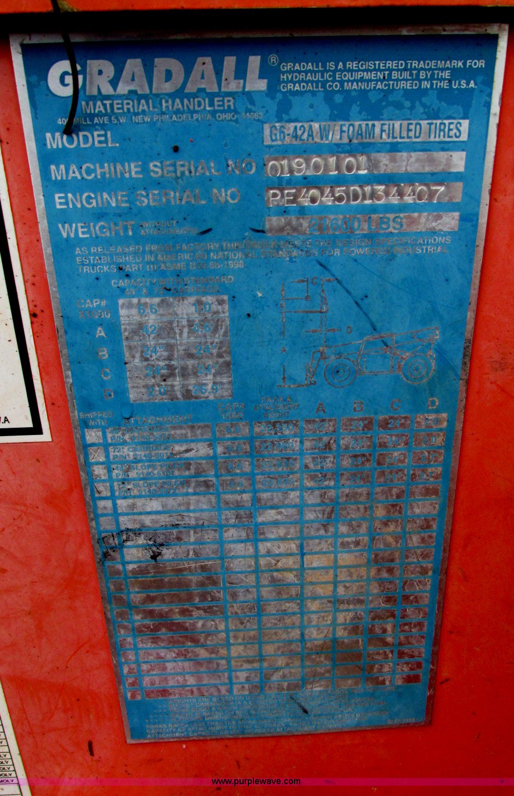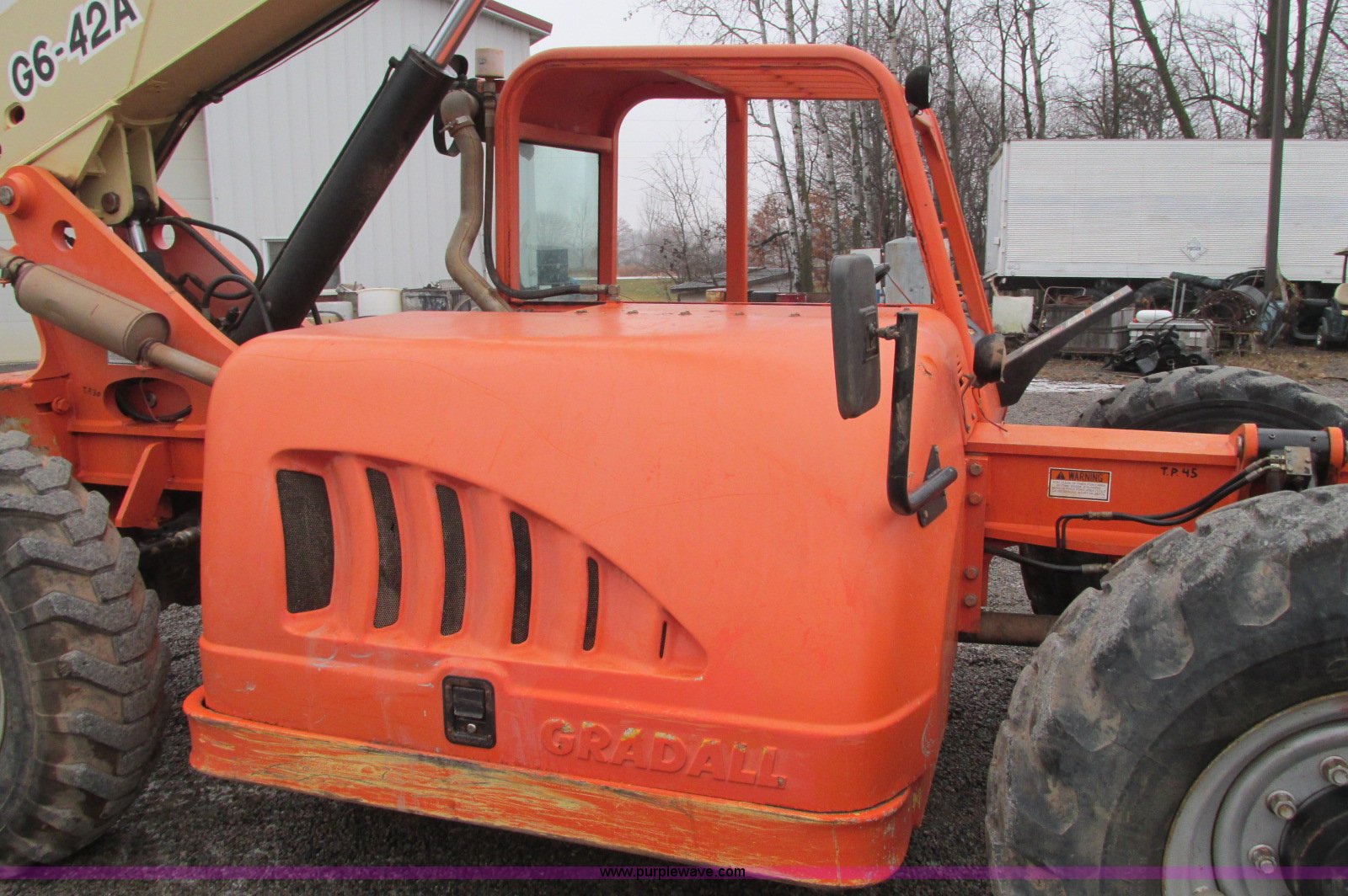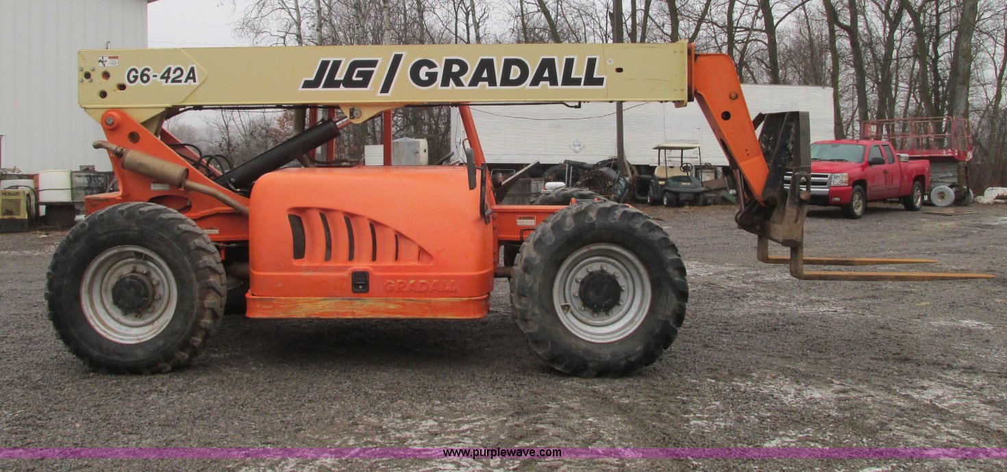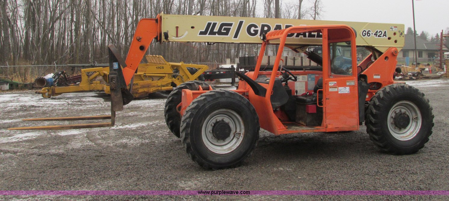 Purple Wave is selling a used Telehandler in Minnesota. This item is a 2003 JLG G6-42A Gradall rough terrain telehandler with the following: 4,651 hours on meter, Hours may vary, still in use, John Deere Power Tech 4.5L diesel engine, Serial PE4045D134407, Powershift transmission, Four wheel drive, Four wheel steering, OROPS, Gradall fork attachment, Attachment# 9140-5073, 485 lbs, 10,000 lbs capacity, 59"L forks, 48" max fork width, 29' max reach, 42' max lift, 6,600 lbs rated capacity at 24" load center, Rear counter weight, Front and rear work lights, High Bias limited slip front axle, Planetary rear axle, 128" wheelbase, Solideal 13.00-24T6 foam-filled tires, 21,600 lbs. base operating weight, Lift brackets to engine compartment broken, Damaged forks, Serial 0190101