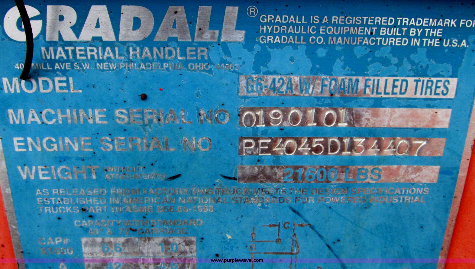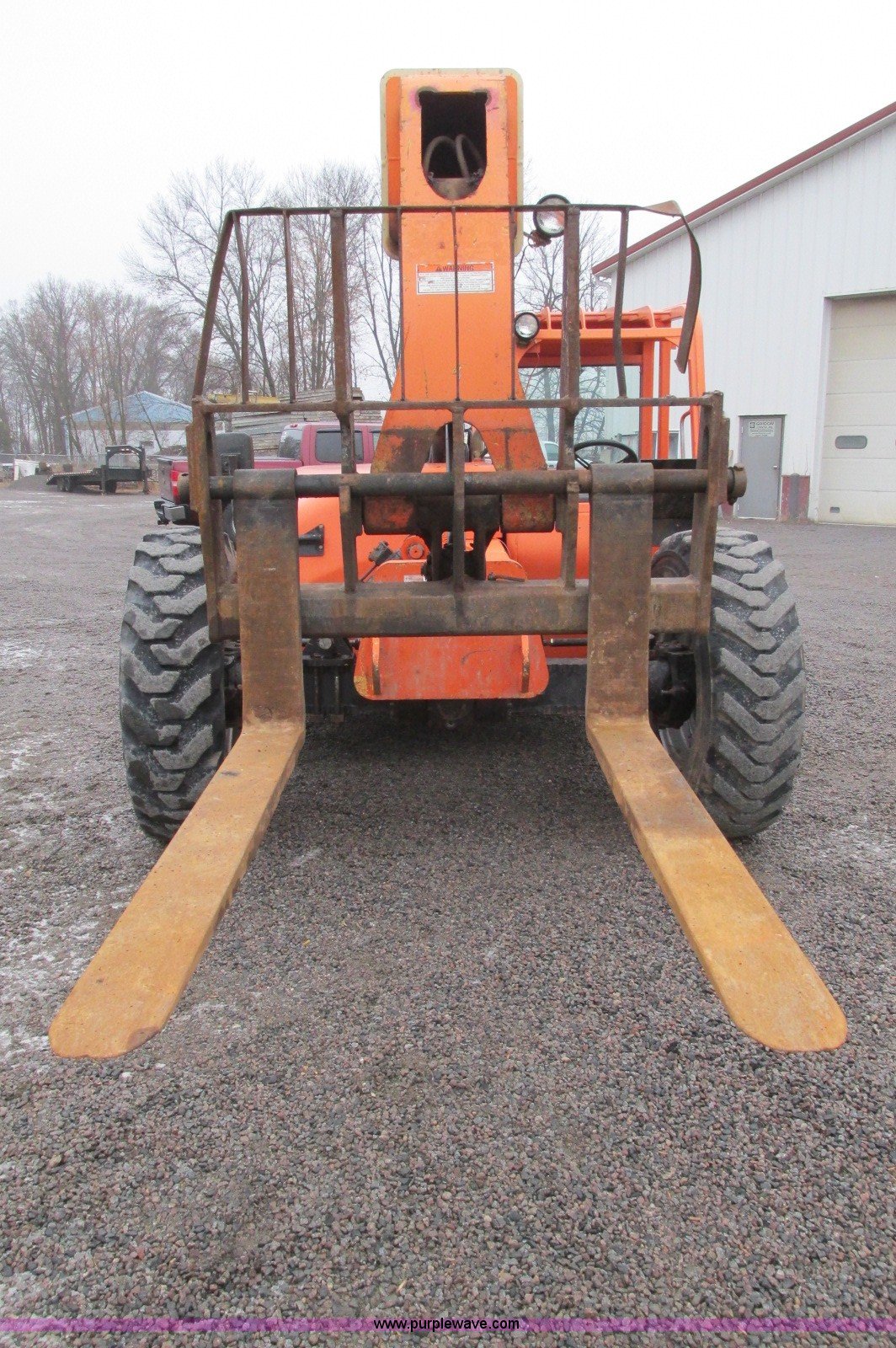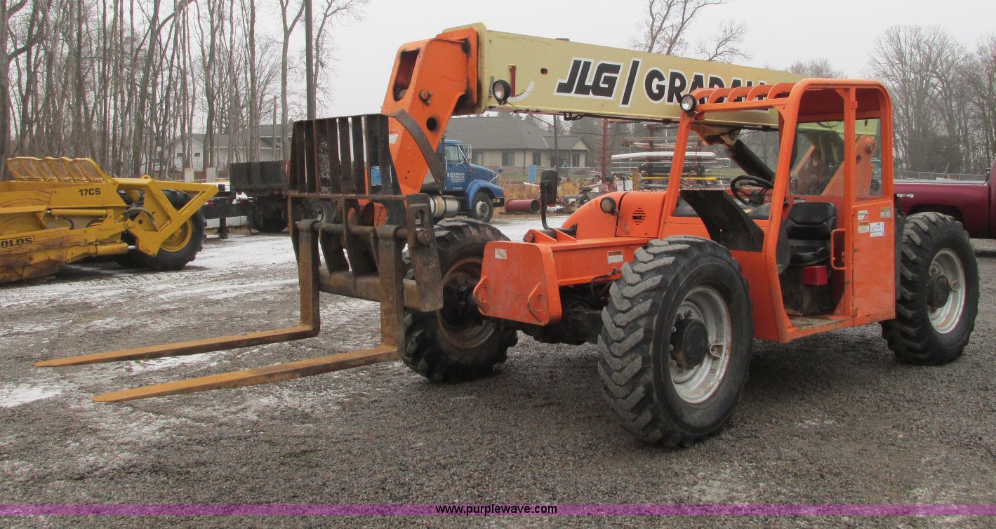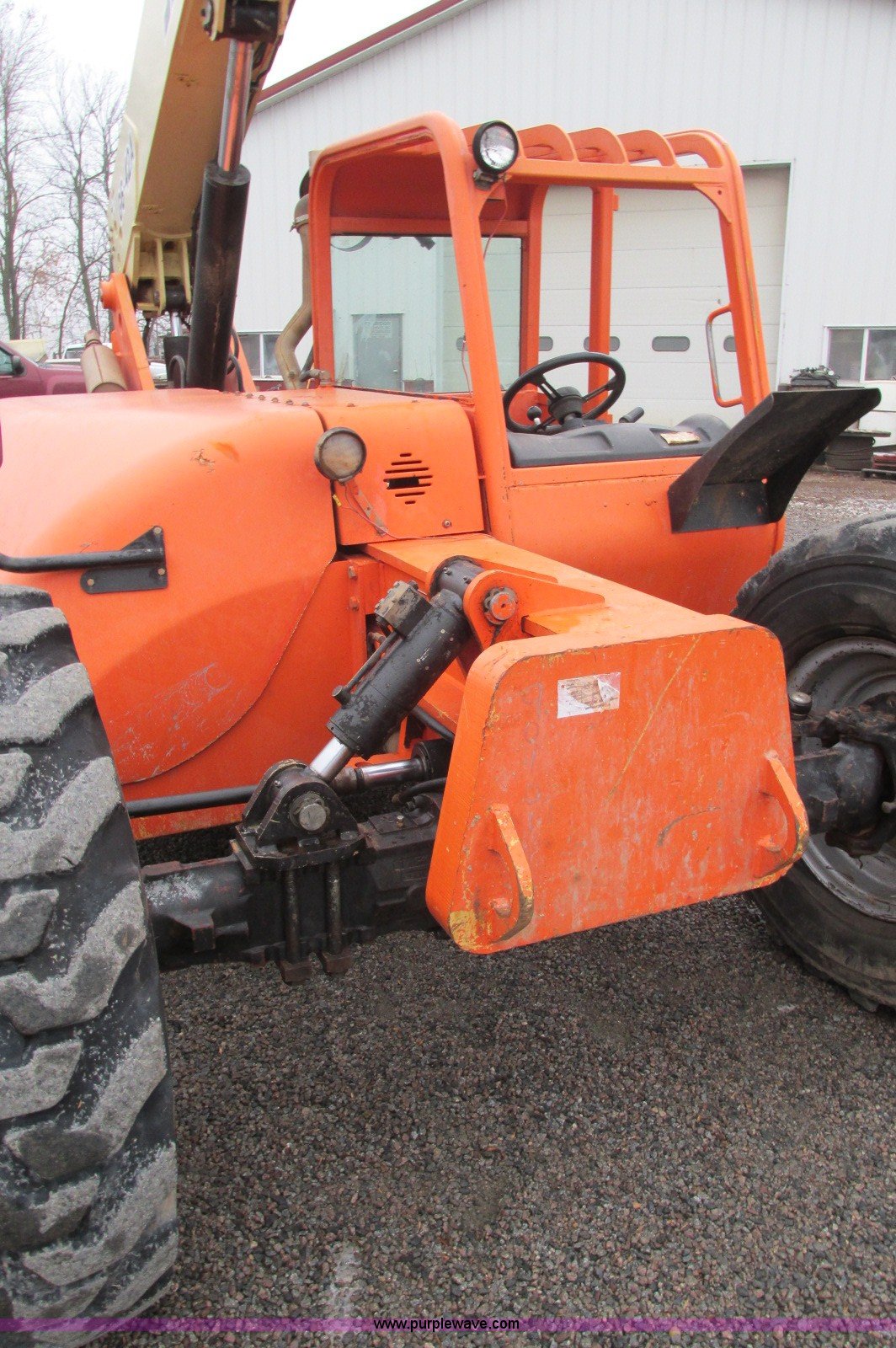 Purple Wave is selling a used Telehandler in Minnesota. This item is a 2003 JLG G6-42A Gradall rough terrain telehandler with the following: 4,651 hours on meter, Hours may vary, still in use, John Deere Power Tech 4.5L diesel engine, Serial PE4045D134407, Powershift transmission, Four wheel drive, Four wheel steering, OROPS, Gradall fork attachment, Attachment# 9140-5073, 485 lbs, 10,000 lbs capacity, 59"L forks, 48" max fork width, 29' max reach, 42' max lift, 6,600 lbs rated capacity at 24" load center, Rear counter weight, Front and rear work lights, High Bias limited slip front axle, Planetary rear axle, 128" wheelbase, Solideal 13.00-24T6 foam-filled tires, 21,600 lbs. base operating weight, Lift brackets to engine compartment broken, Damaged forks, Serial 0190101