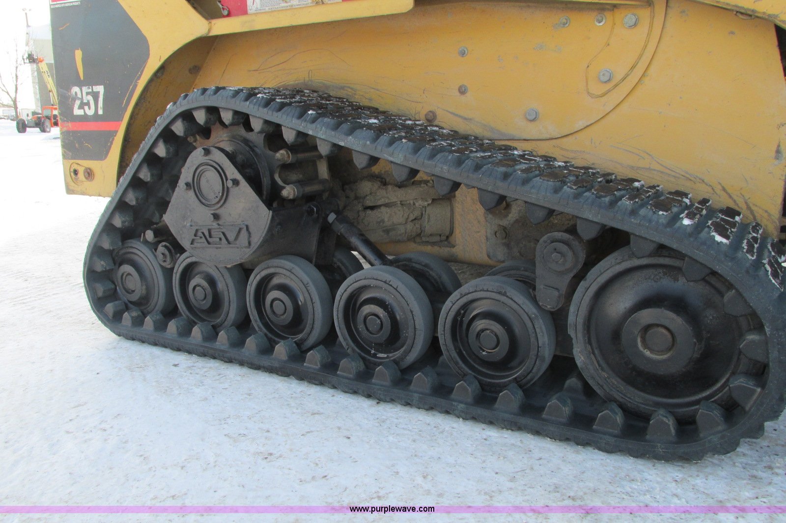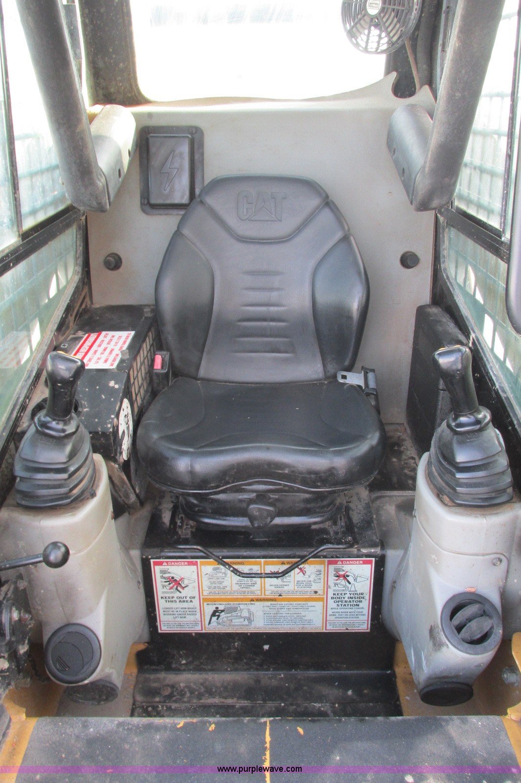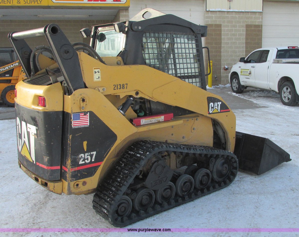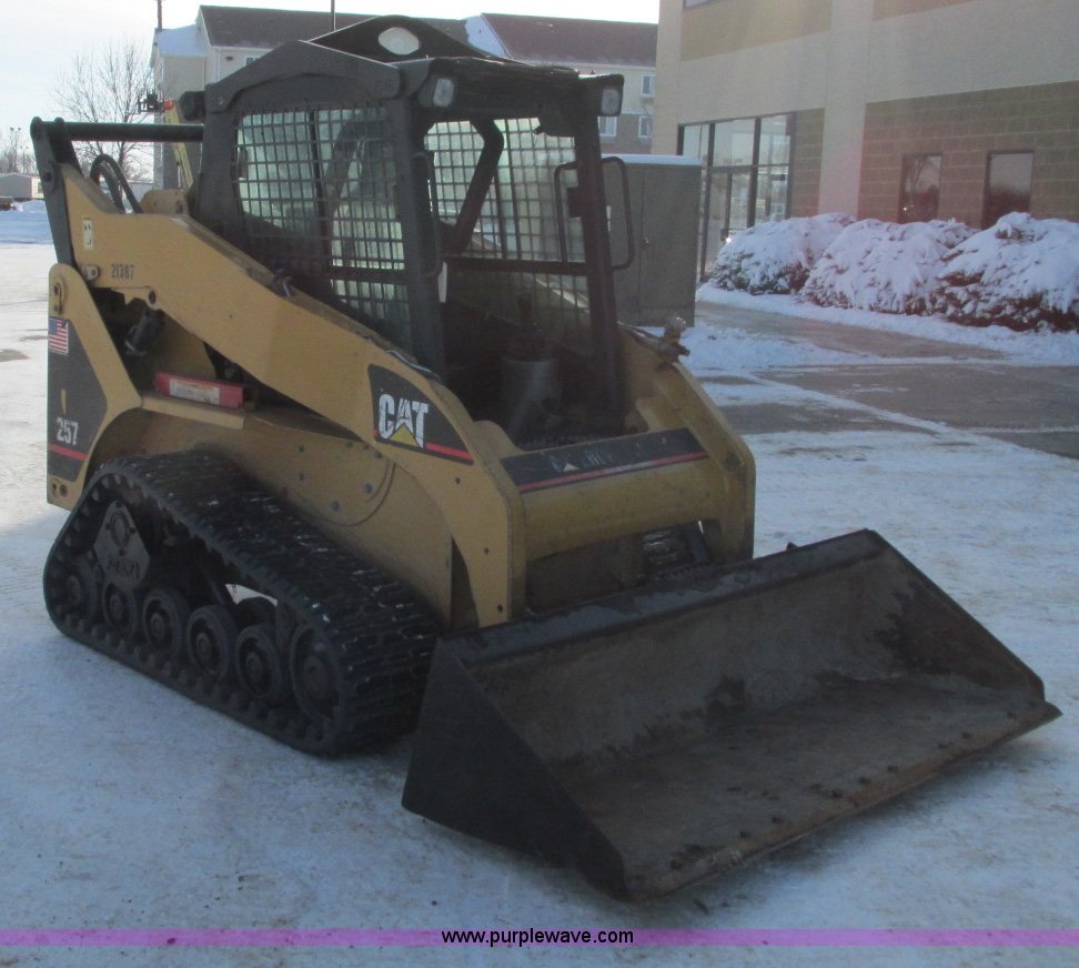Purple Wave is selling a used Tracked Skid Steer Loader in South Dakota. This item is a 2003 Caterpillar 257 track skid steer with the following: 2,095 hours on meter, Caterpillar 3034 engine, 63 HP, 2,305 lbs capacity, Enclosed cab, Heat, Caterpillar joystick controls, No front door, GP 72" bucket, Bolt-on cutting edge, Front and rear work lights, Front auxiliary hydraulics, Block heater, ASV track system, 14" tracks, Recently replaced, 7,628 lbs. base operating weight, Serial CAT00257HCMM01412