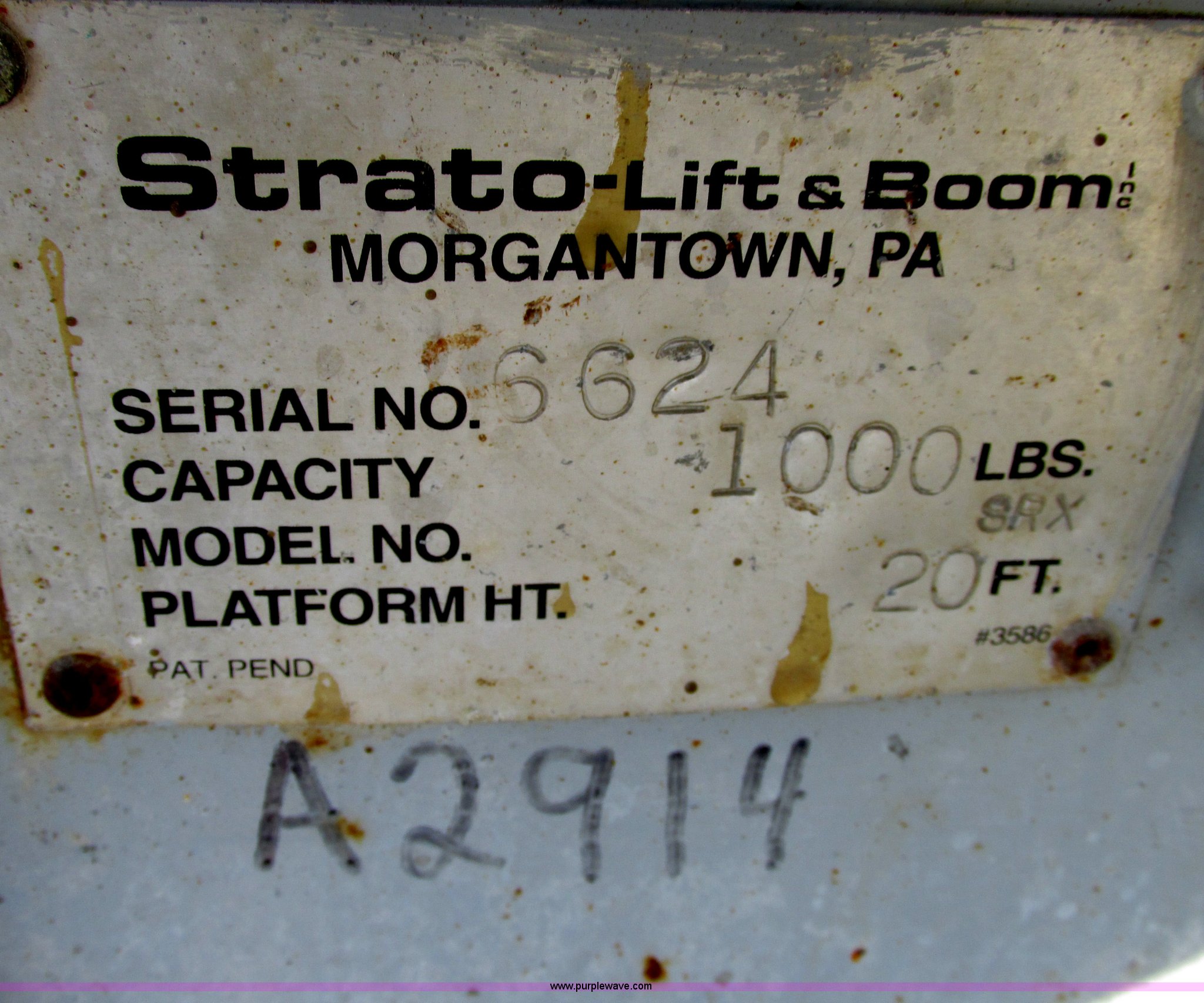 Purple Wave is selling a used Scissor or Vertical Lift in Missouri. This item is a Strato Lift 8RX scissor lift with the following: 24V electric system, (4) 6V batteries, On-board charger, 1,000 lbs maximum lift capacity, 20' maximum lift height, 48"W, 36" slide out platform extension, 16.5 x 5.5 x 8 tires, Unknown operating condition, Serial 6624