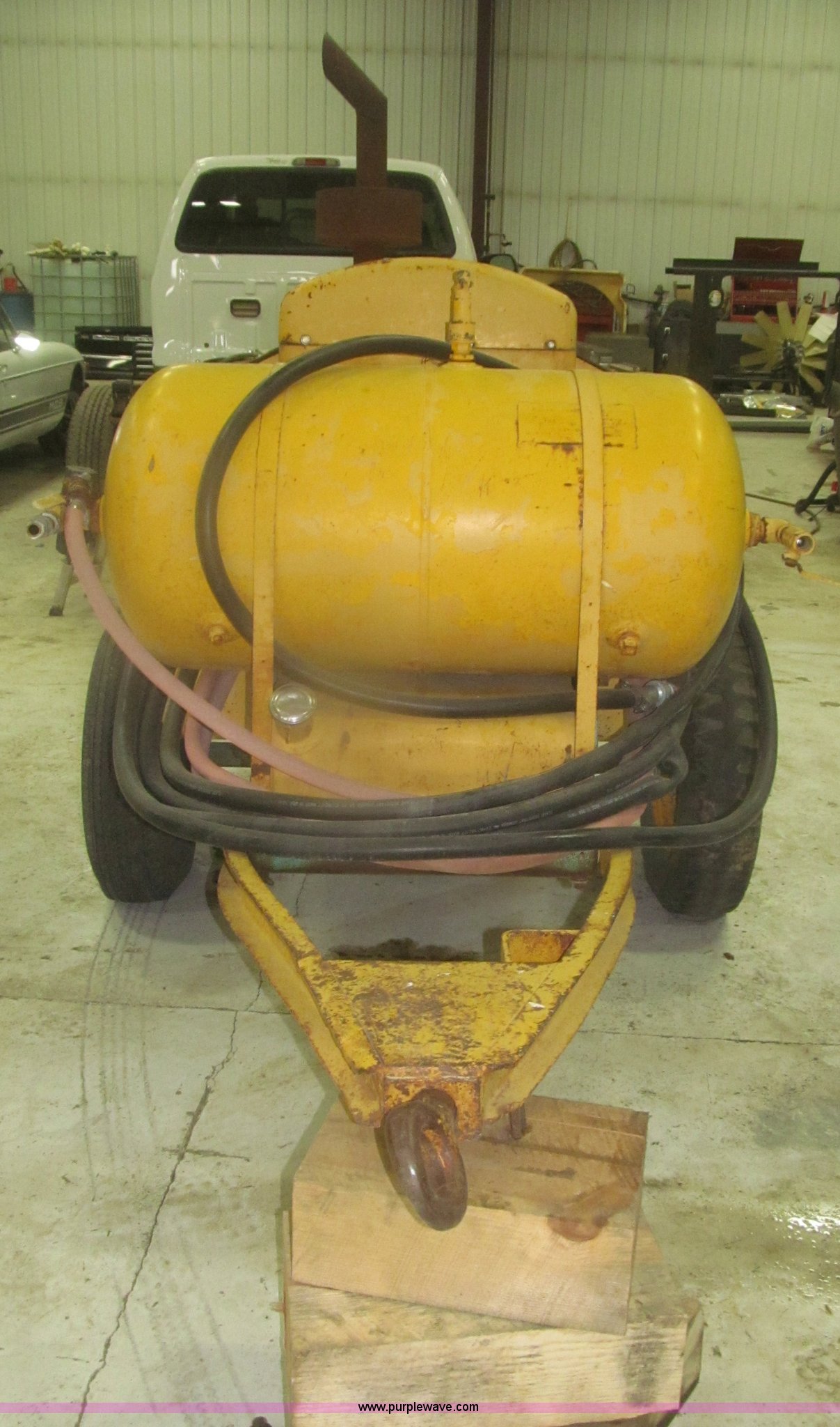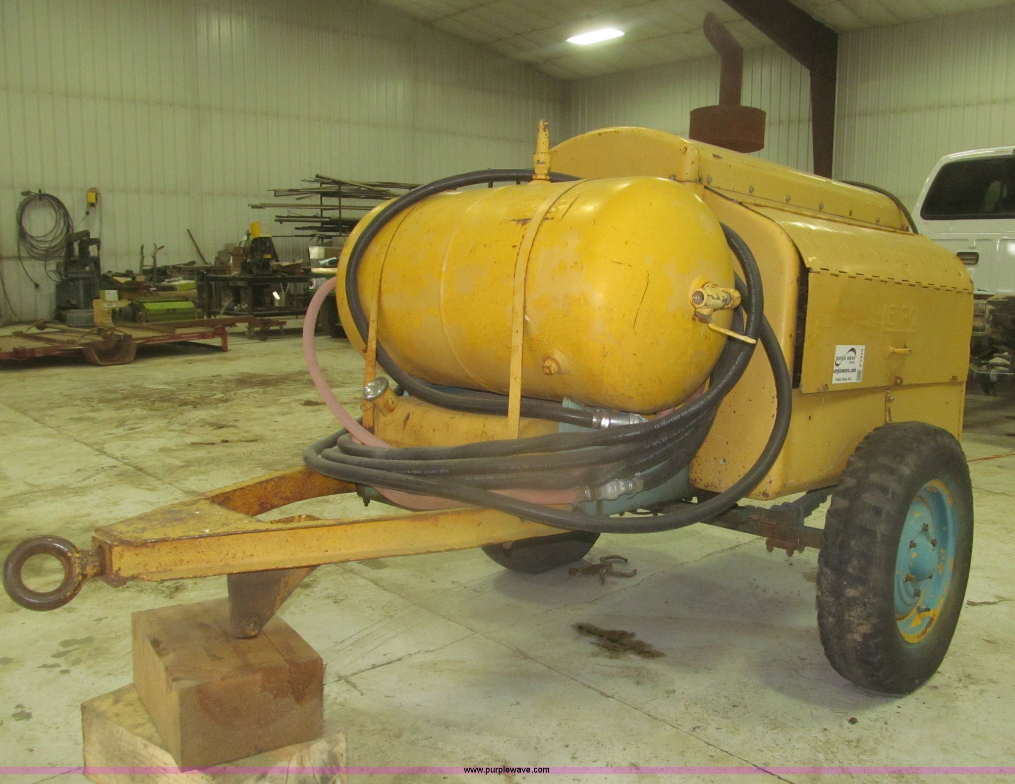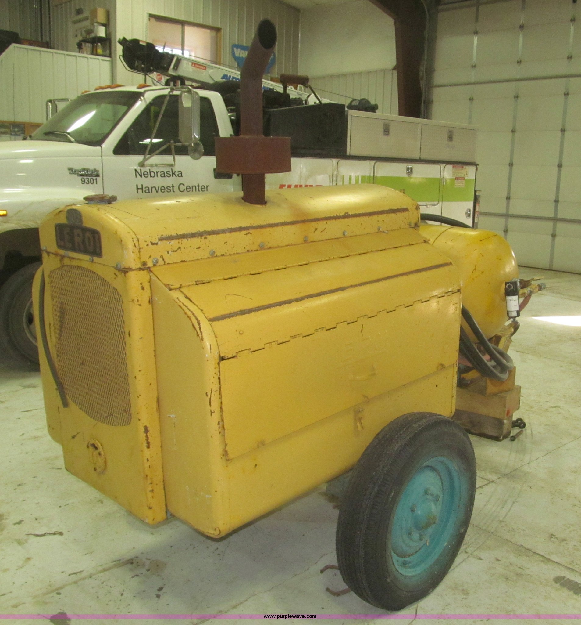 Purple Wave is selling a used Air Compressor in Nebraska. This item is a Leroi air compressor with the following: Four cylinder gas engine, Approximately 50'L air hose, Water separator, Model ATD7828DE, Pintle hitch, 7.00-16 tires