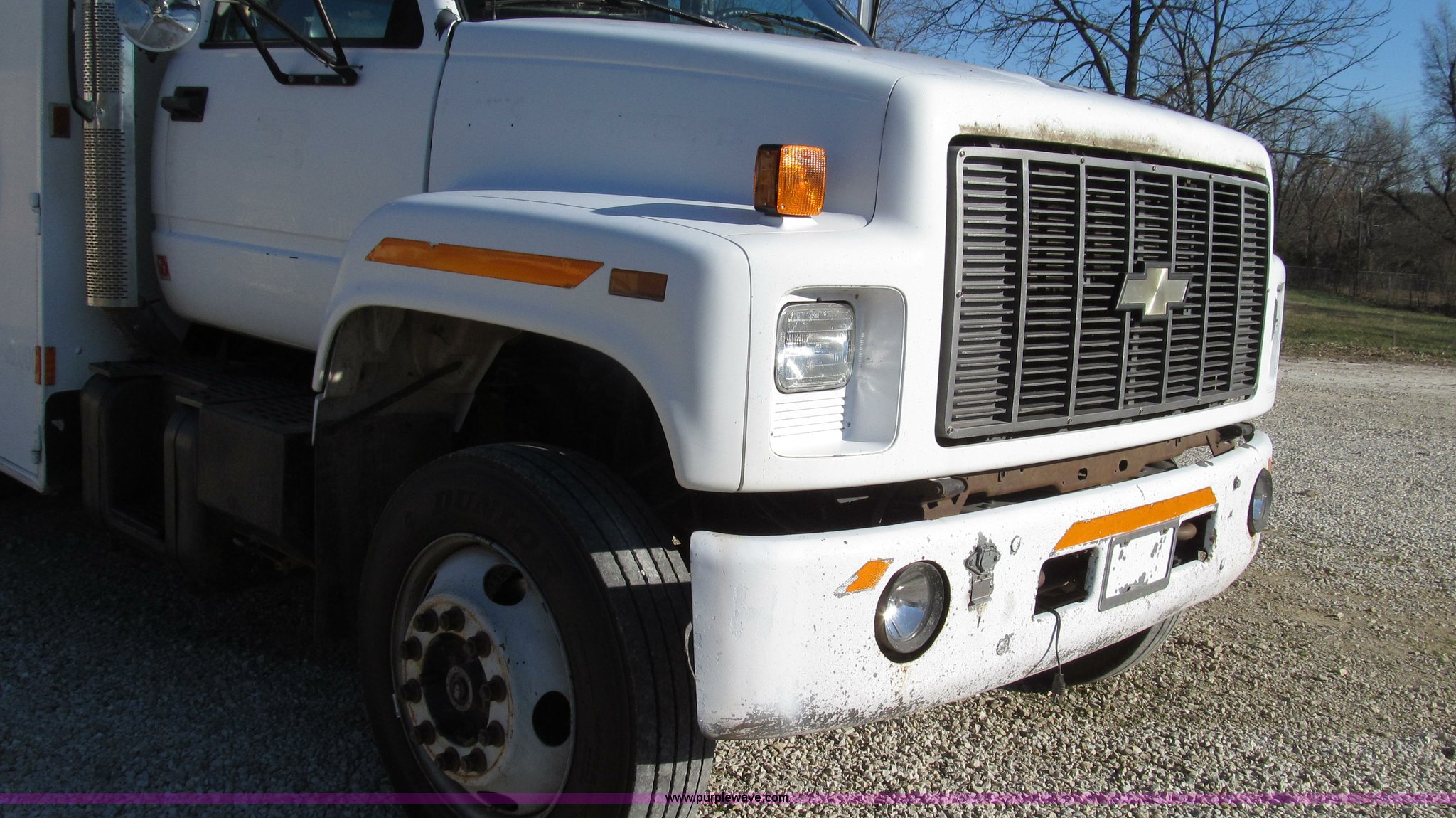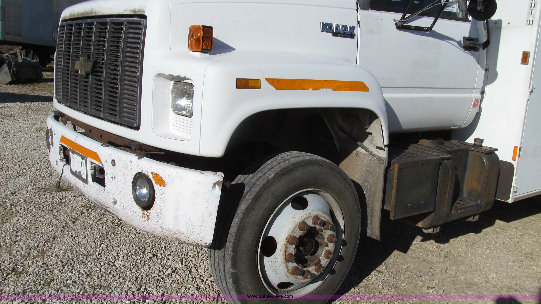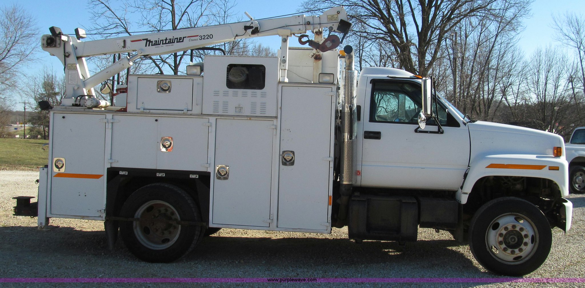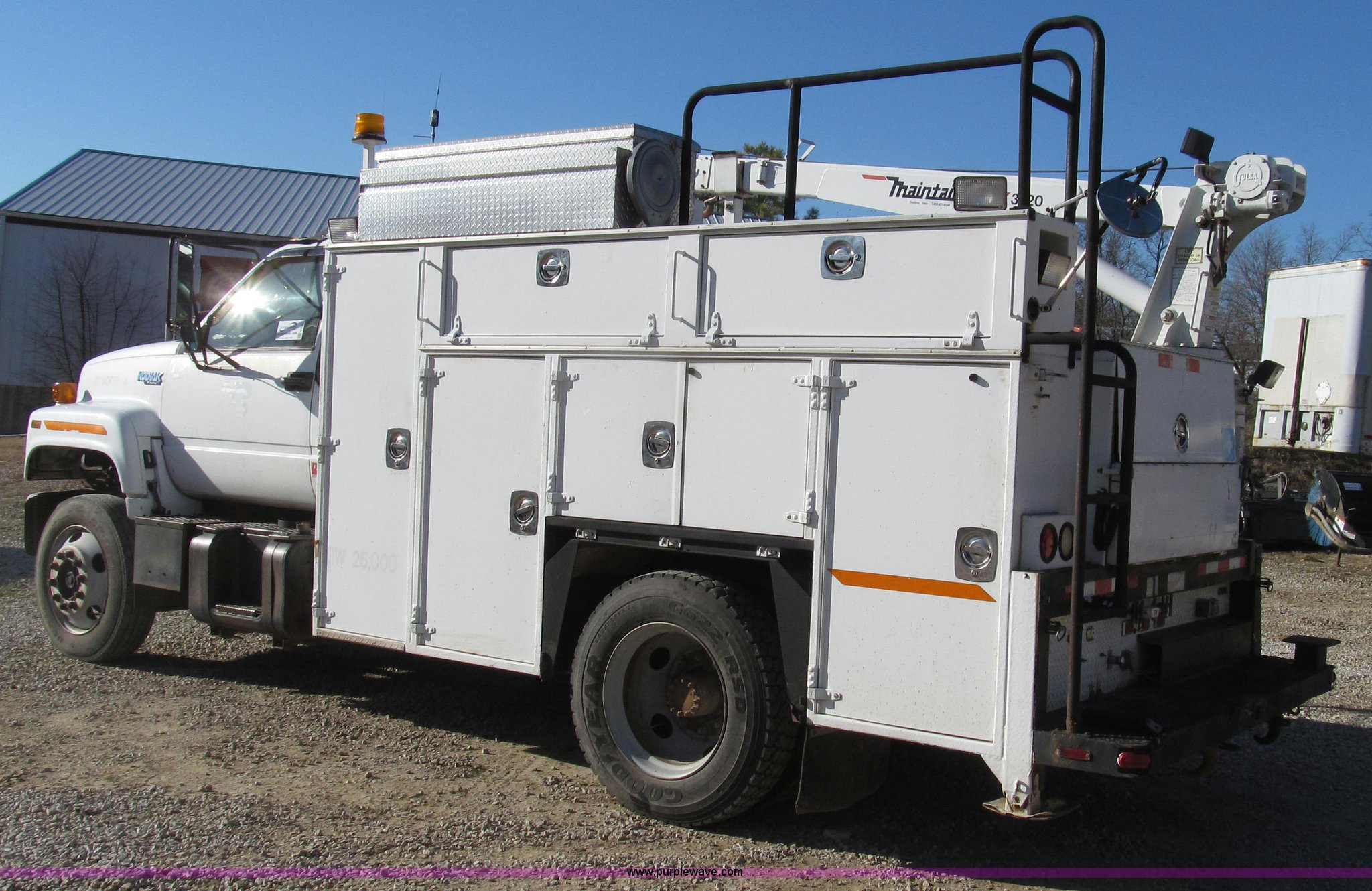Purple Wave is selling a used Service Truck in Missouri. This item is a 1996 Chevrolet Kodiak service truck with Maintainer 3220 service crane with the following: 289,322 miles on odometer, 12,838 hours on meter, 1,341 PTO hours, Caterpillar 3126 diesel engine, Five speed manual transmission, Two speed rear end, AC and heat, Air suspension seat, Maintainer service body, 12'L x 94"W, Side storage compartments, Roll-out trays, Slide out welder rack, Hydraulic equipped, Roll cover center storage area, Hydraulic equipped, Non-skid surface, Maintainer 3220 service crane, Electric over hydraulic, 10,000 lbs capacity, Hand and remote controls, Two cylinder hydraulic driven air compressor, Hose reels, Auxiliary top mounted storage boxes, Amber emergency lights, Backup cameras, In-cab monitors,, Dual 50 gallon fuel tanks, Front and rear tow hooks, Block heater, Trailer wiring, Receiver hitch, Spring suspension, Hydraulic brakes, 265/75R22.5 tires