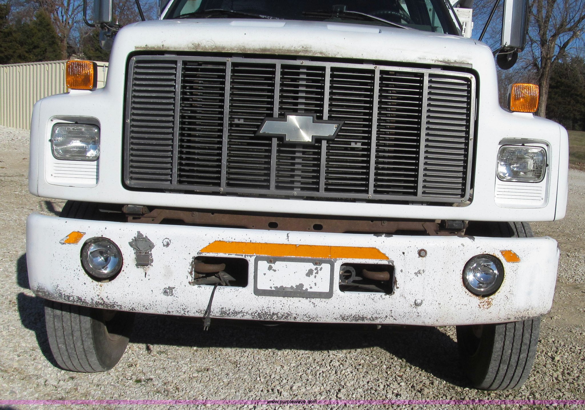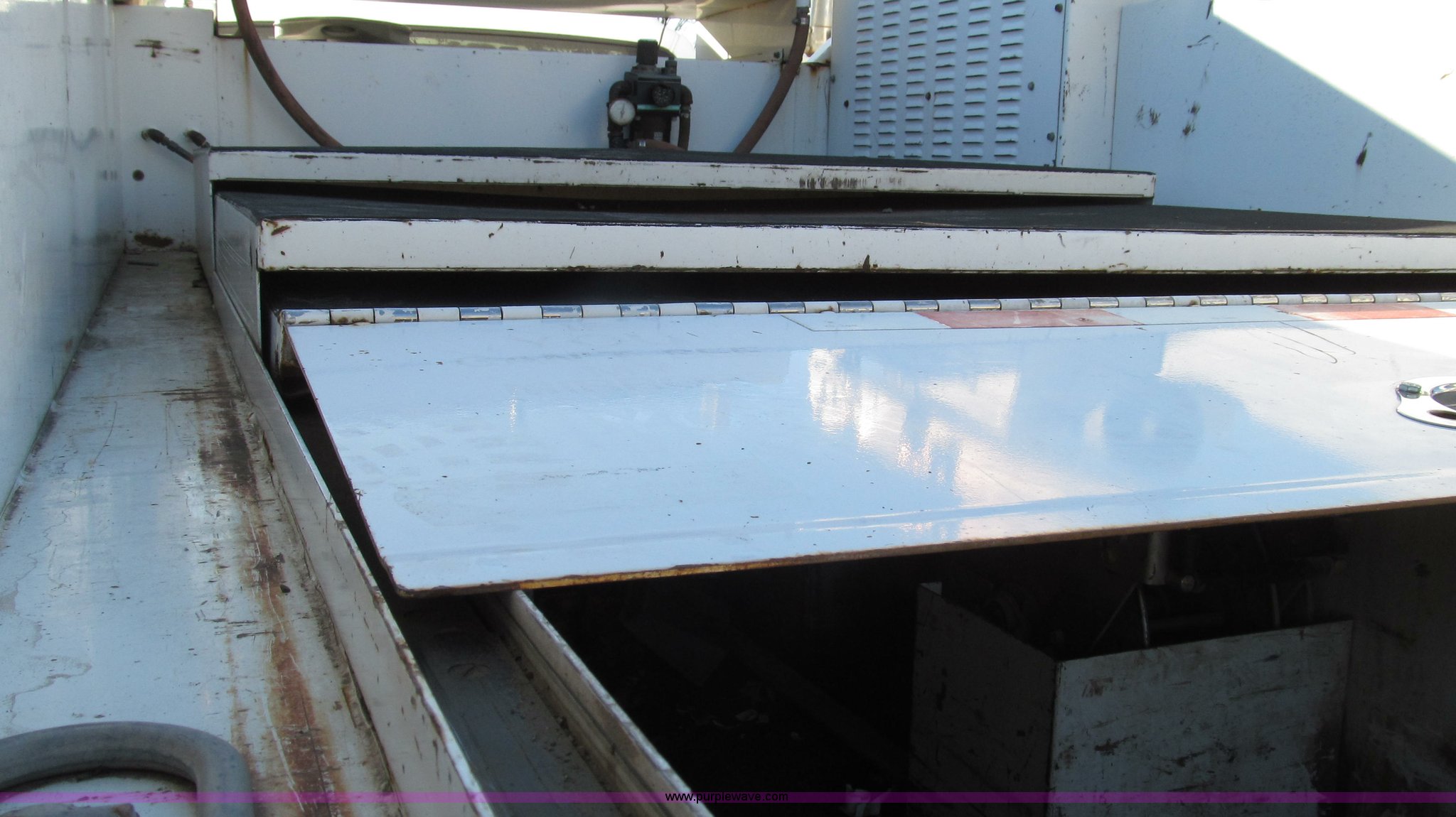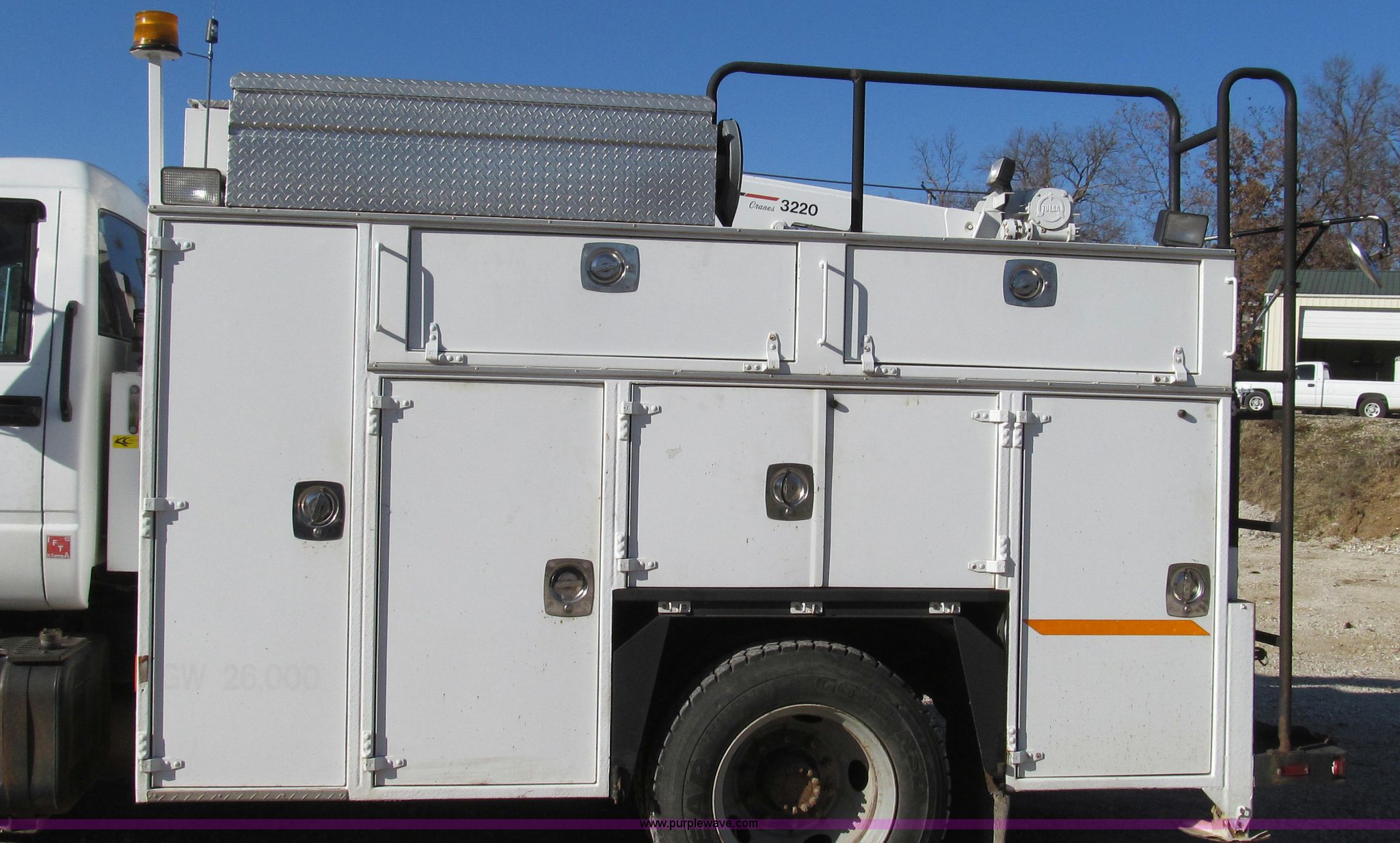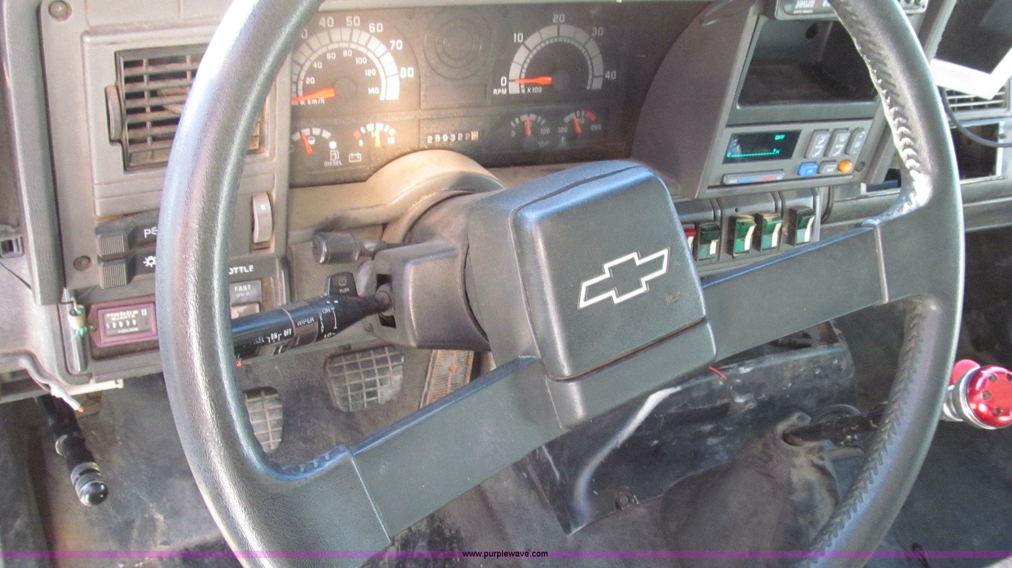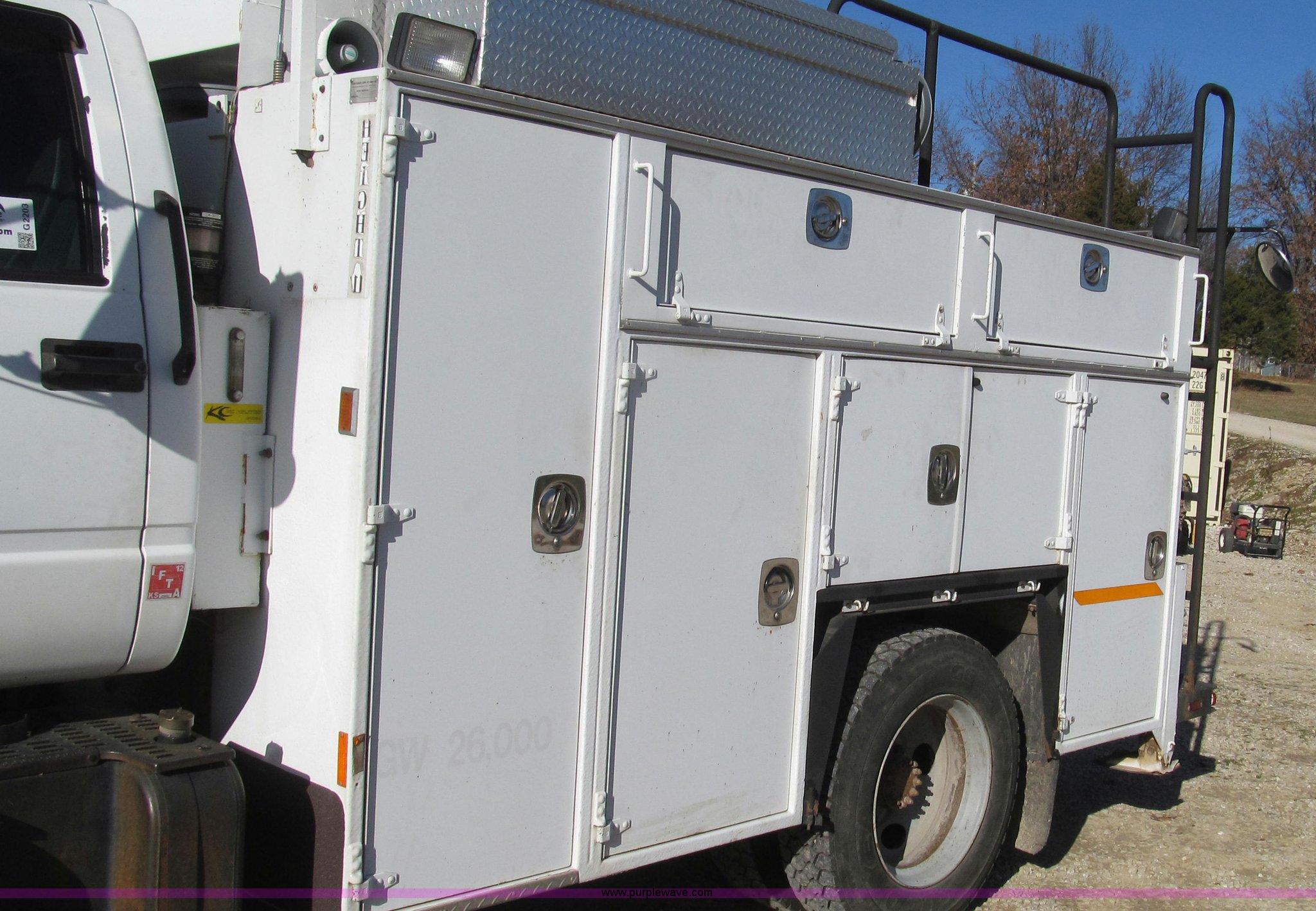 Purple Wave is selling a used Service Truck in Missouri. This item is a 1996 Chevrolet Kodiak service truck with Maintainer 3220 service crane with the following: 289,322 miles on odometer, 12,838 hours on meter, 1,341 PTO hours, Caterpillar 3126 diesel engine, Five speed manual transmission, Two speed rear end, AC and heat, Air suspension seat, Maintainer service body, 12'L x 94"W, Side storage compartments, Roll-out trays, Slide out welder rack, Hydraulic equipped, Roll cover center storage area, Hydraulic equipped, Non-skid surface, Maintainer 3220 service crane, Electric over hydraulic, 10,000 lbs capacity, Hand and remote controls, Two cylinder hydraulic driven air compressor, Hose reels, Auxiliary top mounted storage boxes, Amber emergency lights, Backup cameras, In-cab monitors,, Dual 50 gallon fuel tanks, Front and rear tow hooks, Block heater, Trailer wiring, Receiver hitch, Spring suspension, Hydraulic brakes, 265/75R22.5 tires