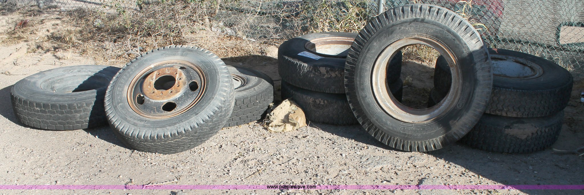 (8) tires. (3) 10 hole wheels with 10.00R20 tires, (5) wheels with 10.00R20 tires. West Construction. 2836 Clovis Rd. Lubbock, TX 79415