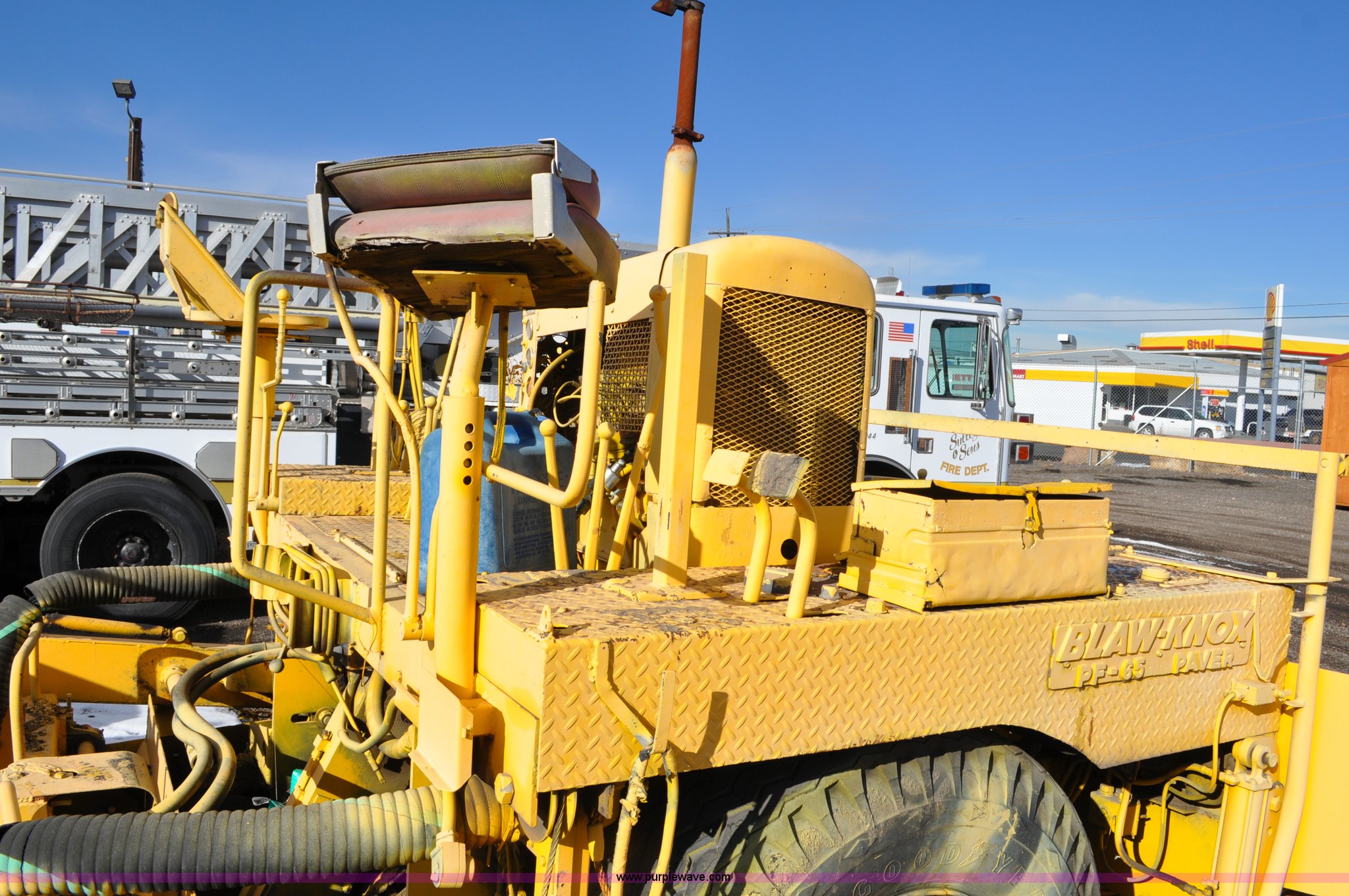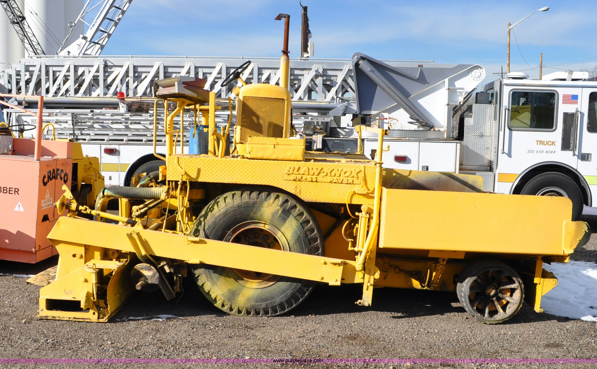 Blaw Knox PF65 wheel mounted asphalt paver. Four cylinder gas engine, Kerosene fired, 8' to 12' paving width, 14.00x20 tires, 16,400 lbs. base operating weight, Machine not operated for inspection, Engine will fire, Gas tank is contaminated, Serial 0421022. 700 N Main St. Brighton, CO 80601