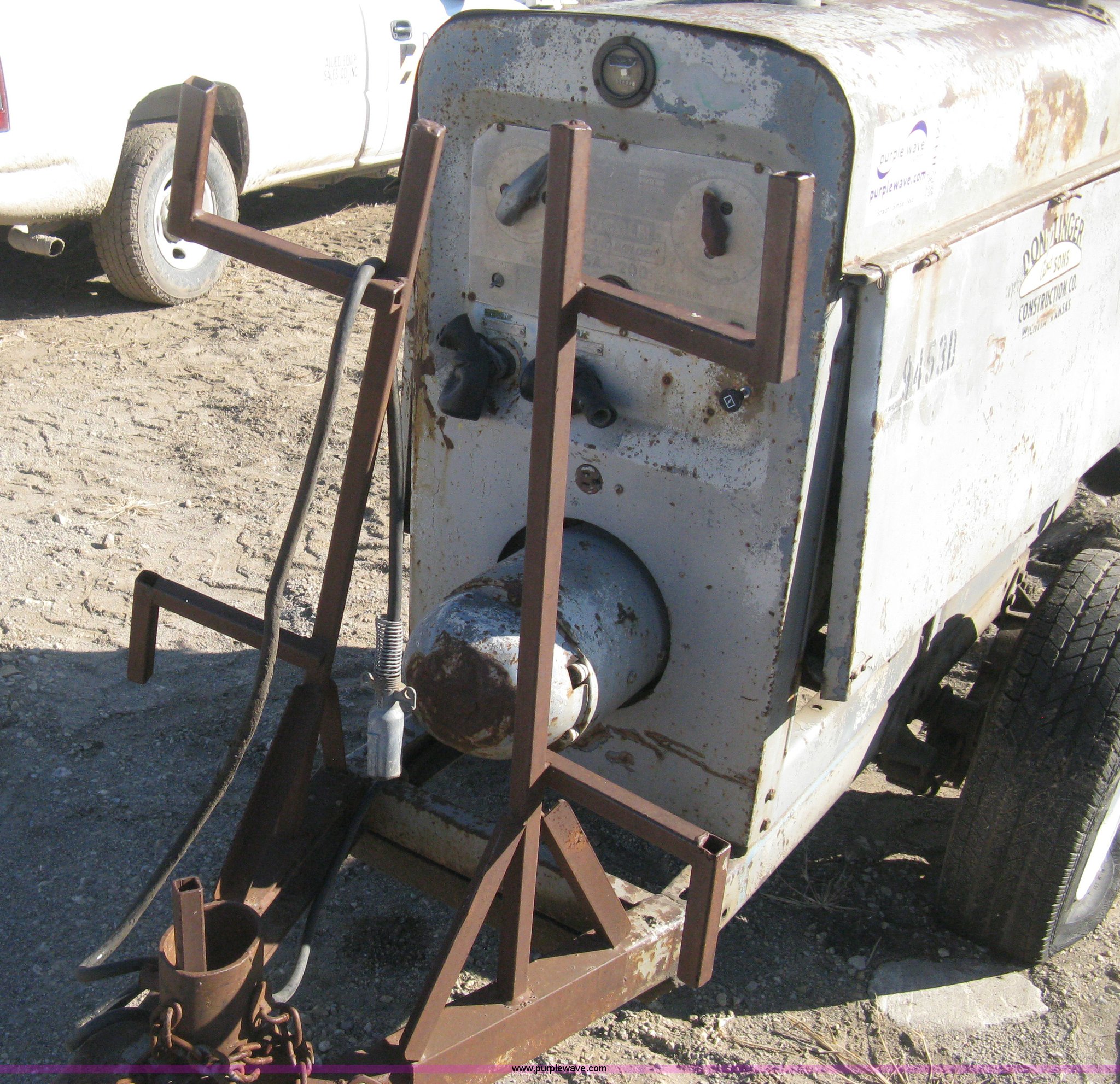 Purple Wave is selling a used Welder (Manual) in Kansas. This item is a Lincoln SA-200-F-163 arc welder with the following: 1,130 hours on meter, Grindstaff four cylinder flat head gas engine, Pin hitch, Five lug, 15" wheels, Missing lug nuts, Unknown operating condition, Serial A722889, Unit# 9453D
