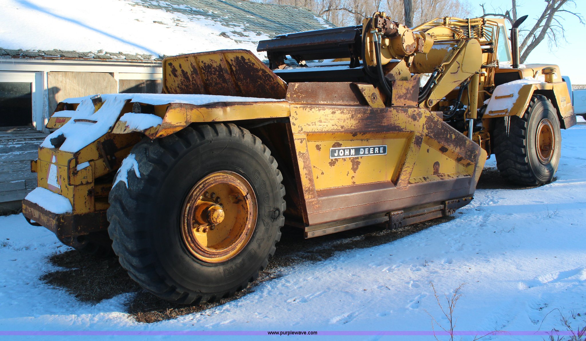 Purple Wave is selling a used Conventional Scraper in Kansas. This item is a 1978 John Deere 762 scraper with the following: 9,748 hours on meter, John Deere six cylinder turbo diesel engine, 195 HP, Powershift transmission, 5F-1R gears, Enclosed cab, Heat, 11 cubic yard capacity, 72 gallon fuel tank, 23.5R25 tires, 34,450 lbs. base operating weight, Parts and owner's manuals, Serial 002357T