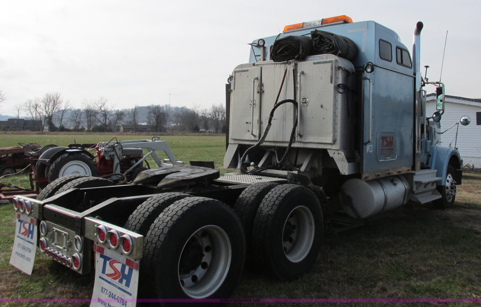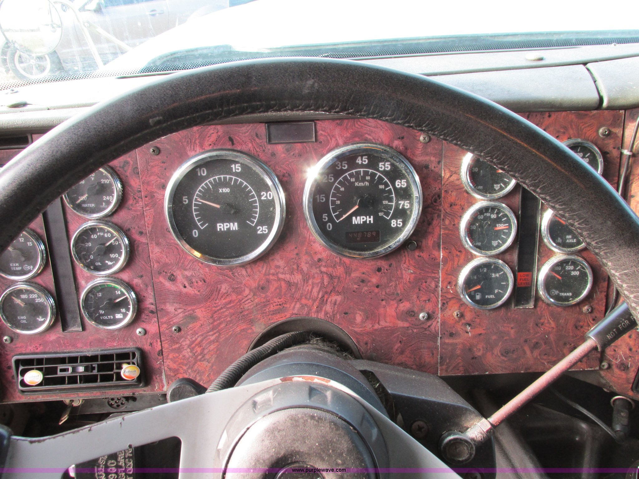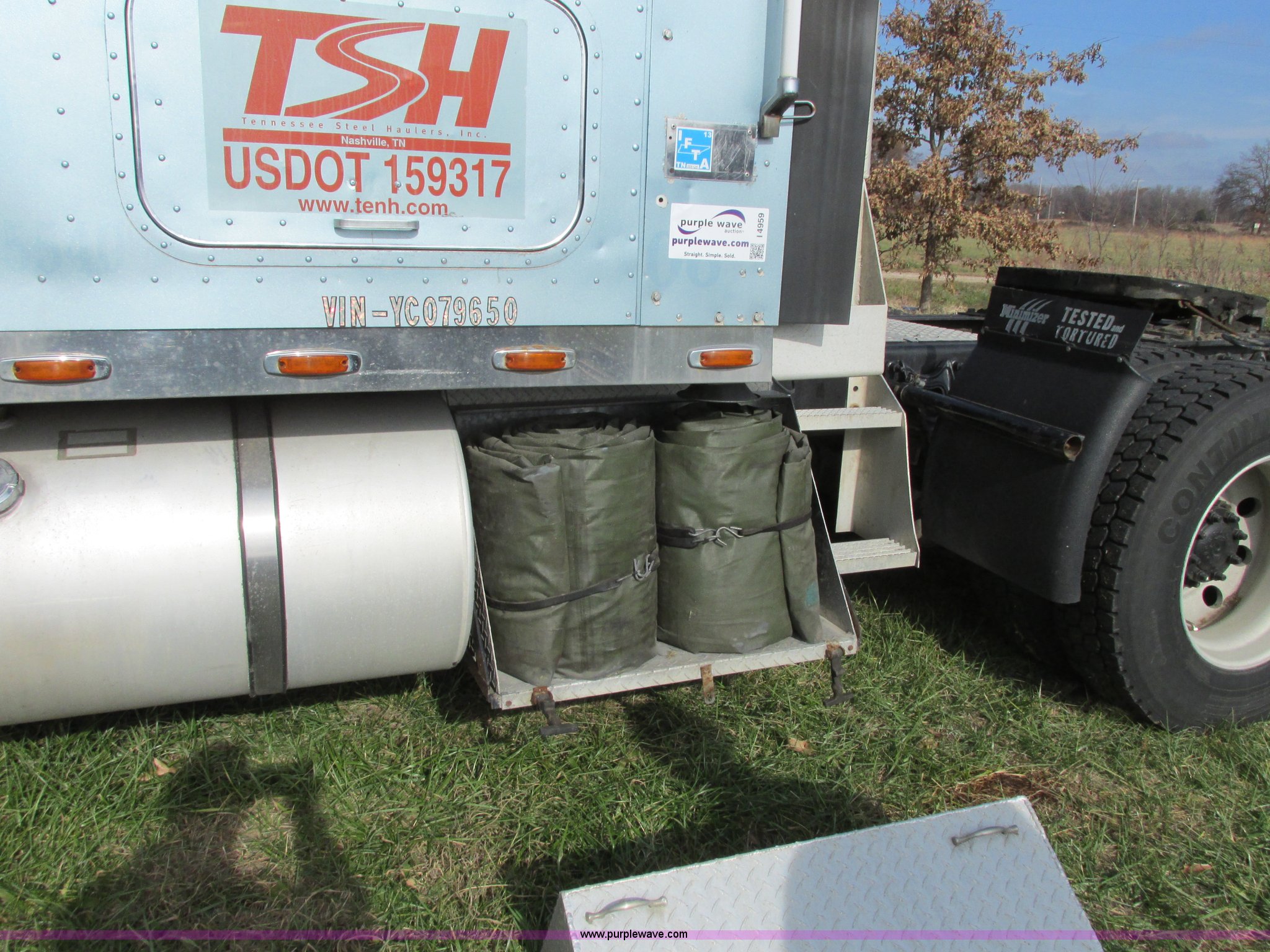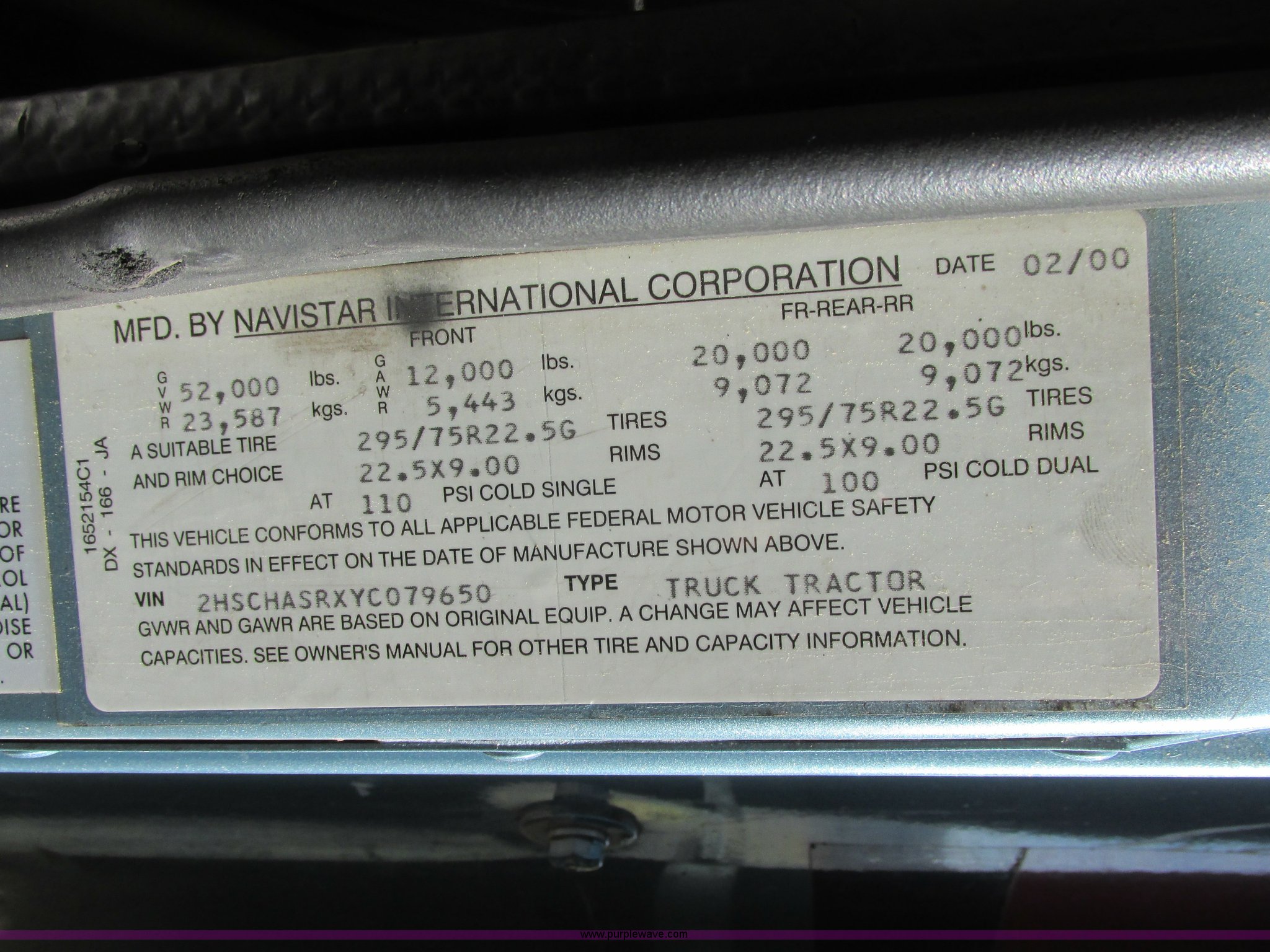 Purple Wave is selling a used Truck Tractor in Oklahoma. This item is a 2000 International 9900i Eagle semi truck with the following: 448,789 miles on odometer, Caterpillar C15 14.6L L6 diesel engine, 10 speed manual transmission, Twin screw, AC and heat, Tilt, Cruise, AM/FM/XM/cassette, Passenger daylight door, Telescoping steering wheel, Air suspension seats, Power windows and mirrors, Heated mirrors, Air ride cab, CB radio, Fog lights, Pro Eagle sleeper, 68 x 77, Storage, Sink, 16 gallon water tank, Refrigerator/freezer, 3,500 watt power inverter, 13" TV/DVD combo, Electric wired, AC, Headache rack, Storage, Chain hanger, Visor, Chrome bumper, Dual 110 gallon fuel tanks, Dual front exhaust stacks, Aluminum deck plate, Stainless steel quarter fenders, Side and rear LED lights, Air ride dump, Spring loader fender, Dump valve switch, (4) work lights, Front strobe light, Toolbox for tarps, No tarps included, Air suspension, Air brakes, Aluminum wheels, 250" wheelbase, 275/80R22.5 tires, GVWR 52,000 lbs, FAWR 12,000 lbs, IAWR 20,000 lbs, RAWR 20,000 lbs, Service records available