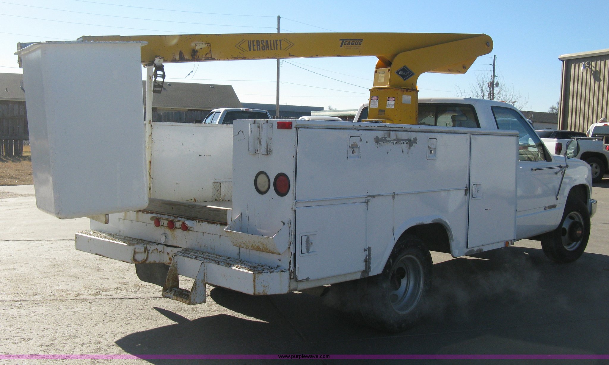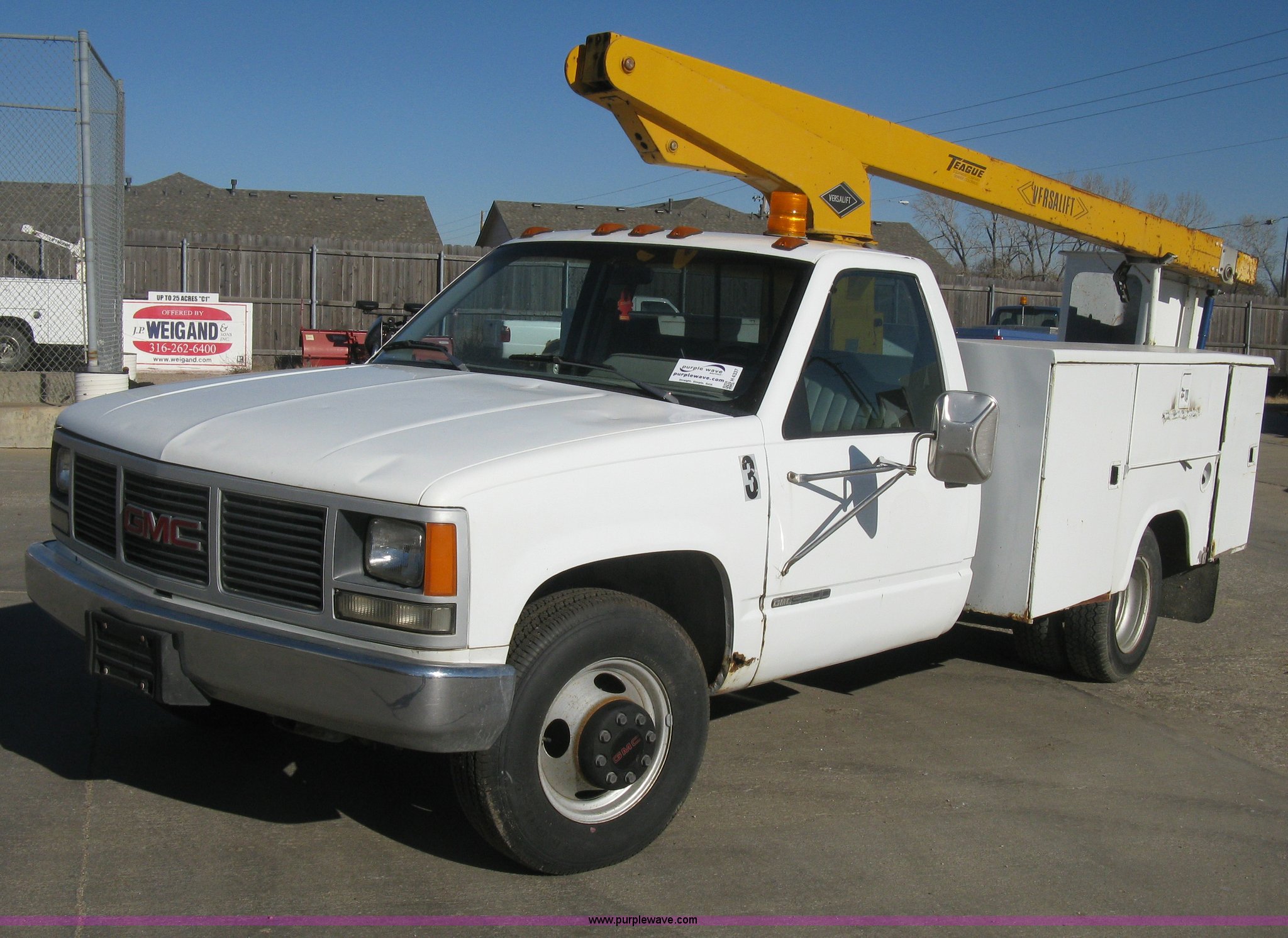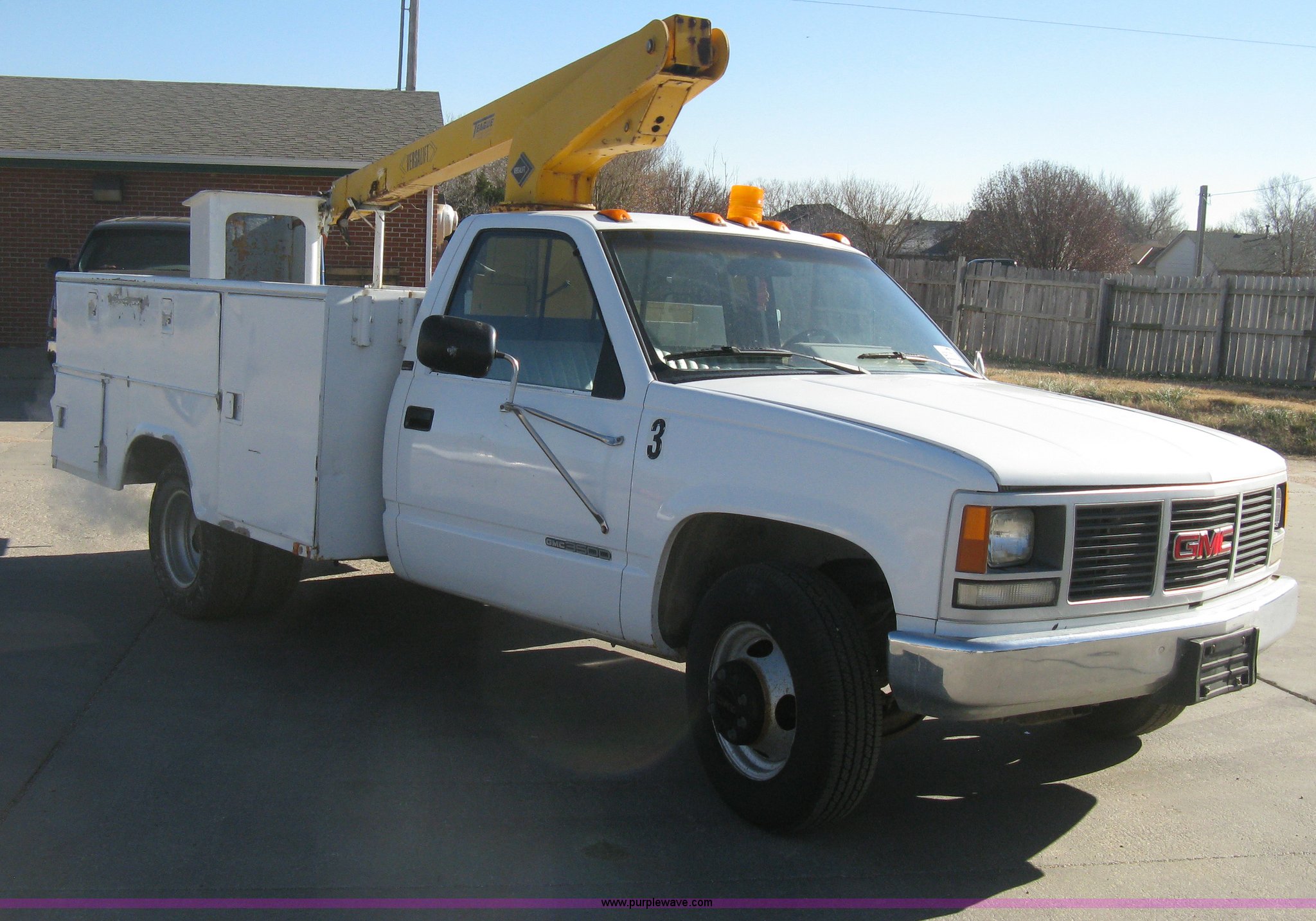 Purple Wave is selling a used Service Truck in Kansas. This item is a 1991 GMC Sierra 3500 SL utility bucket truck with the following: 91,784 miles on odometer, 5.7L V8 OHV 16V gas engine, Automatic transmission, Heat, Manual windows and locks, Vinyl interior, 9'L x 88"W utility bed, 1990 Vesalift telescoping bucket lift, Model TEL28G, 28' platform height, 300 lbs max bucket capacity, Onan gas engine, Electric over hydraulic hoist, Serial 590203, LT215/85R16 tires, Rust damage, Scratches and dents, Rust, Utility bed damaged