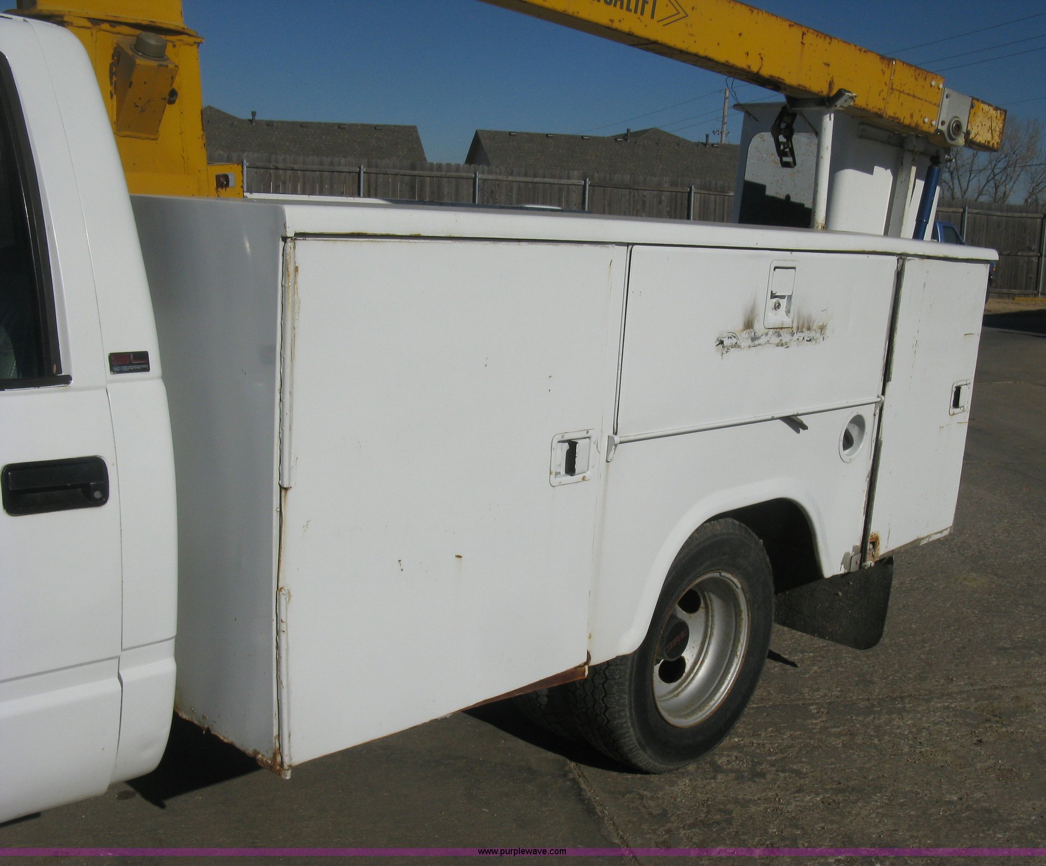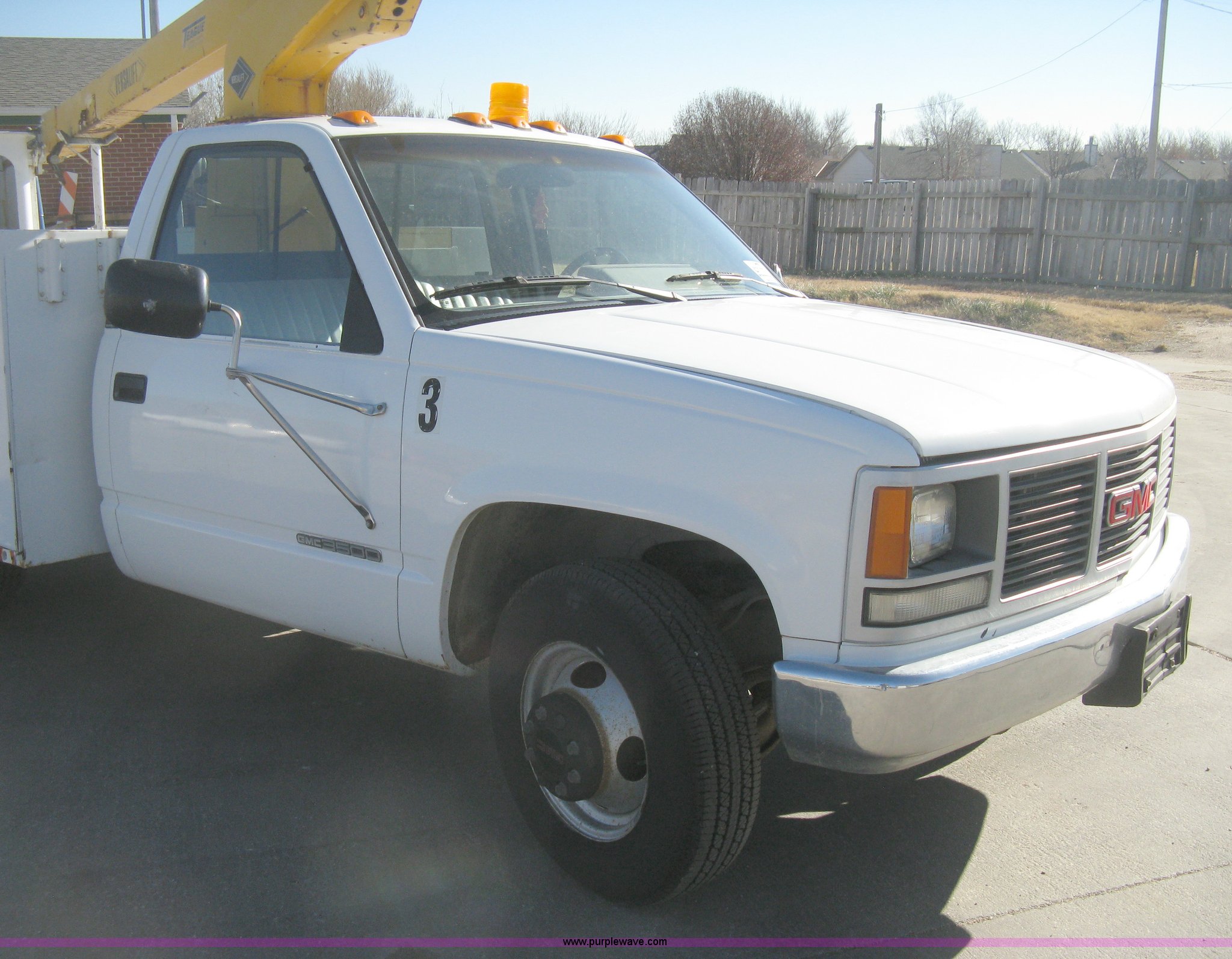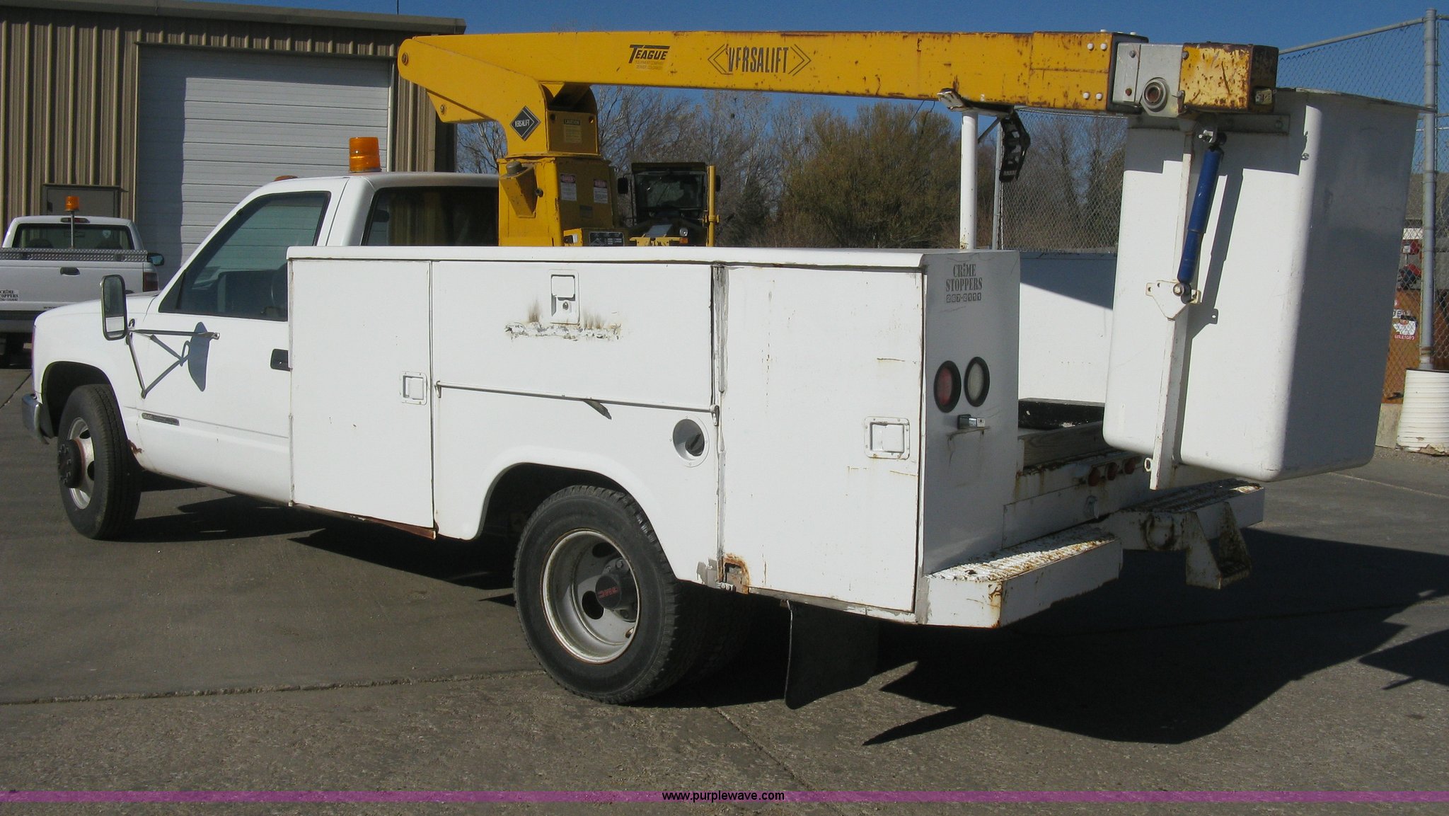 Purple Wave is selling a used Service Truck in Kansas. This item is a 1991 GMC Sierra 3500 SL utility bucket truck with the following: 91,784 miles on odometer, 5.7L V8 OHV 16V gas engine, Automatic transmission, Heat, Manual windows and locks, Vinyl interior, 9'L x 88"W utility bed, 1990 Vesalift telescoping bucket lift, Model TEL28G, 28' platform height, 300 lbs max bucket capacity, Onan gas engine, Electric over hydraulic hoist, Serial 590203, LT215/85R16 tires, Rust damage, Scratches and dents, Rust, Utility bed damaged