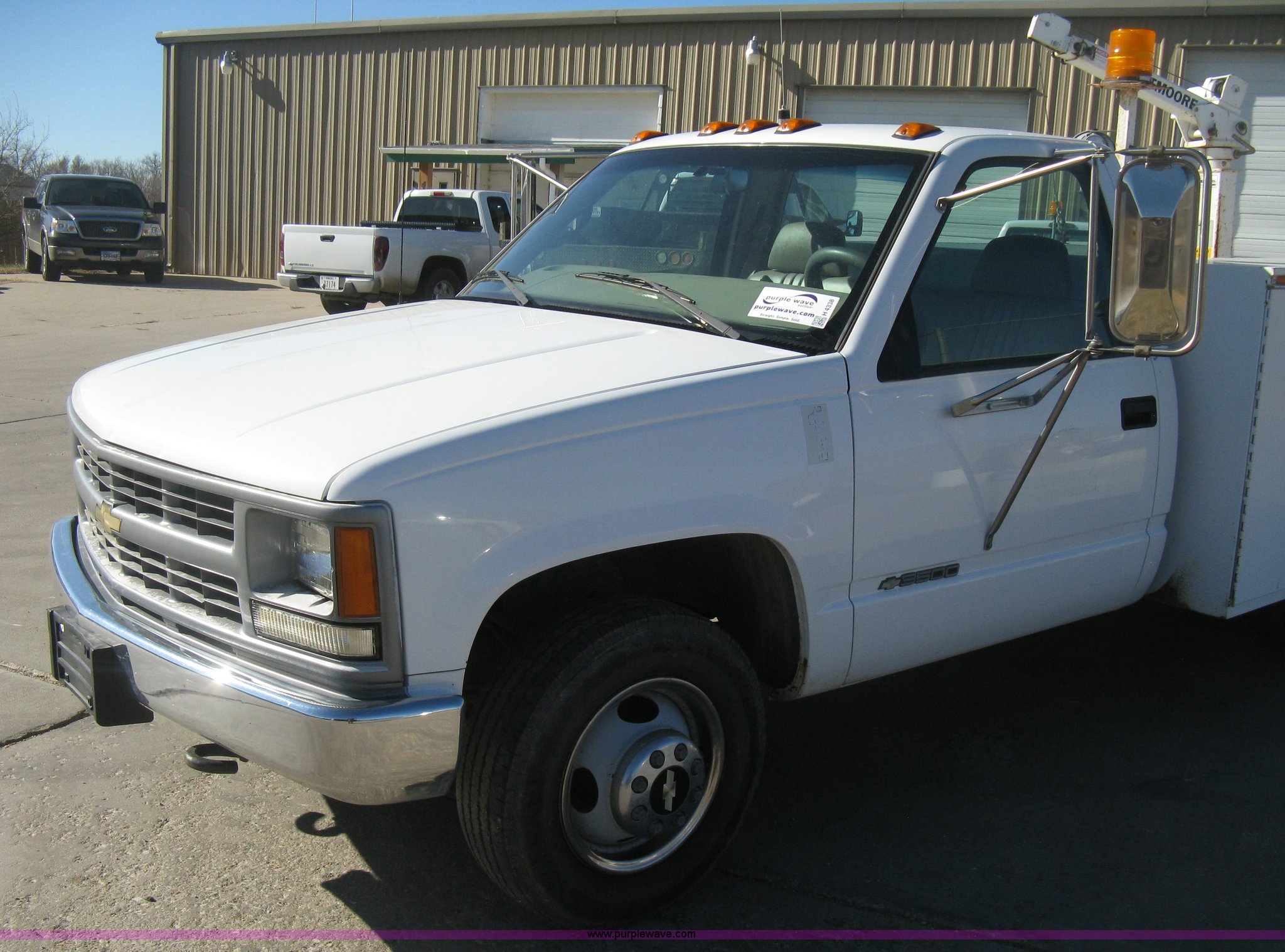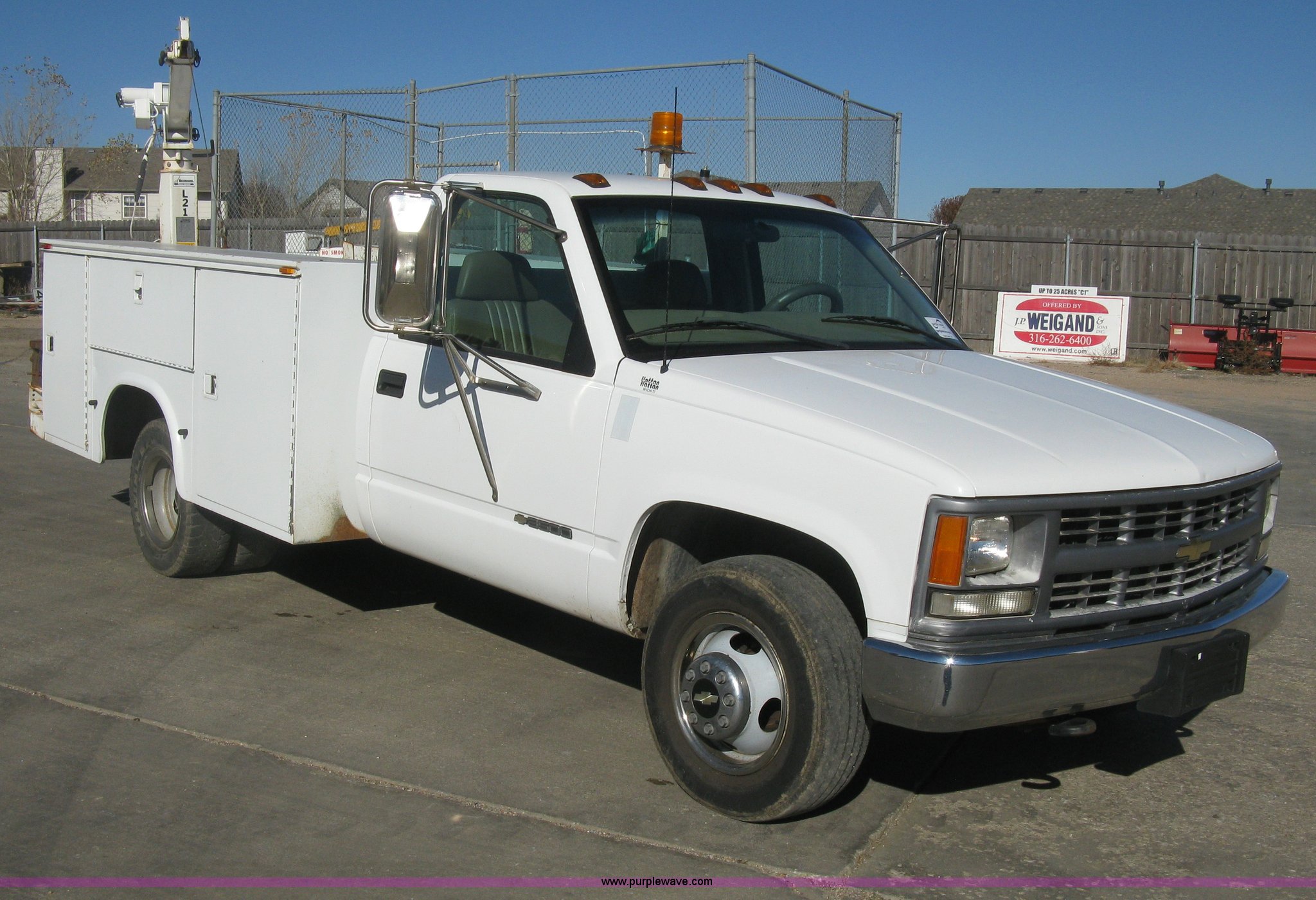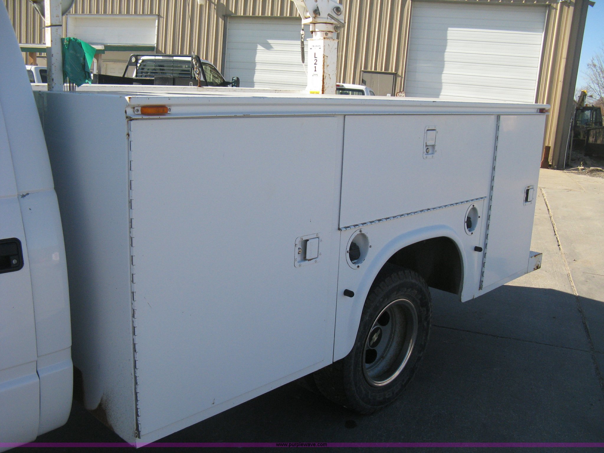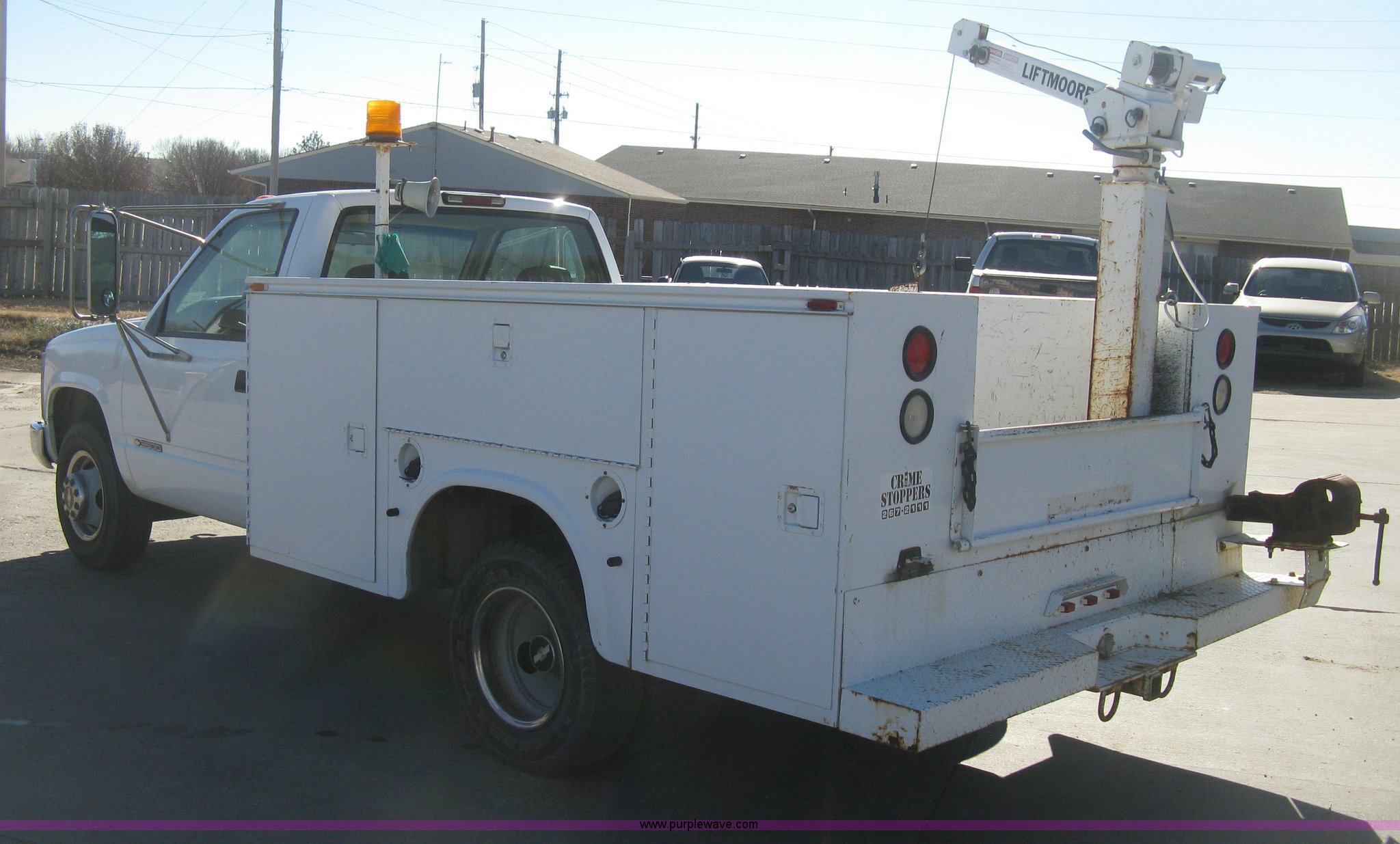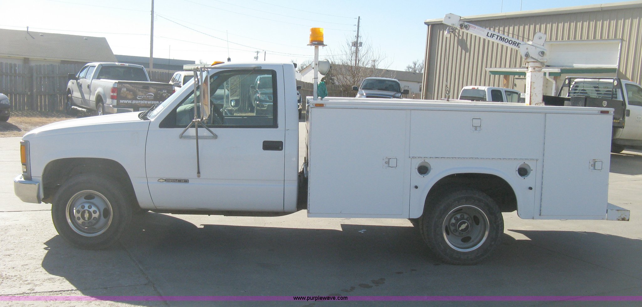 Purple Wave is selling a used Service Truck in Kansas. This item is a 1999 Chevrolet 3500 utility truck with the following: 97,534 miles on odometer, 7.4L V8 OHV 16V gas engine, Automatic transmission, AC and heat, Tilt, Cruise, AM/FM/cassette, Manual windows and locks, Vinyl interior, Electric trailer brake booster, Knapheide utility bed, Approx. 9'L x 89"W, Step up bumper, Bumper mounted vise, (6) side tool compartments, Diamond plate floor, Lift Moore L21 telescoping crane, Tethered remote, 2,000 lbs capacity block/hook, Serial P965R11,, Dual fuel tanks, Receiver hitch, Trailer wiring, LT225/75R16 tires, Scratches and dents, Paint peeling