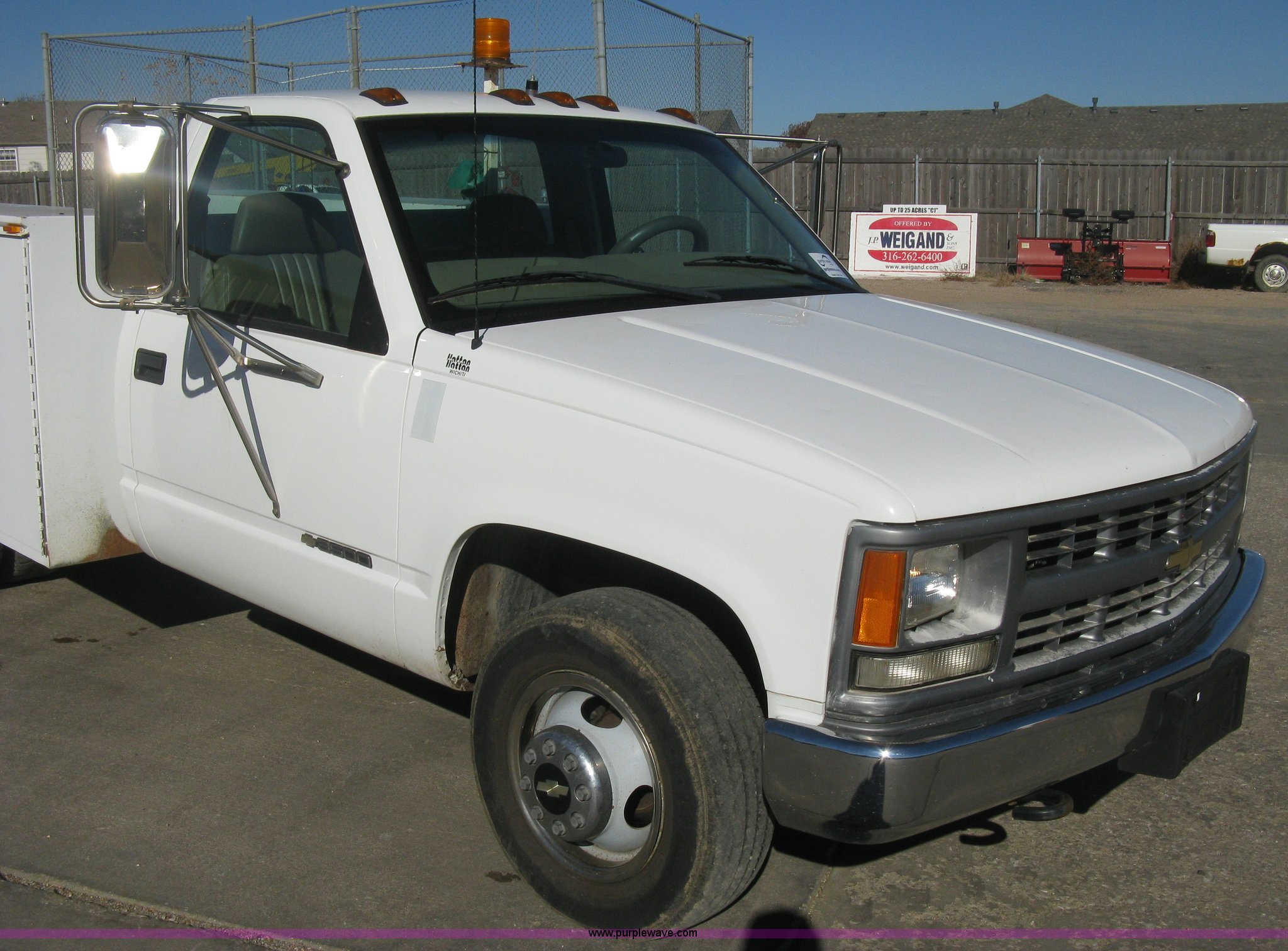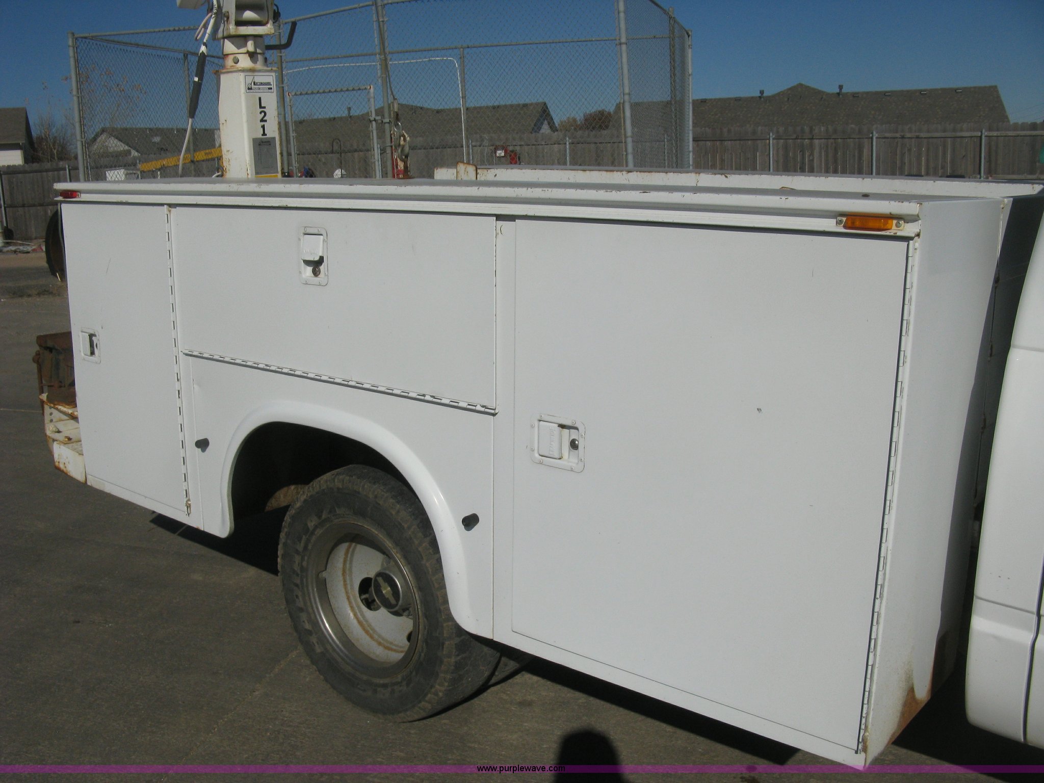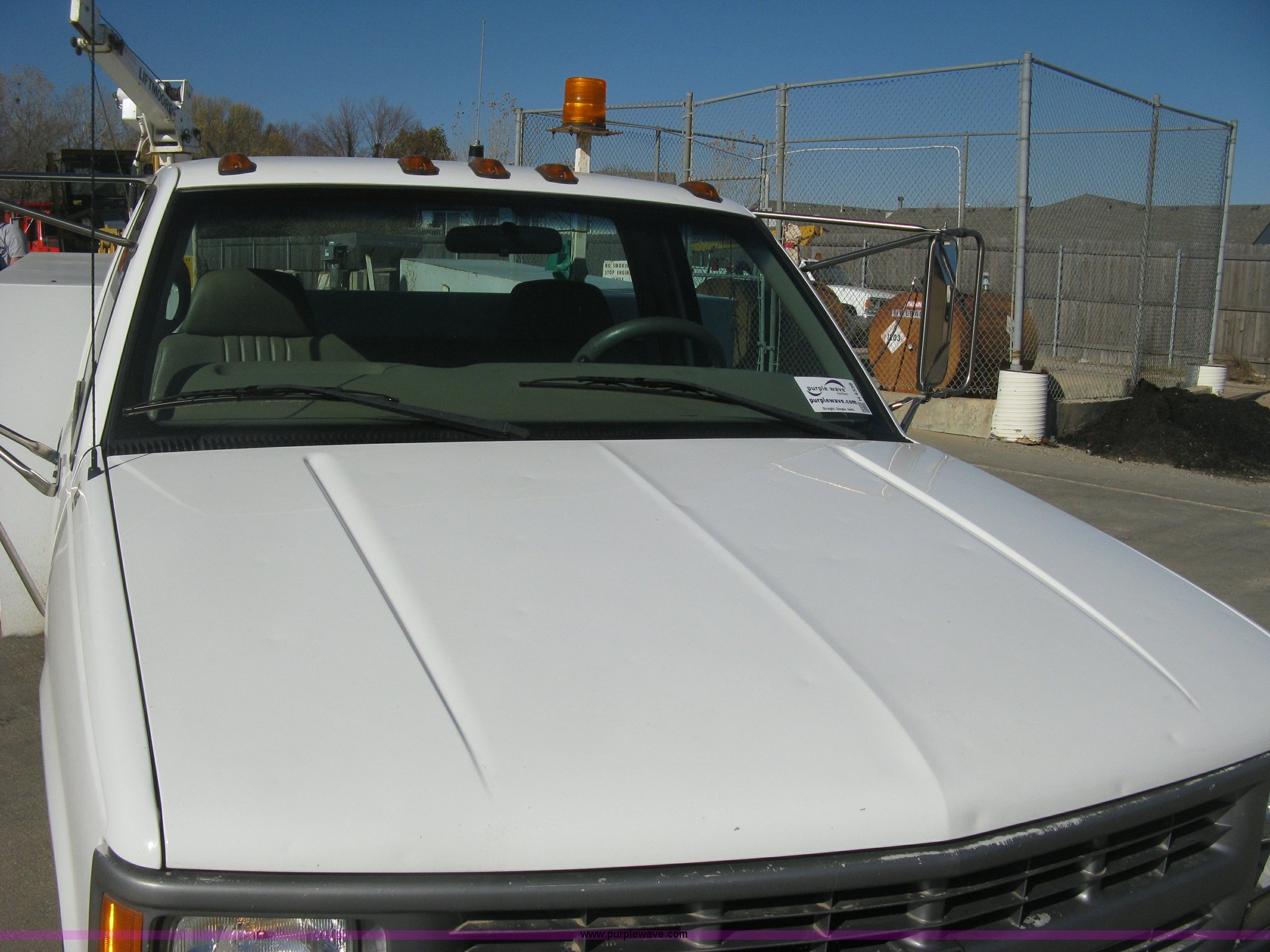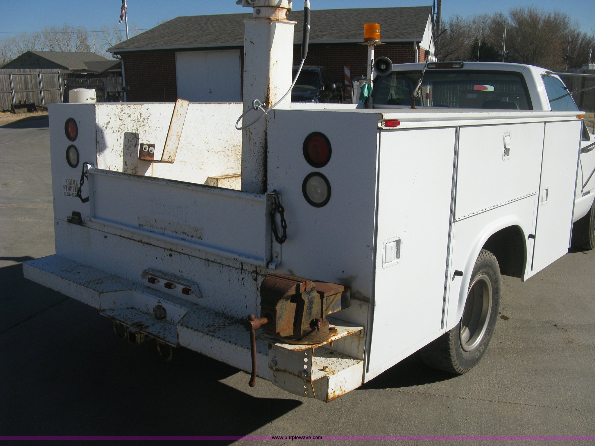 Purple Wave is selling a used Service Truck in Kansas. This item is a 1999 Chevrolet 3500 utility truck with the following: 97,534 miles on odometer, 7.4L V8 OHV 16V gas engine, Automatic transmission, AC and heat, Tilt, Cruise, AM/FM/cassette, Manual windows and locks, Vinyl interior, Electric trailer brake booster, Knapheide utility bed, Approx. 9'L x 89"W, Step up bumper, Bumper mounted vise, (6) side tool compartments, Diamond plate floor, Lift Moore L21 telescoping crane, Tethered remote, 2,000 lbs capacity block/hook, Serial P965R11,, Dual fuel tanks, Receiver hitch, Trailer wiring, LT225/75R16 tires, Scratches and dents, Paint peeling