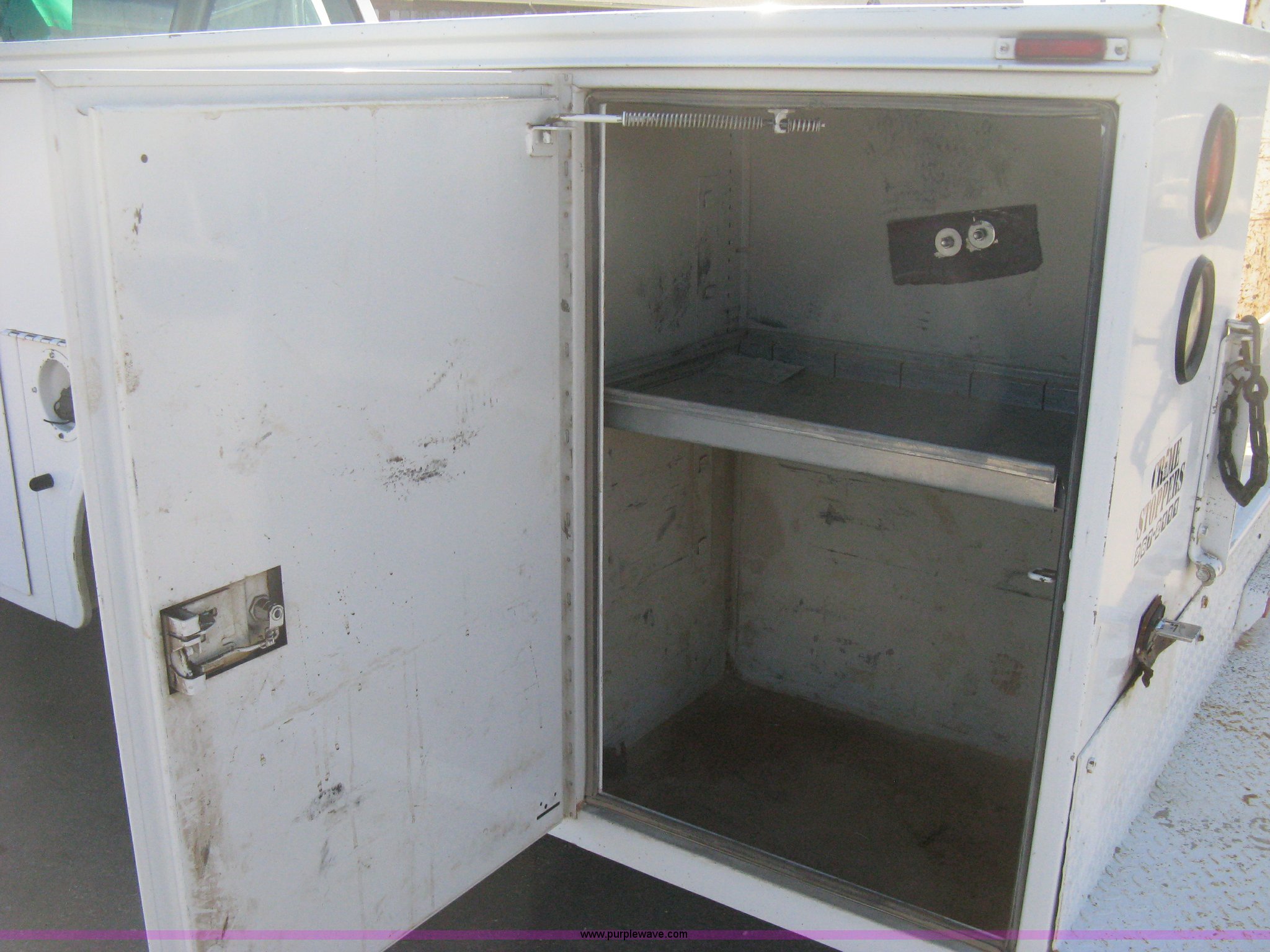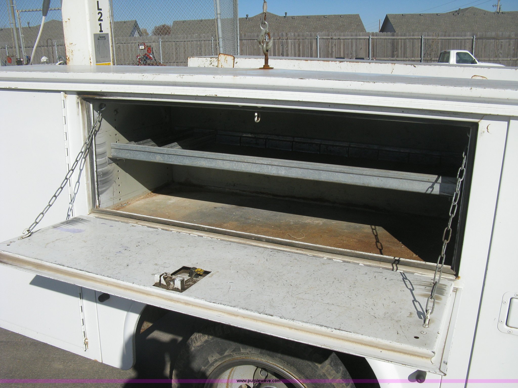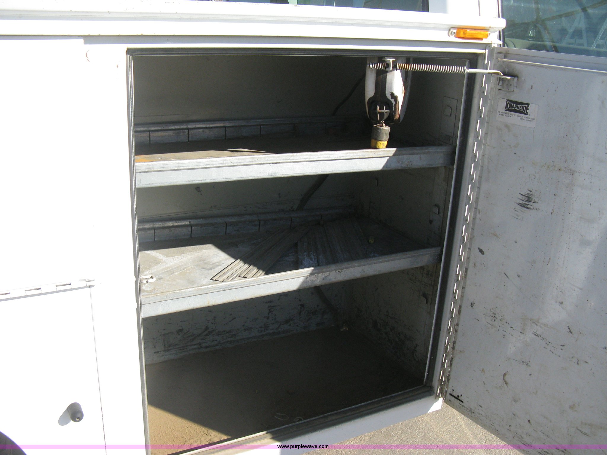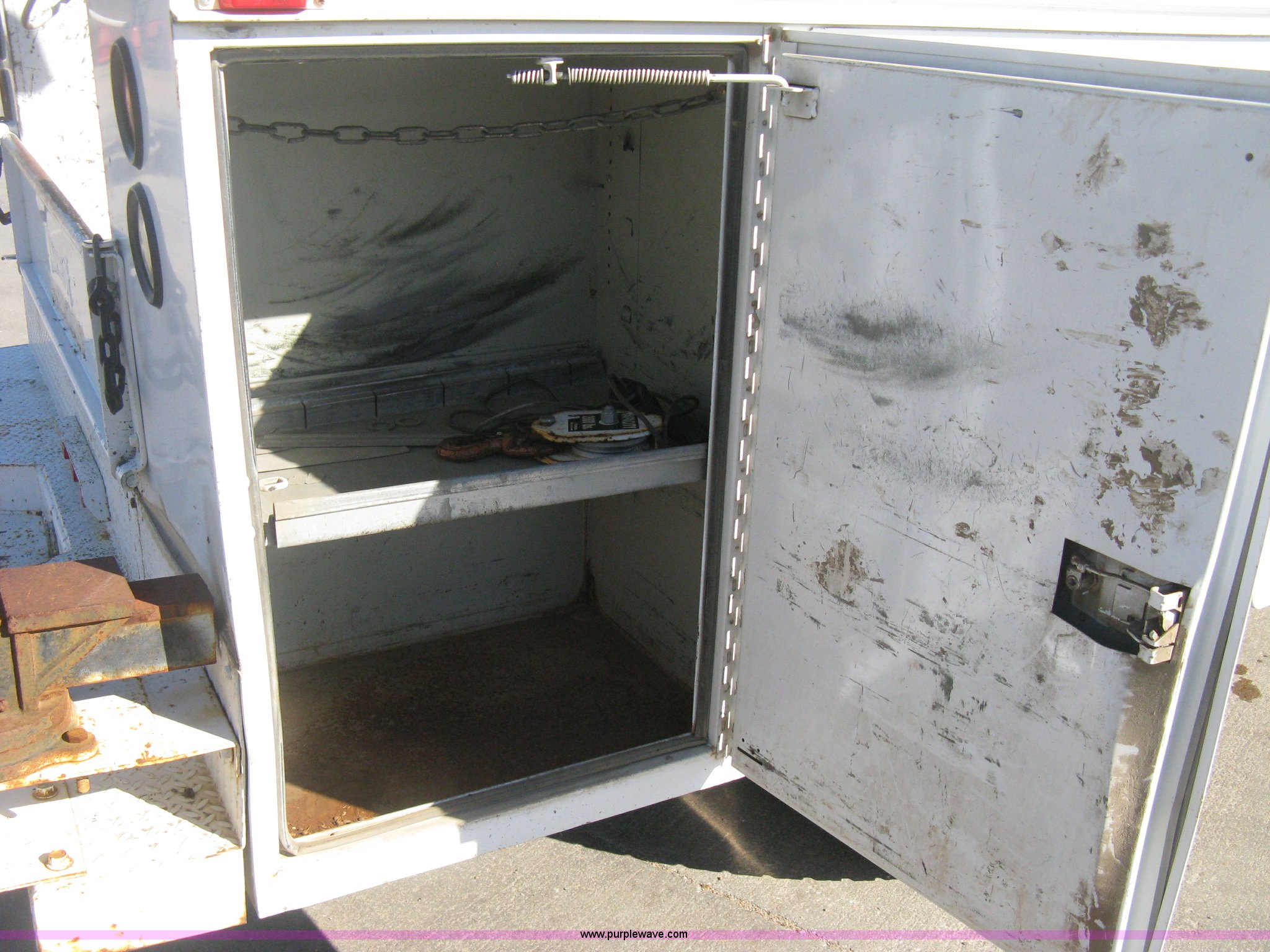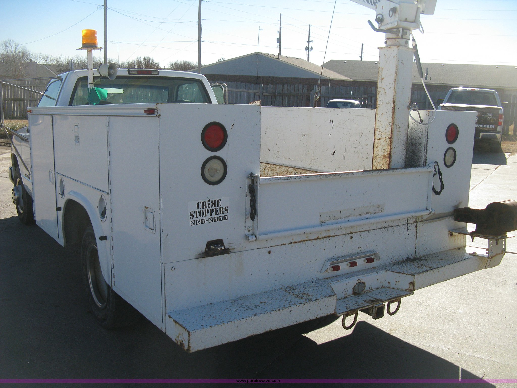 Purple Wave is selling a used Service Truck in Kansas. This item is a 1999 Chevrolet 3500 utility truck with the following: 97,534 miles on odometer, 7.4L V8 OHV 16V gas engine, Automatic transmission, AC and heat, Tilt, Cruise, AM/FM/cassette, Manual windows and locks, Vinyl interior, Electric trailer brake booster, Knapheide utility bed, Approx. 9'L x 89"W, Step up bumper, Bumper mounted vise, (6) side tool compartments, Diamond plate floor, Lift Moore L21 telescoping crane, Tethered remote, 2,000 lbs capacity block/hook, Serial P965R11,, Dual fuel tanks, Receiver hitch, Trailer wiring, LT225/75R16 tires, Scratches and dents, Paint peeling