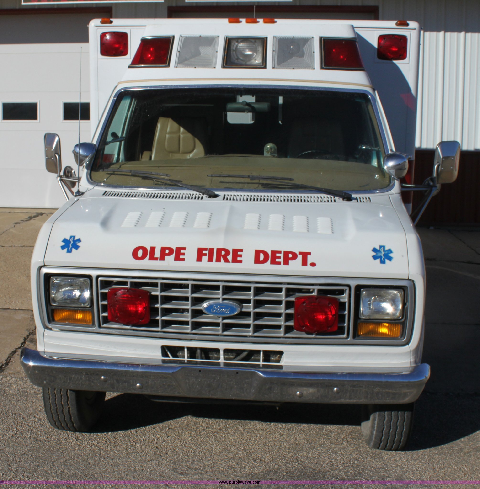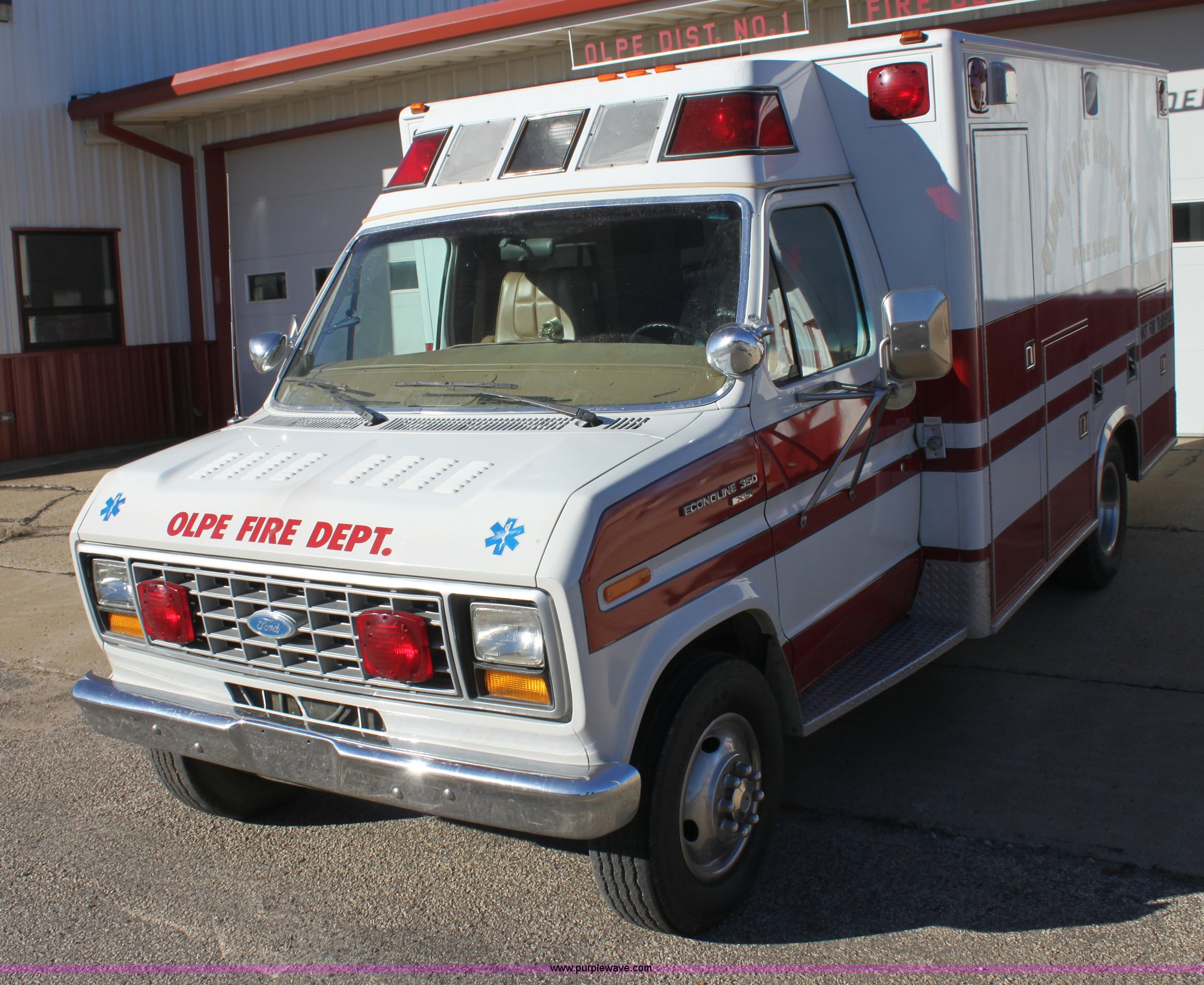 1985 Ford Econoline E350 ambulance. 8,715 miles on odometer, 460 C.I.D. V8 gas engine, Automatic transmission, AC and heat, Manual windows, Emergency lights and siren, 215/85R16 tires. 1FDKE30L5FHB64999. Shipping quotes available. Olpe Fire. Olpe, KS 66865