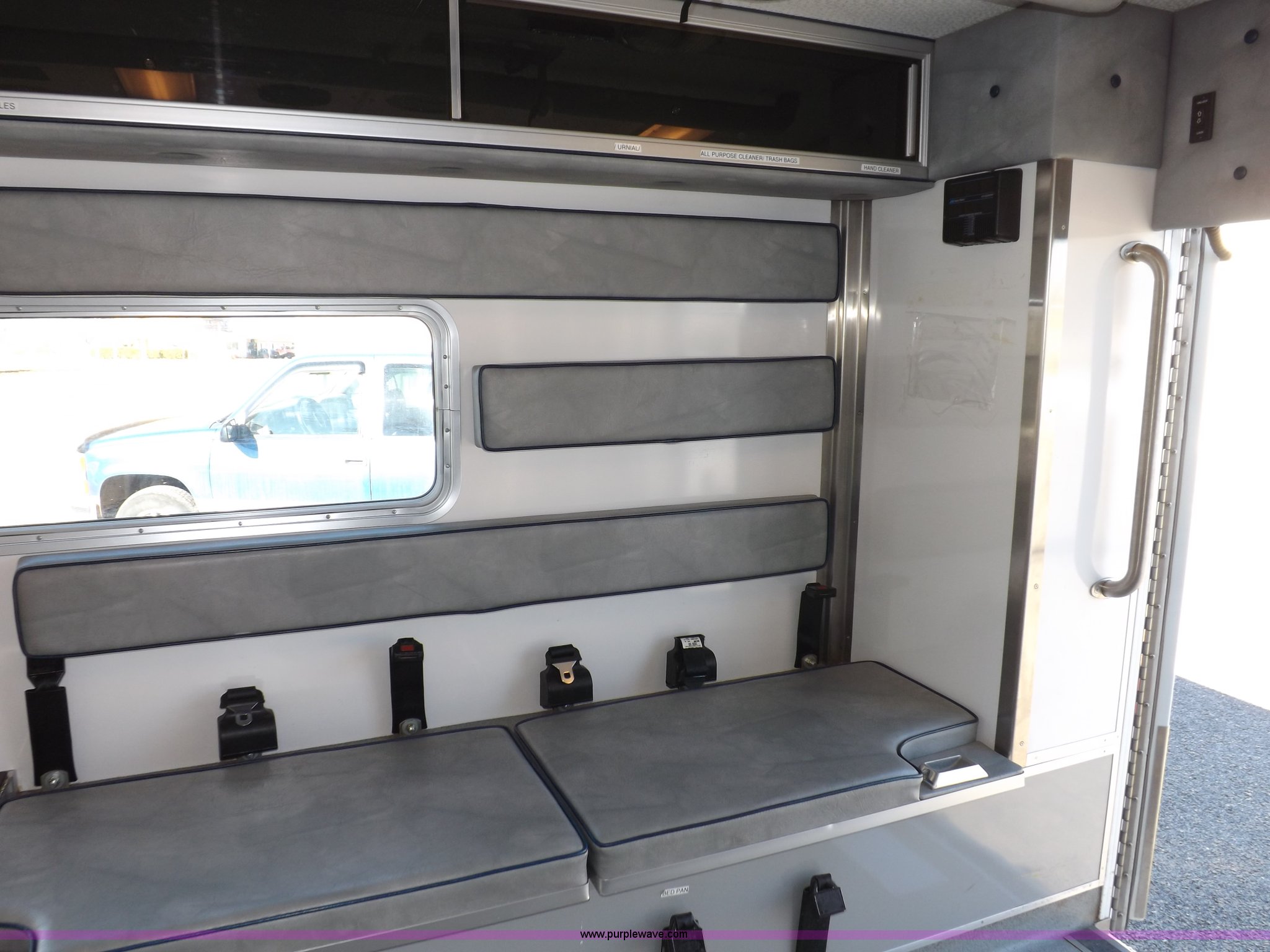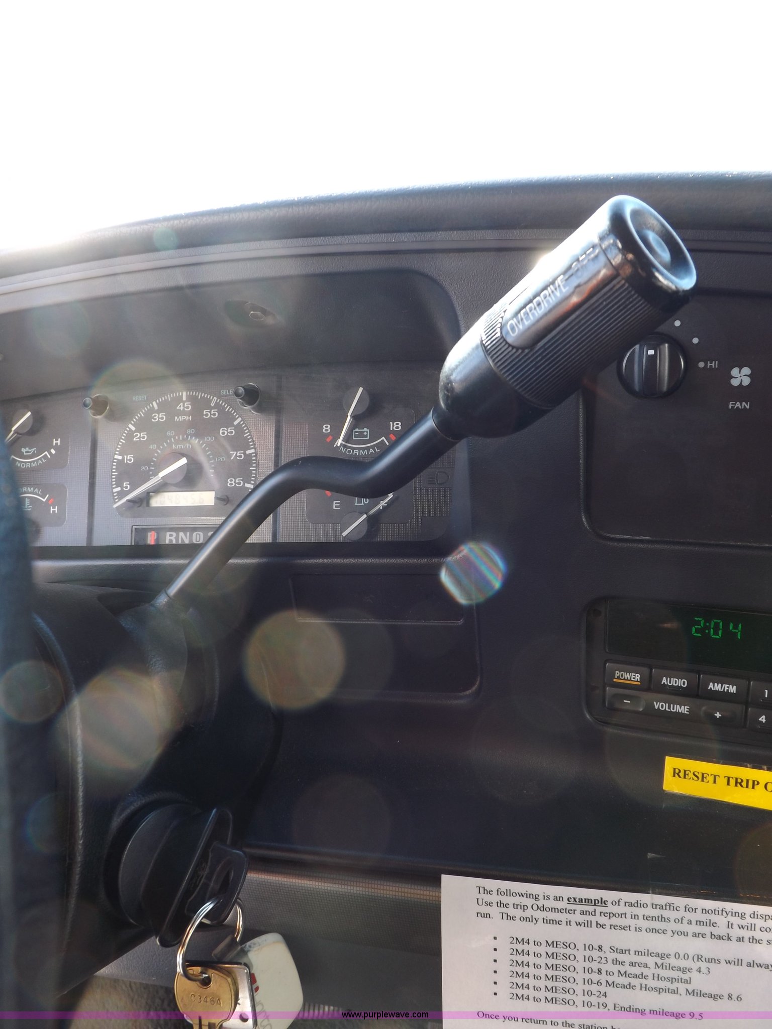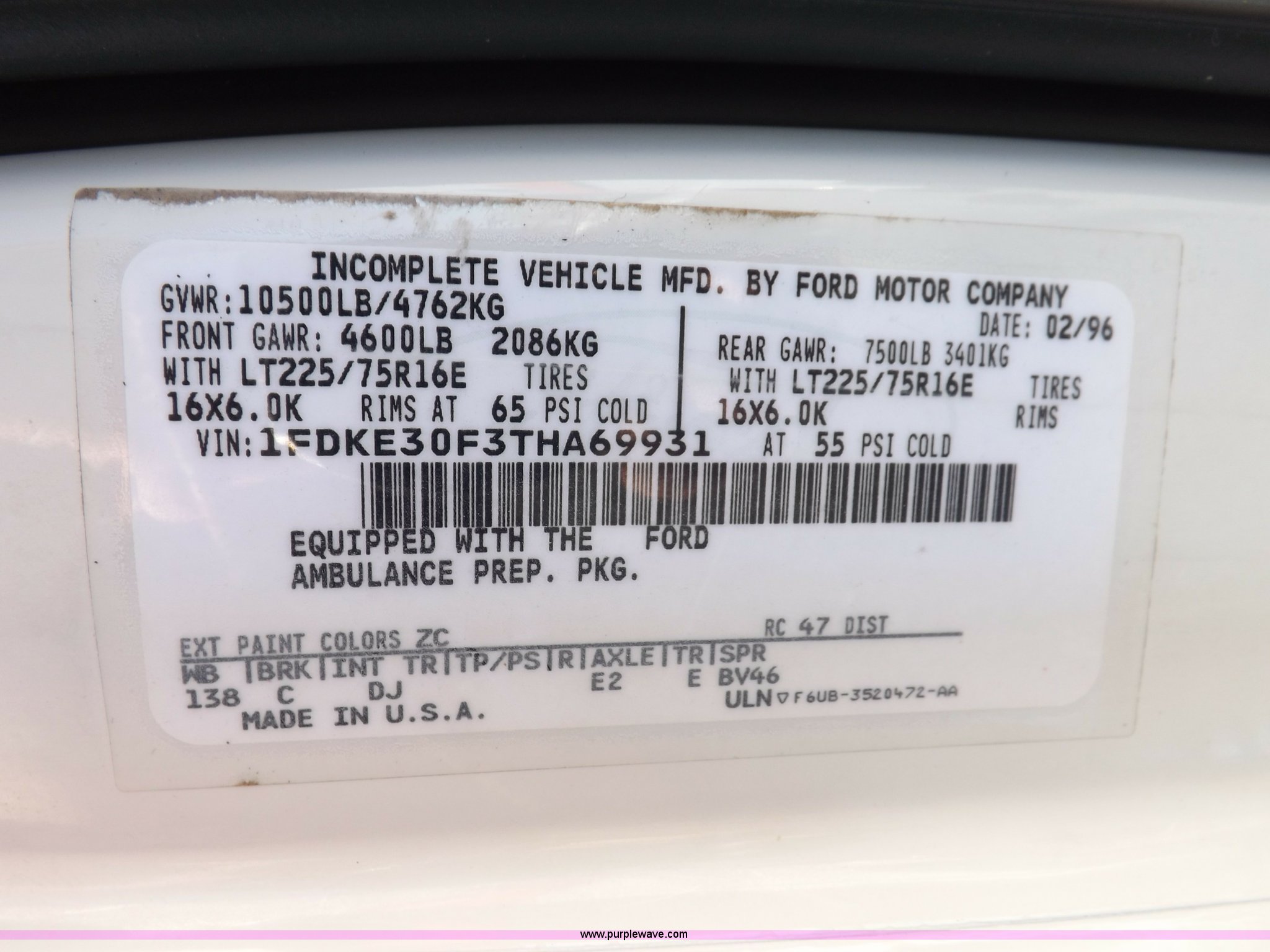 Purple Wave is selling a used Fire Truck or Emergency Vehicle in Kansas. This item is a 1996 Ford Econoline E350 ambulance with the following: 104,845 miles on odometer, 7.3L V8 OHV 16V turbo diesel engine, Automatic transmission, AC and heat, Tilt, Cruise, AM/FM, Power windows and locks, Cloth interior, Horton Emergency Vehicles ambulance package, 145"L x 68"H, (4) left side storage compartments, Lights, (3) right side storage compartments, Lights, AG Power 12V inverter, Oxygen bottle storage, Additional specifications available by request, Code 3 Emergency light system, 225/75R16 tires, GVWR 10,500 lbs, FAWR 4,600 lbs, RAWR 7,500 lbs, Front left stainless steel wheel inserts missing
