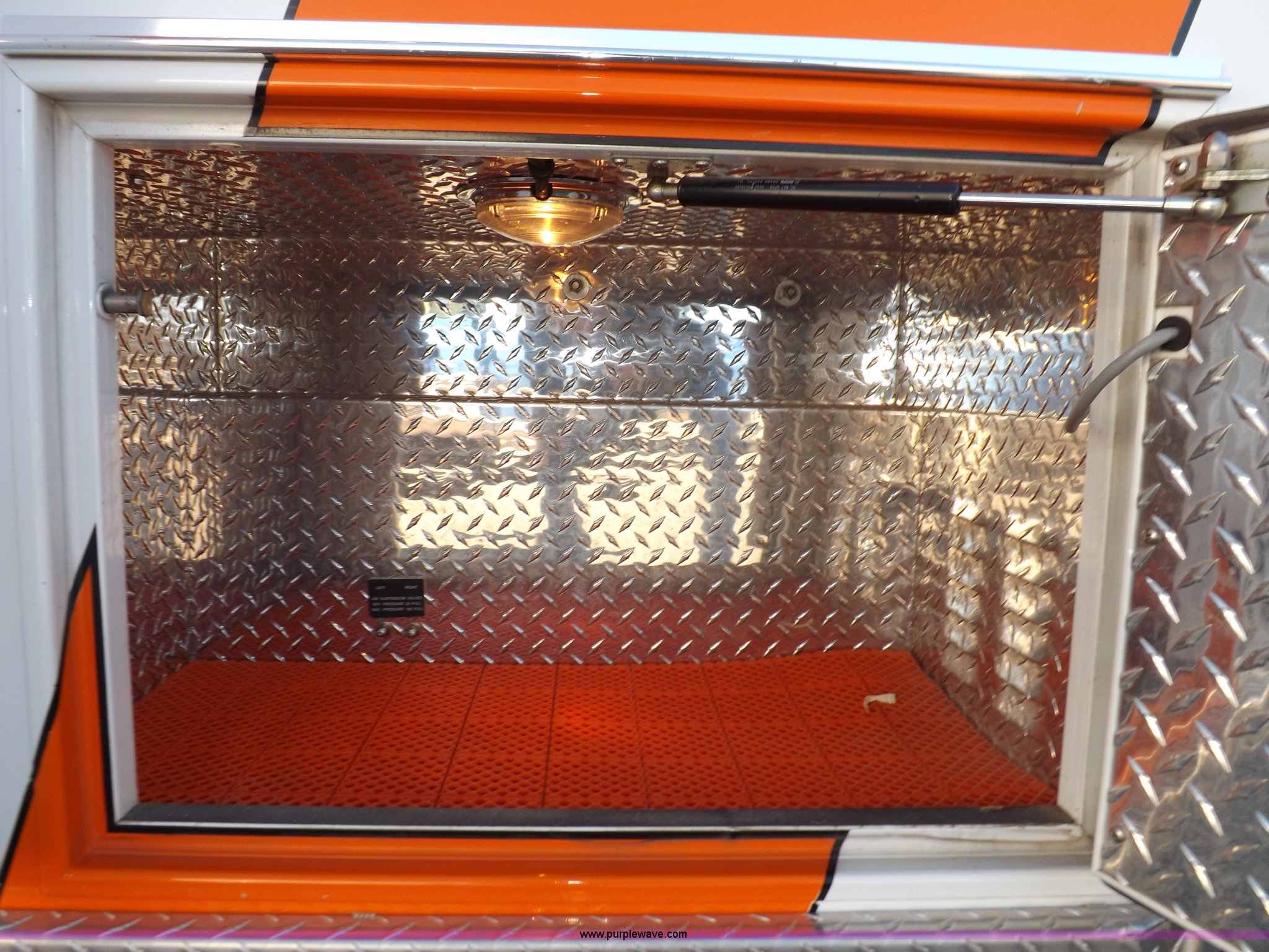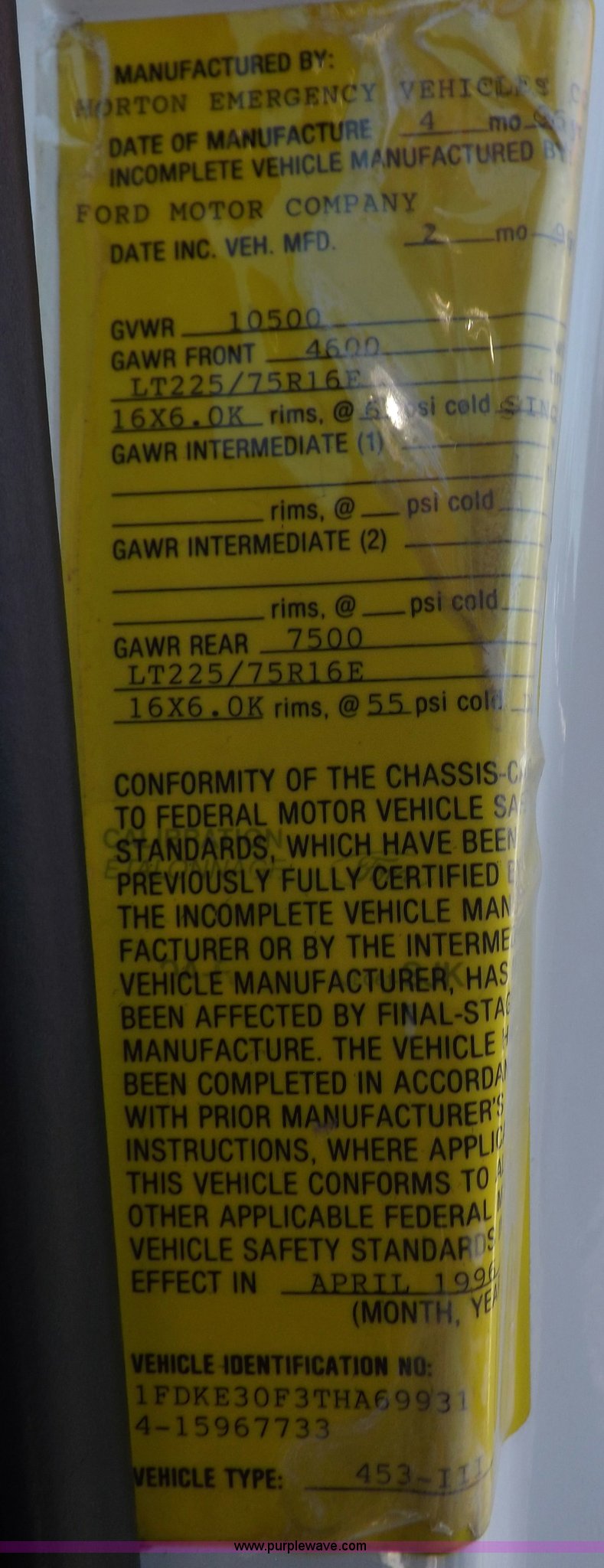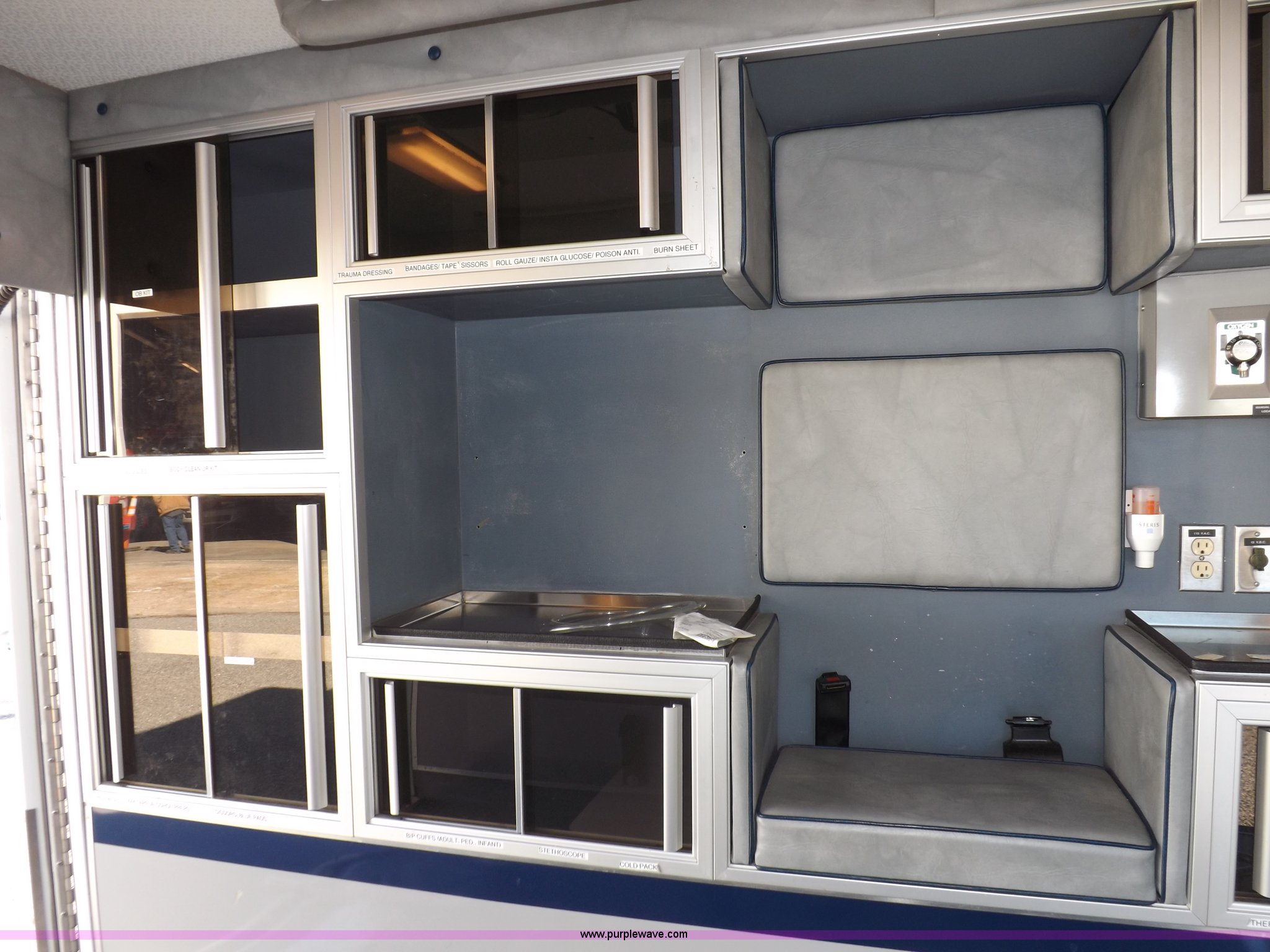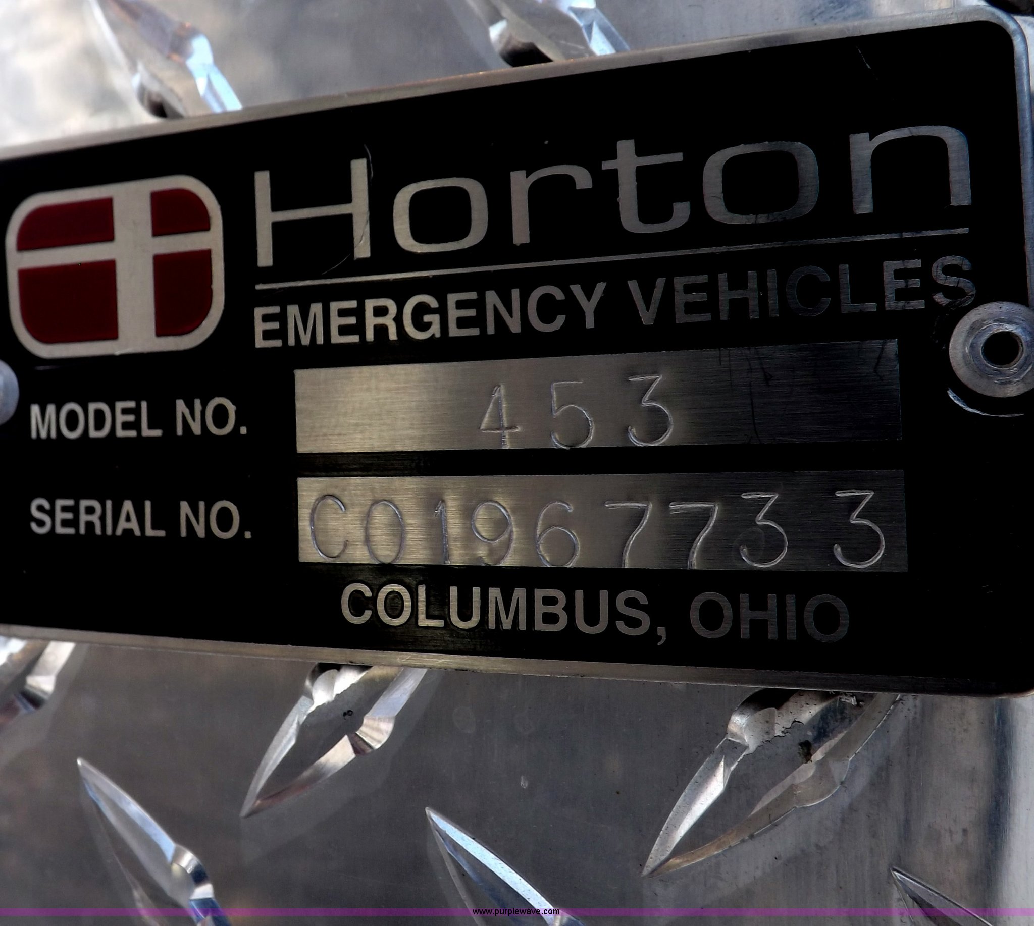 Purple Wave is selling a used Fire Truck or Emergency Vehicle in Kansas. This item is a 1996 Ford Econoline E350 ambulance with the following: 104,845 miles on odometer, 7.3L V8 OHV 16V turbo diesel engine, Automatic transmission, AC and heat, Tilt, Cruise, AM/FM, Power windows and locks, Cloth interior, Horton Emergency Vehicles ambulance package, 145"L x 68"H, (4) left side storage compartments, Lights, (3) right side storage compartments, Lights, AG Power 12V inverter, Oxygen bottle storage, Additional specifications available by request, Code 3 Emergency light system, 225/75R16 tires, GVWR 10,500 lbs, FAWR 4,600 lbs, RAWR 7,500 lbs, Front left stainless steel wheel inserts missing