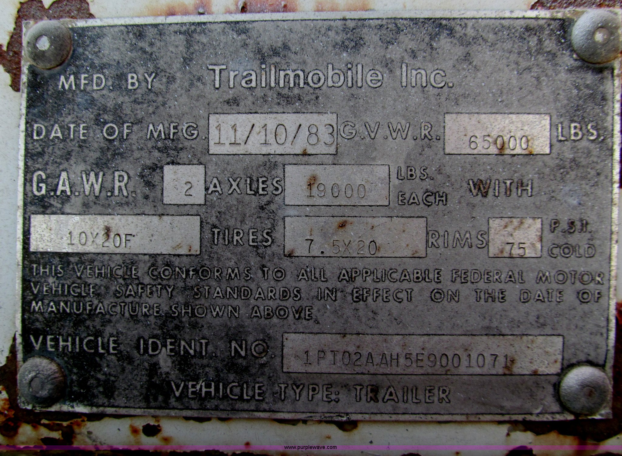1983 Trailmobile tandem axle dry van trailer. 48'L x 102"W, Front landing gear, Pintle hitch, Spring suspension, Air brakes, 10.00R20 tires, GVWR 65,000 lbs, GAWR 19,000 lbs per axle, Door is pad locked No keys, Case# 13C069015. Vehicle is abandoned. No additional information is available. Vehicle does not have keys unless notated otherwise in the item listing.. View City Of Wichita Terms for title acquisition and item removal requirements.. 1PT02AAH5E9001071. Tow Service Inc.. 3760 South Broadway. Wichita, KS 67216
