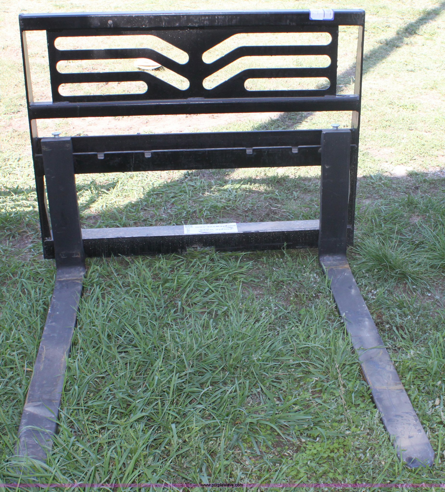 Wildkat 48" skid steer pallet forks. 48"L x 4"W x 1 3/8"H, 3,700 lbs rated operating capacity, A36 steel construction, 3/8" plate, 1/2" top rail, Six stop positions at 7", 13.5", and 19" each direction, 3/8" notched bottom rail, Built to fit Class II forks, Unused. Representative photo. Newton, KS 67114
