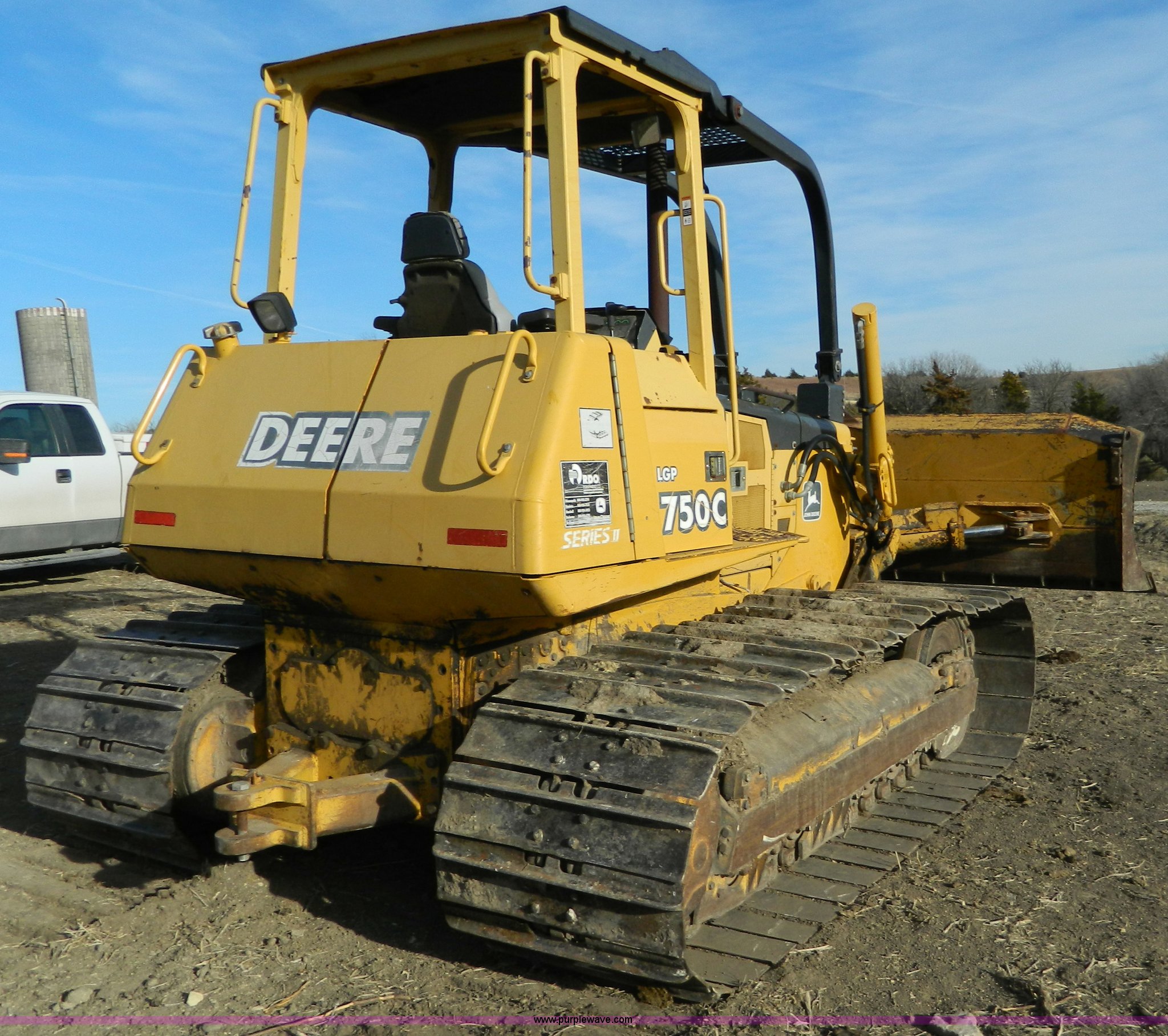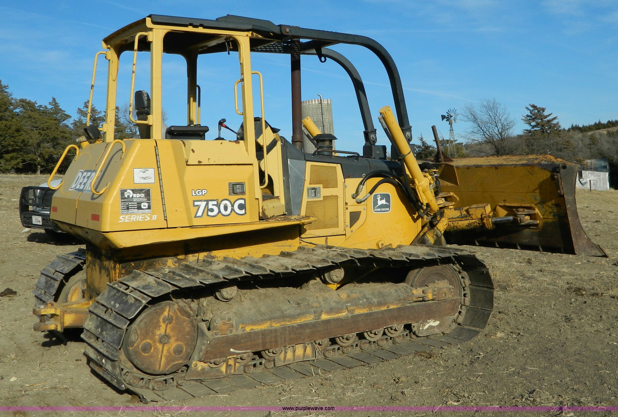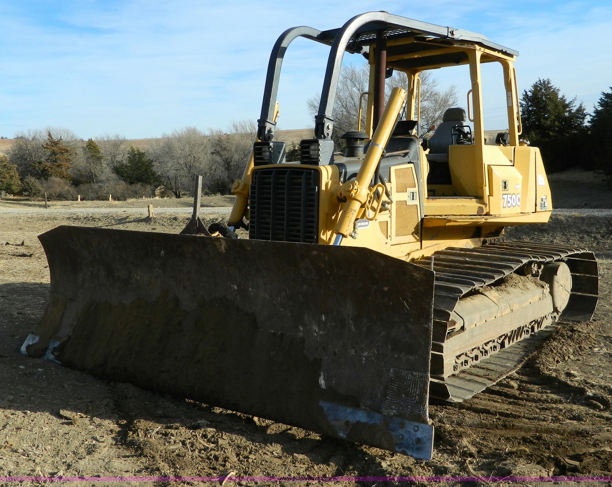 Purple Wave is selling a used Crawler Dozer in Kansas. This item is a 2000 John Deere 750C LGP Series II dozer with the following: 7,124 hours on meter, John Deere six cylinder turbo diesel engine, 140 HP, Hydrostatic transmission, Auto dual-path, Canopy, Suspension seat, Joystick steering, Engine enclosures, Electronic monitor system, 143" blade, Bolt-on cutting edge, Rear draw bar, Seven bottom rollers, 34" single grouse tracks, 36,576 lbs. base operating weight, Operators manual, Serial T0750C892126