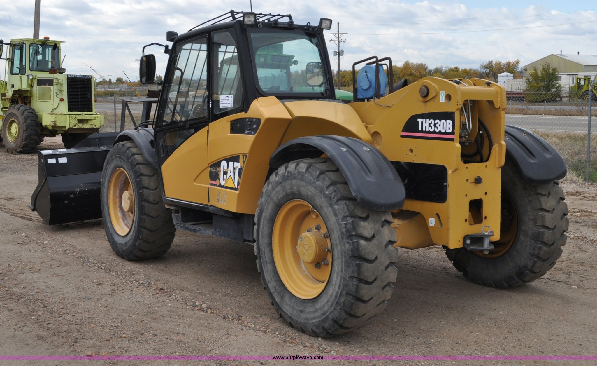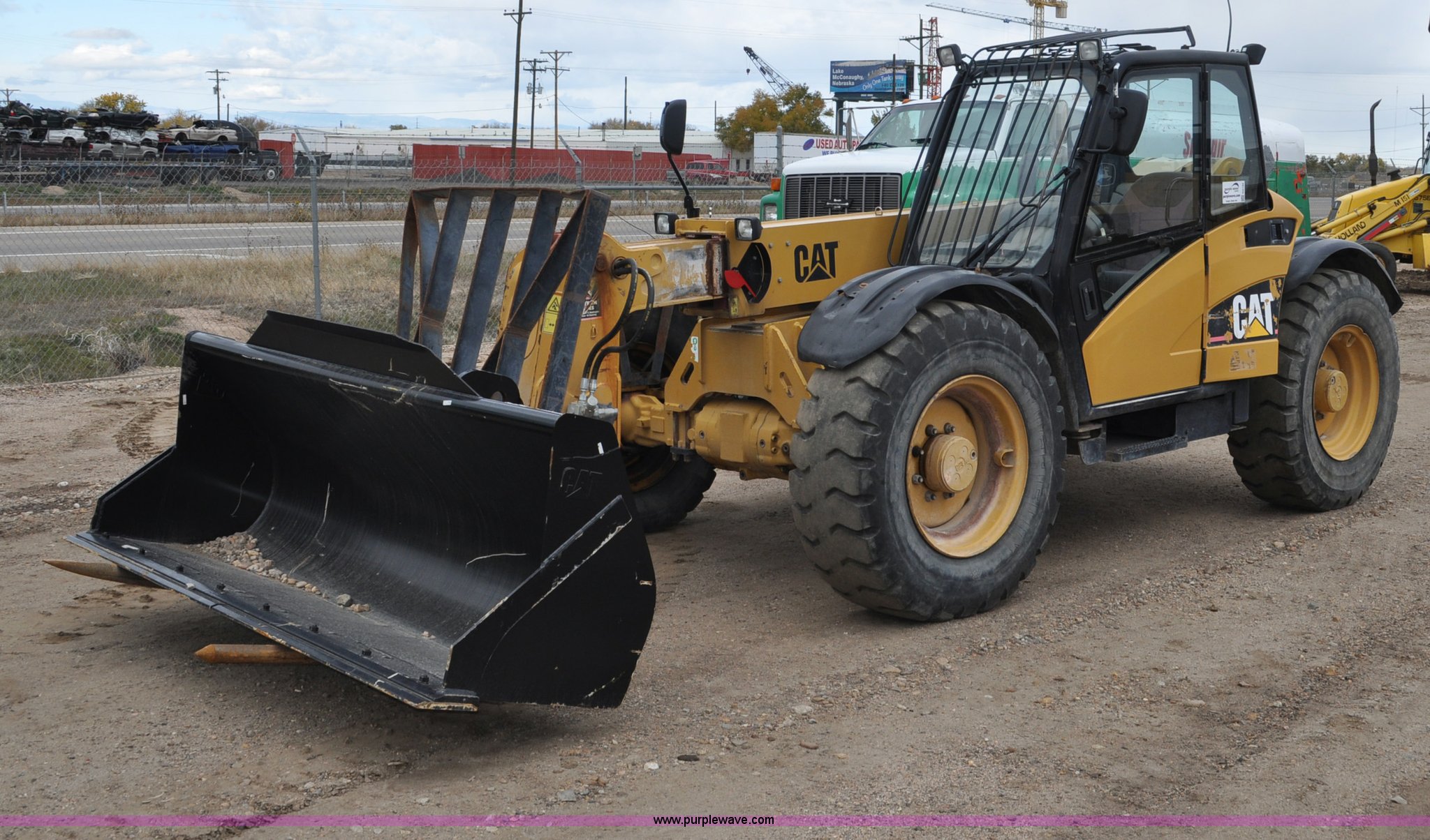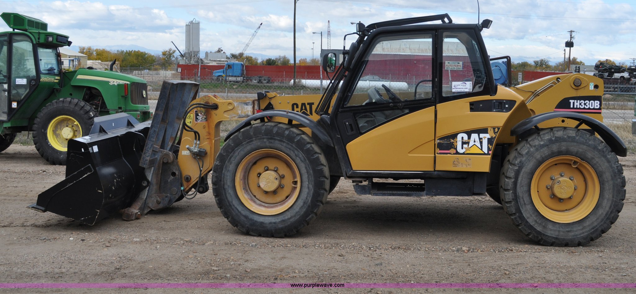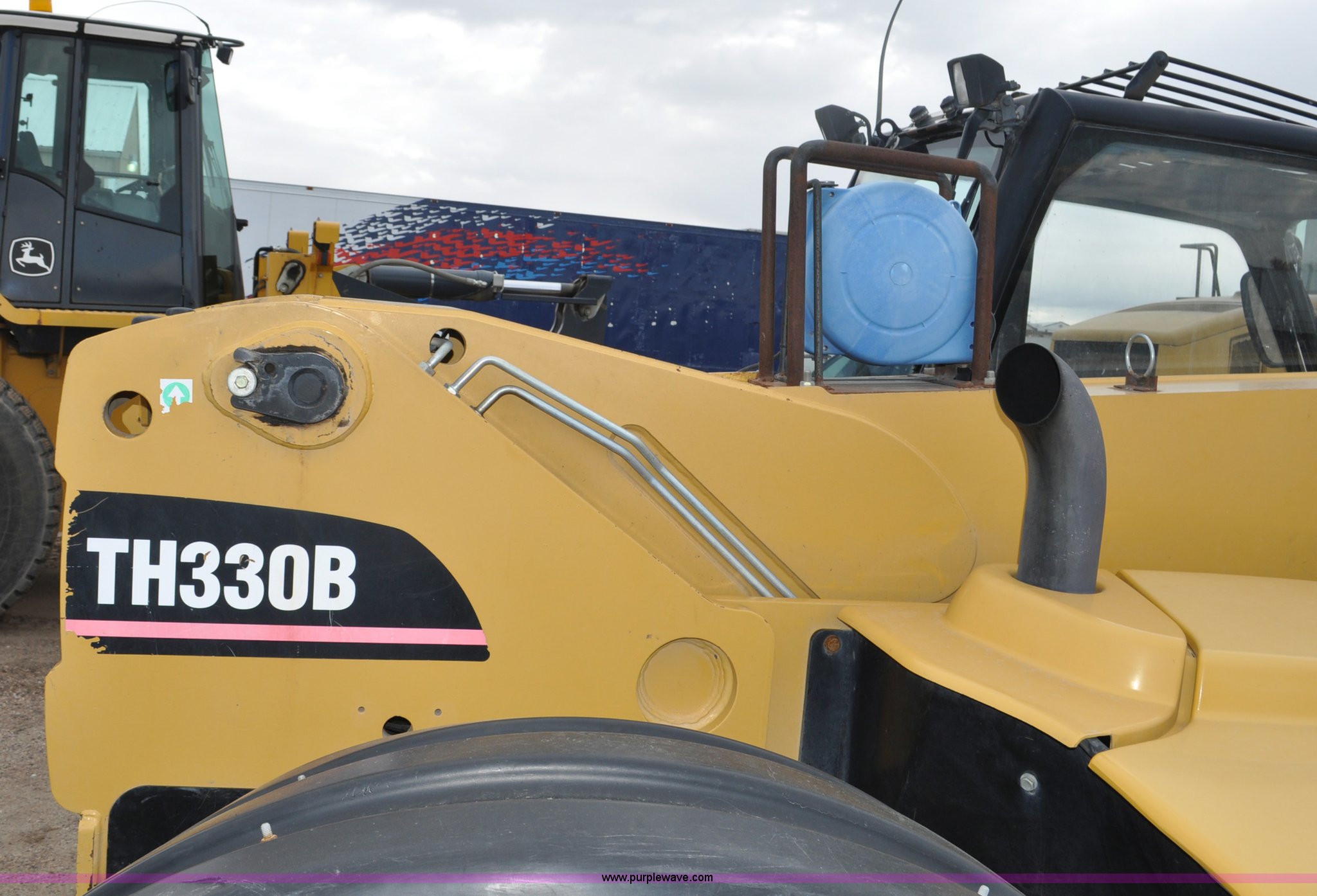Purple Wave is selling a used Telehandler in Colorado. This item is a 2005 Caterpillar TH330B telehandler with the following: 9,353 hours on meter, Caterpillar 3054E four cylinder diesel engine, 99 HP, Serial CRX04409, Powershift transmission, 4F-3R gears, Four wheel drive, Differential lock, Crab steer, Circle steer, Enclosed cab, AC and heat, Air suspension seat, 7,000 lbs lift capacity, 12.5'L reach, Auxiliary hydraulics, Hydraux manlift, Quick attach, 1,000 lbs capacity, Hydraulic angle, 4' x 10" basket, Bale forks, 26 gallon fuel tank, 15.5x25 tires, 15,476 lbs. base operating weight, Bucket is not included, Serial CATTH330ASLB00905