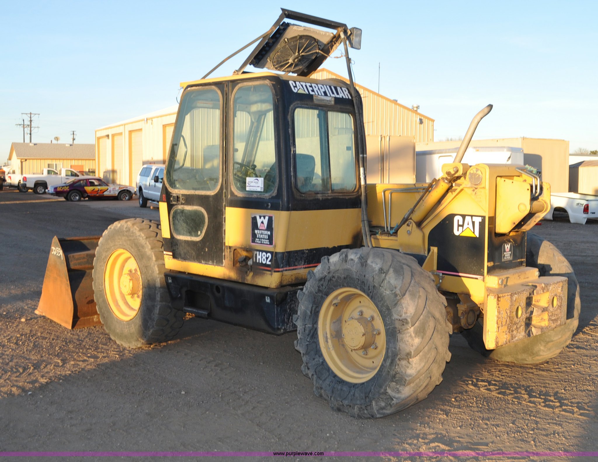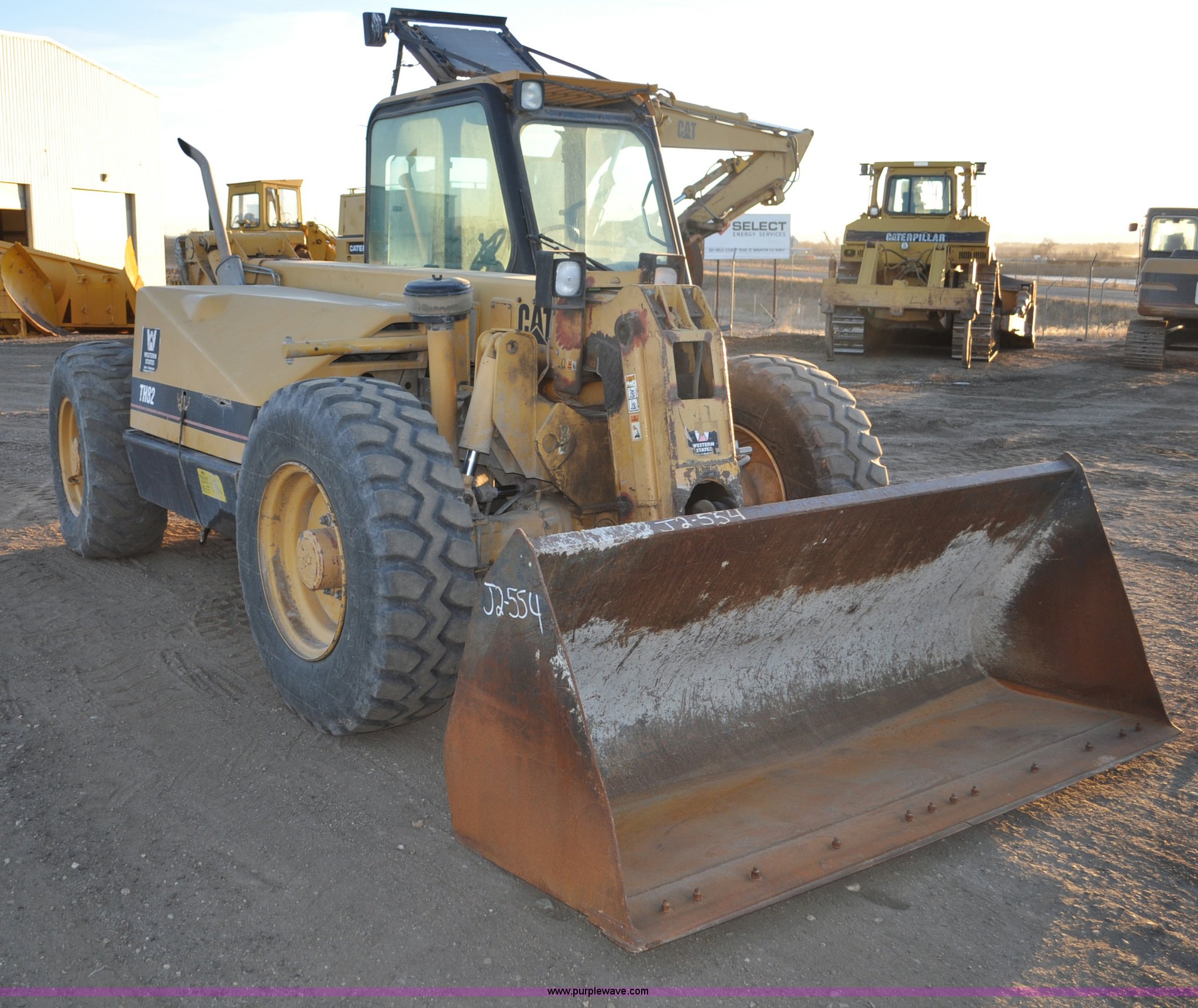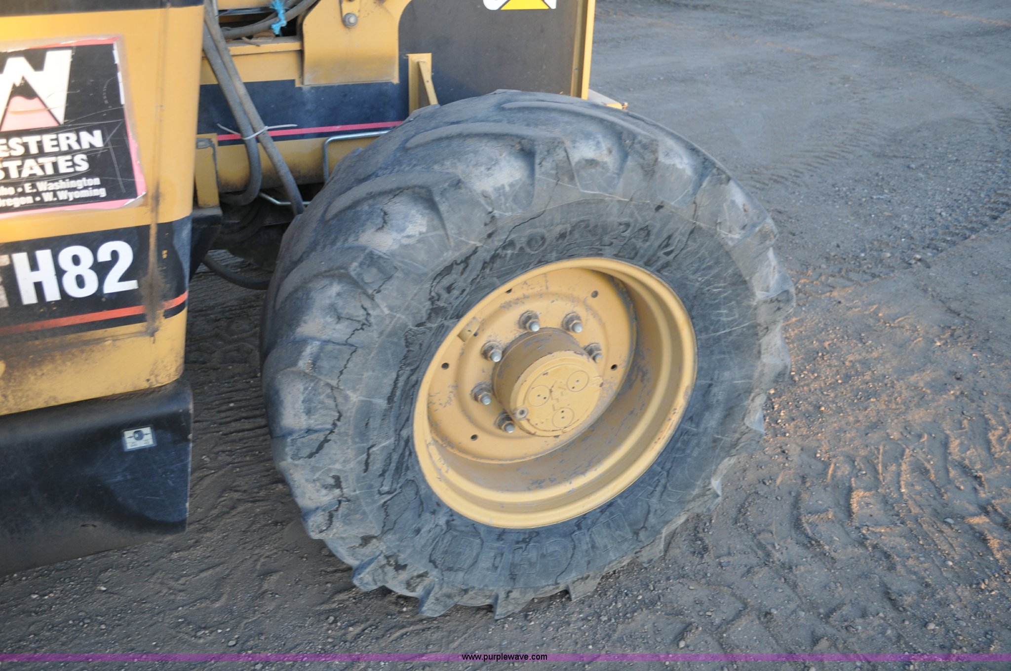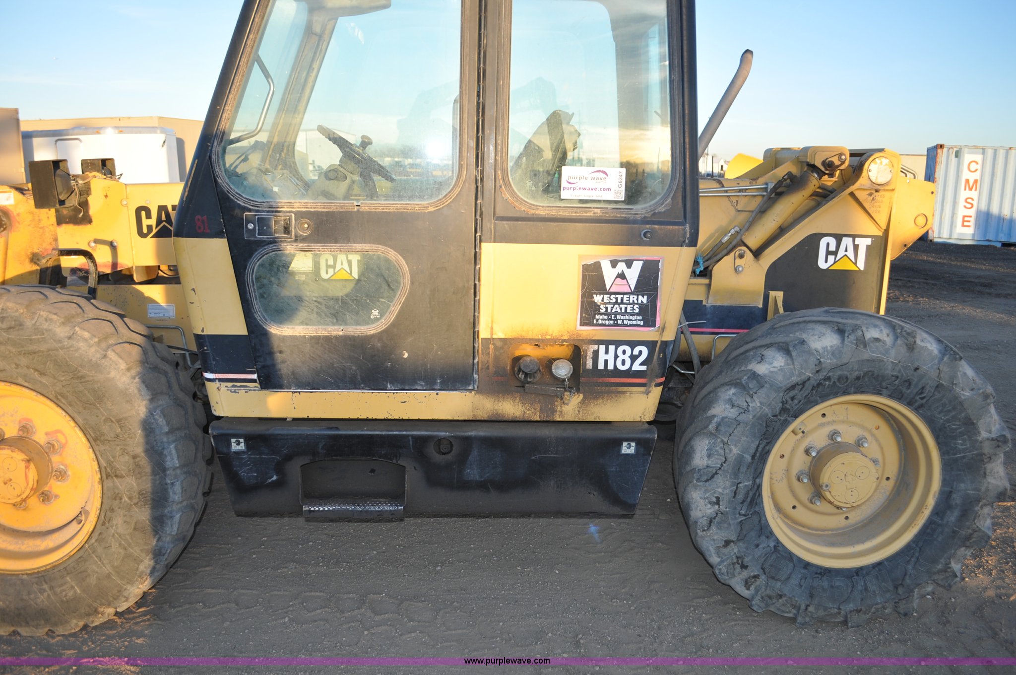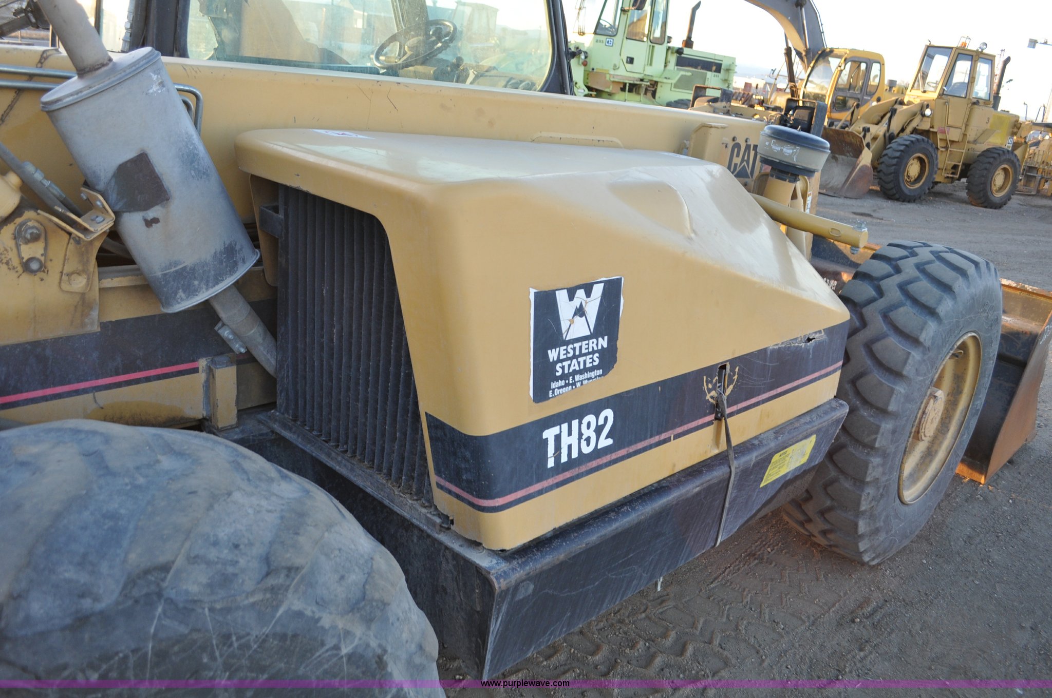 Purple Wave is selling a used Telehandler in Colorado. This item is a 1999 Caterpillar TH82 telehandler with the following: 13,358 hours on meter, Caterpillar 3054T four cylinder diesel engine, 109 HP, Serial 7BJ04381, Powershift transmission, 4F-3R gears, Differential lock, Crab steer, Circle steer, Enclosed cab, Spring seat, 8,013 lbs lift capacity, 13.8'L reach, Auxiliary hydraulics, Hydraulic leveling, 94" bucket, Bolt-on edge, 31 gallon fuel tank, 15.5x25 front tires, 17.5x24 rear tires, 16,468 lbs. base operating weight, Cracks on boom have been welded and repaired, Serial 3JN00724