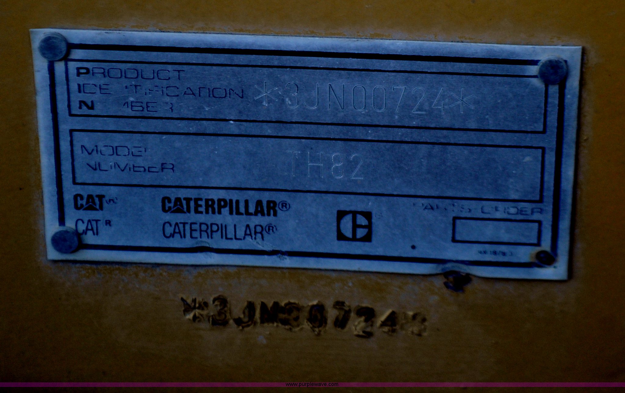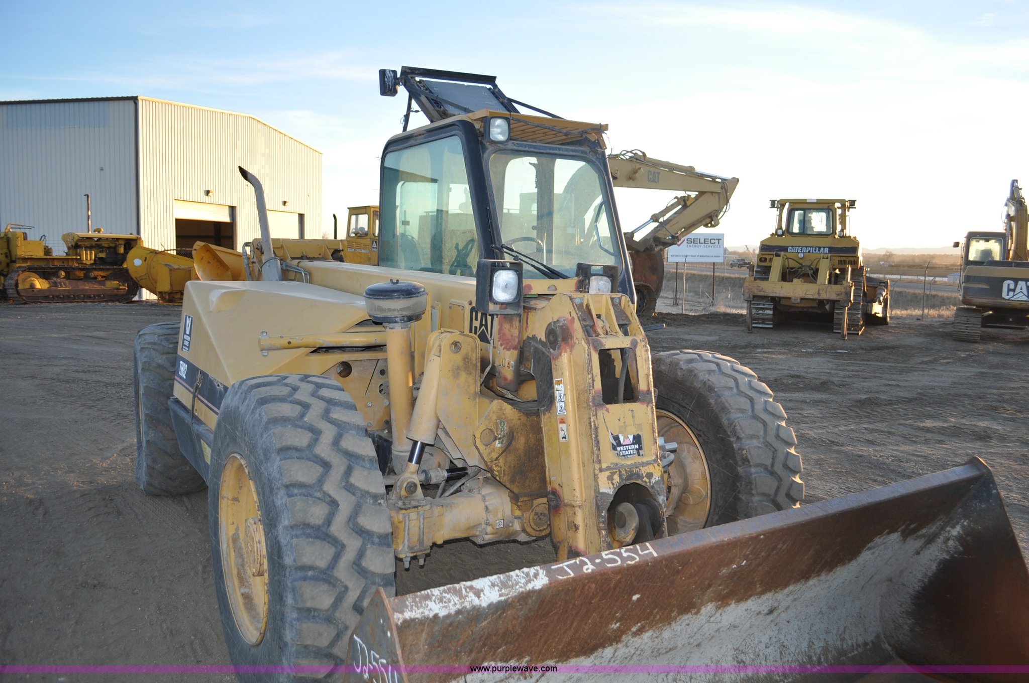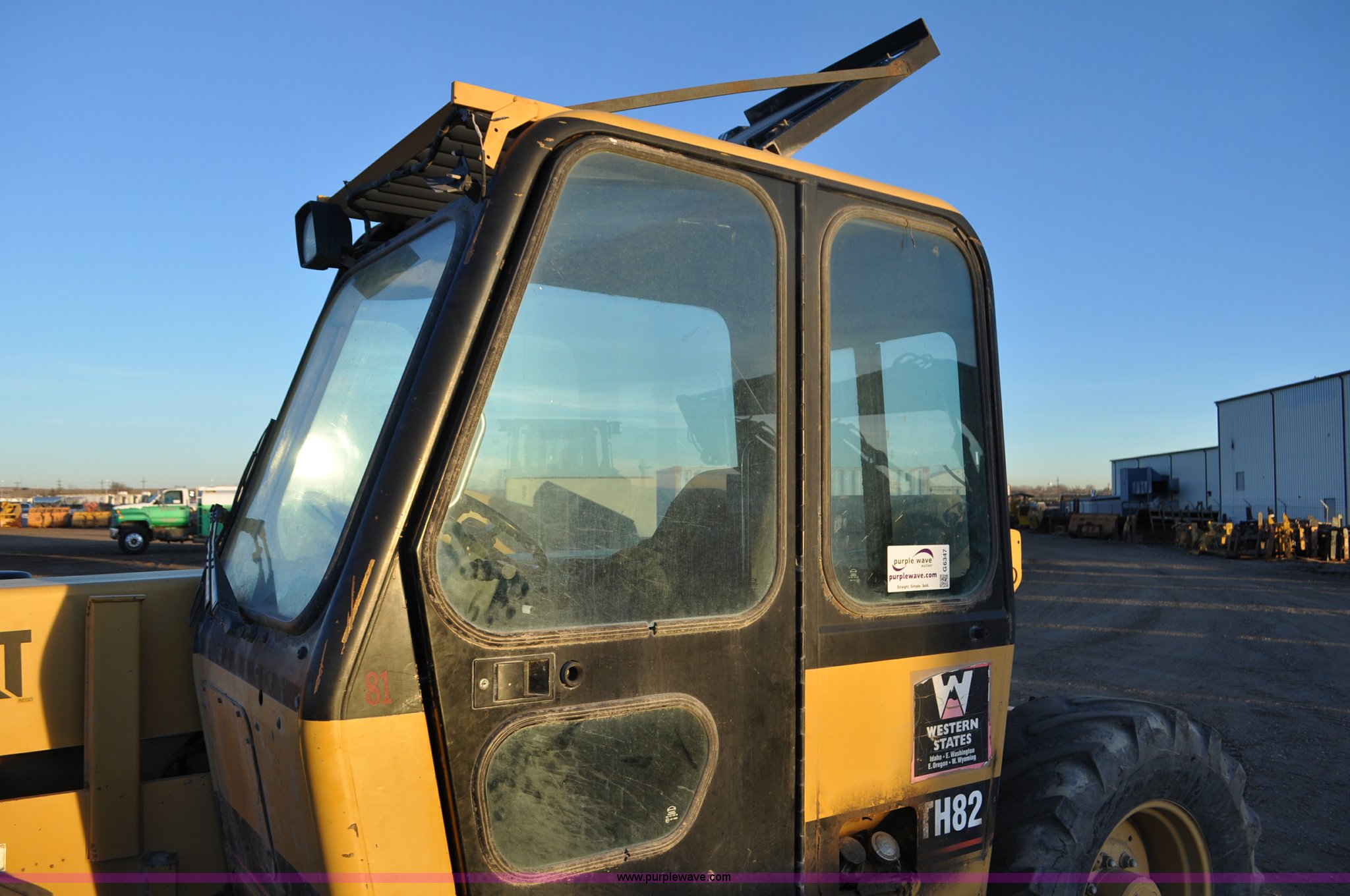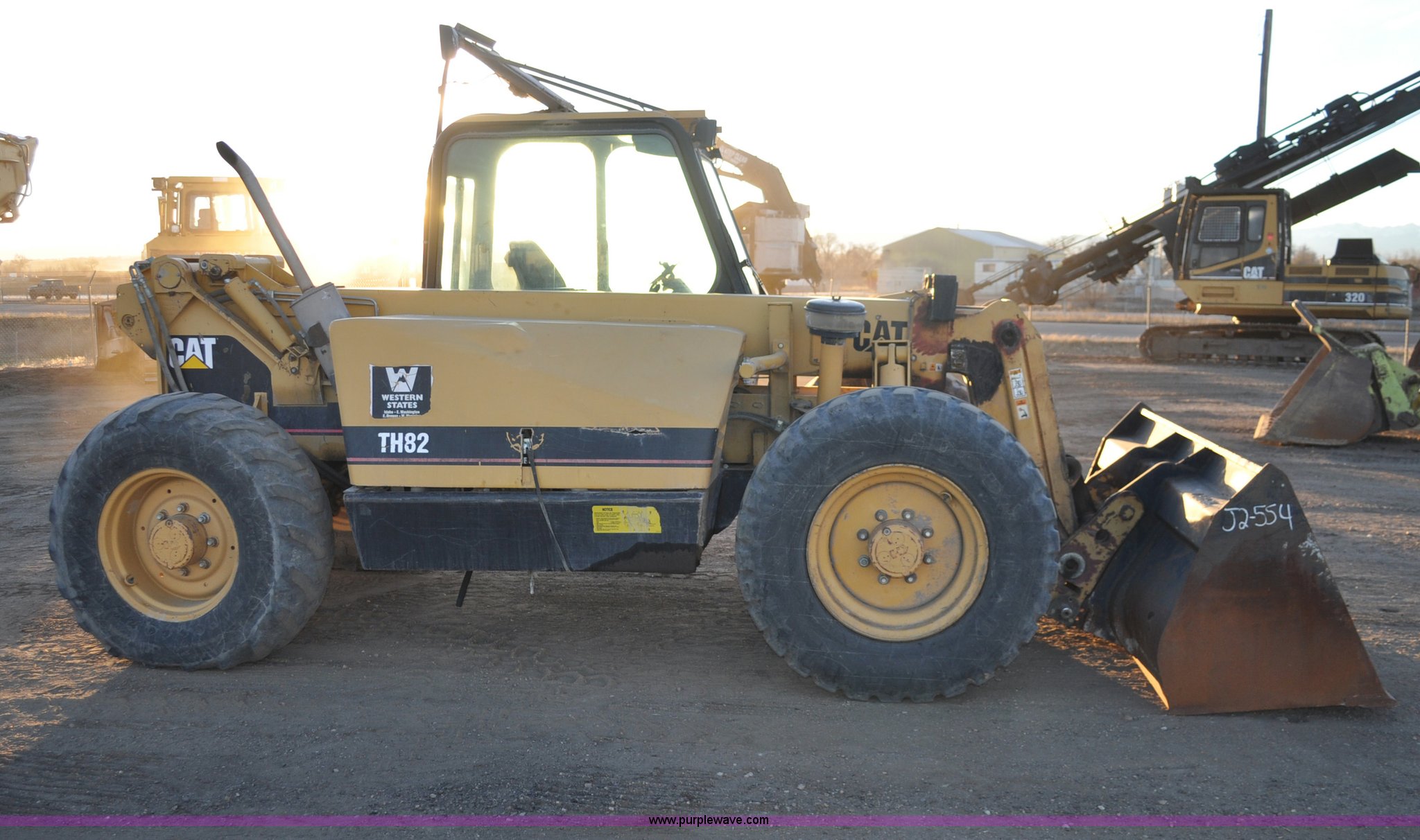 Purple Wave is selling a used Telehandler in Colorado. This item is a 1999 Caterpillar TH82 telehandler with the following: 13,358 hours on meter, Caterpillar 3054T four cylinder diesel engine, 109 HP, Serial 7BJ04381, Powershift transmission, 4F-3R gears, Differential lock, Crab steer, Circle steer, Enclosed cab, Spring seat, 8,013 lbs lift capacity, 13.8'L reach, Auxiliary hydraulics, Hydraulic leveling, 94" bucket, Bolt-on edge, 31 gallon fuel tank, 15.5x25 front tires, 17.5x24 rear tires, 16,468 lbs. base operating weight, Cracks on boom have been welded and repaired, Serial 3JN00724