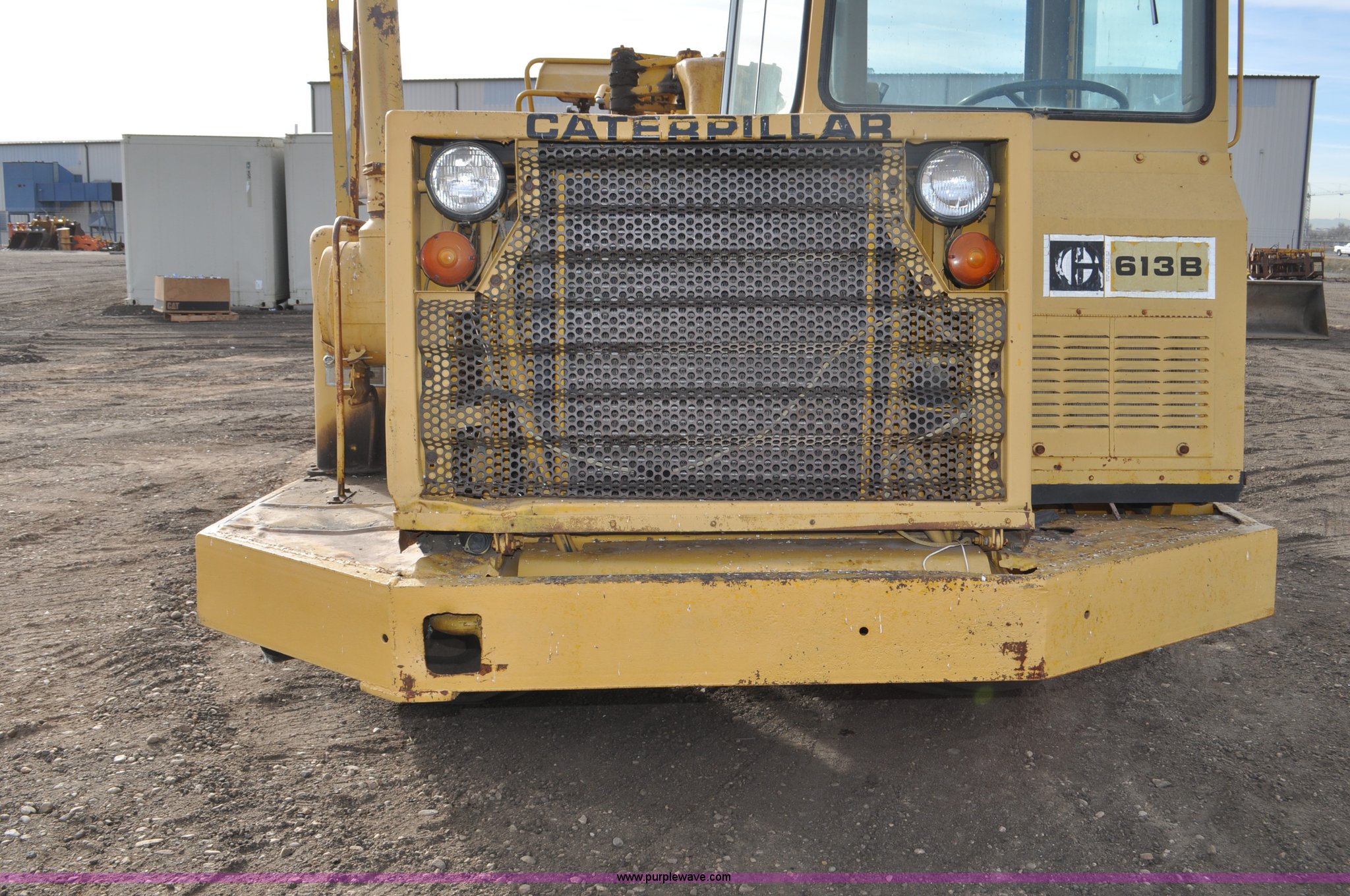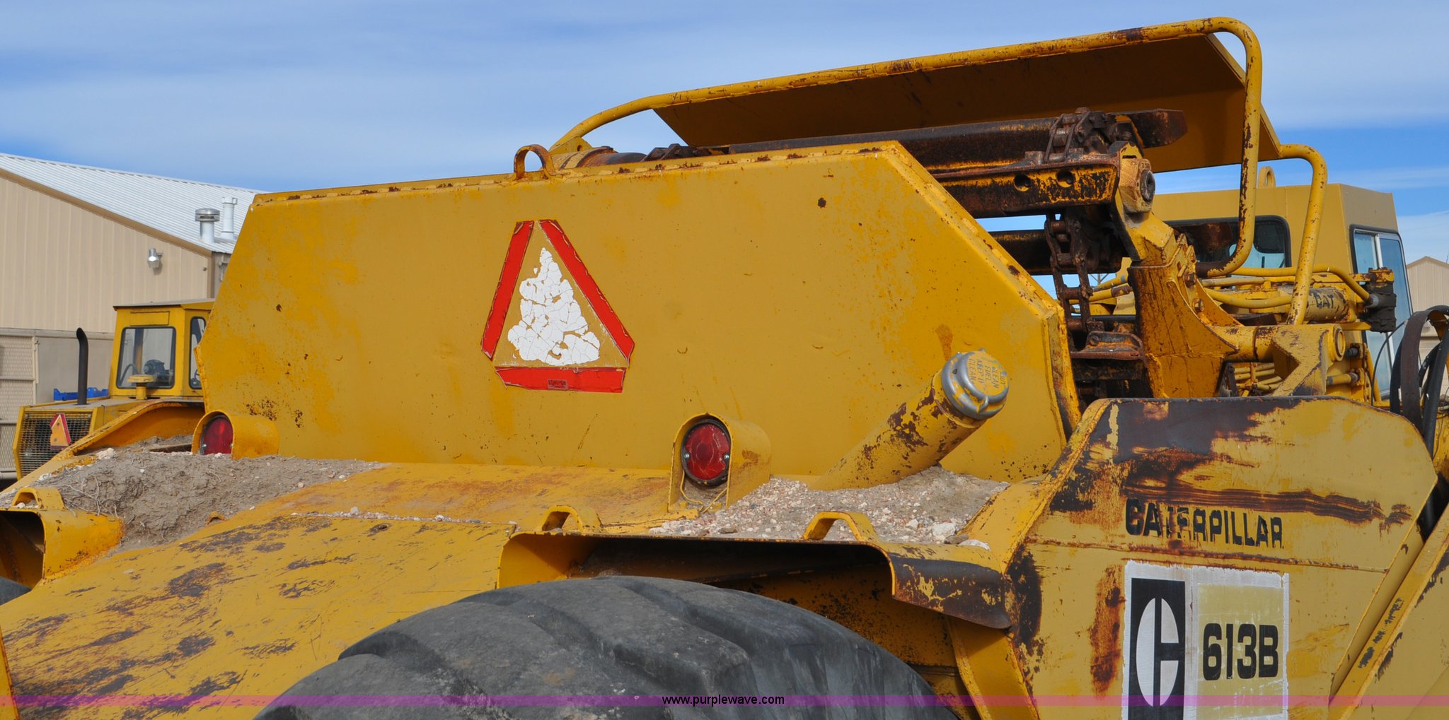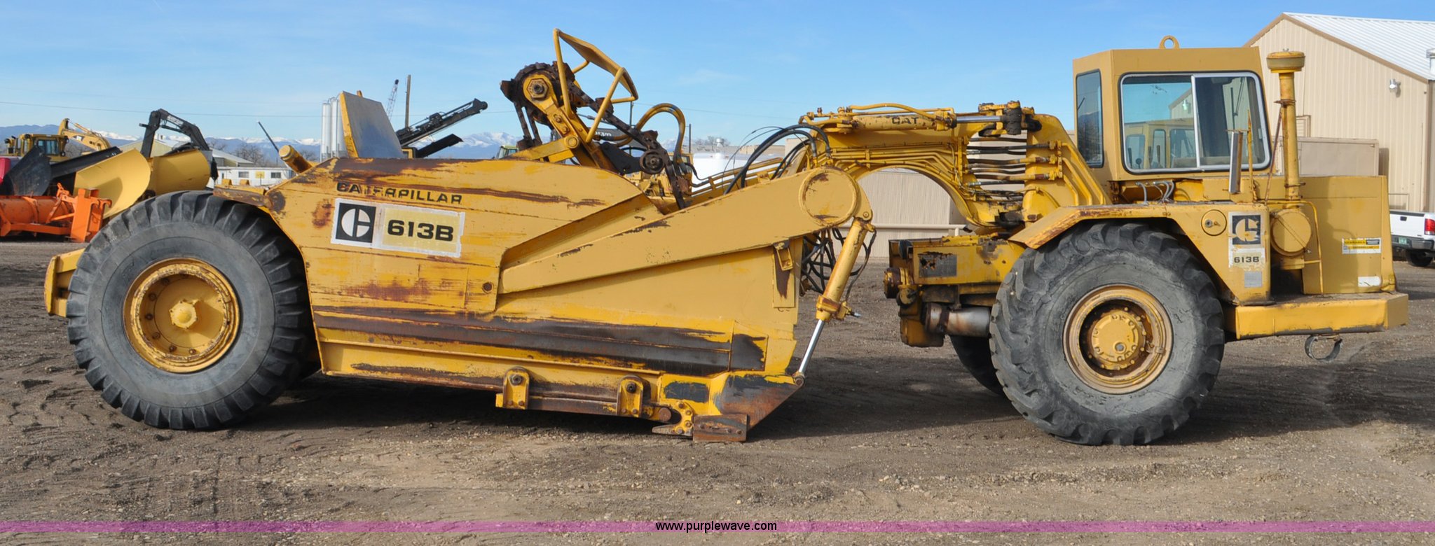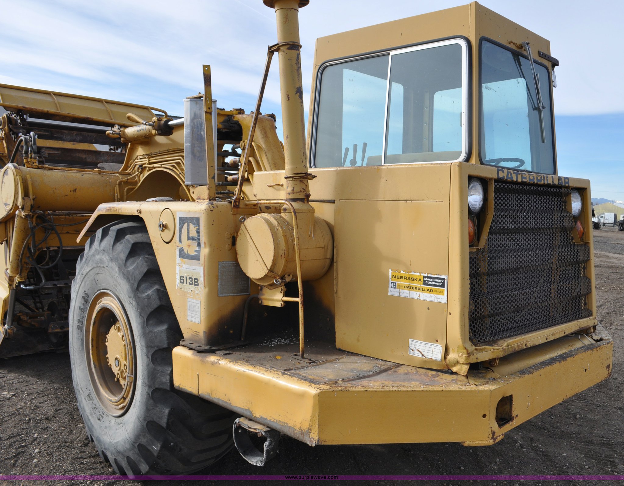 Purple Wave is selling a used Elevating Scraper in Colorado. This item is a 1977 Caterpillar 613B elevating scraper with the following: 681 hours on meter, Caterpillar 3208 diesel engine, 150 HP, 4F-2R gears, 11 cu. yd. capacity, 23.5x25 tires, Previous county machine, Serial 38W4754