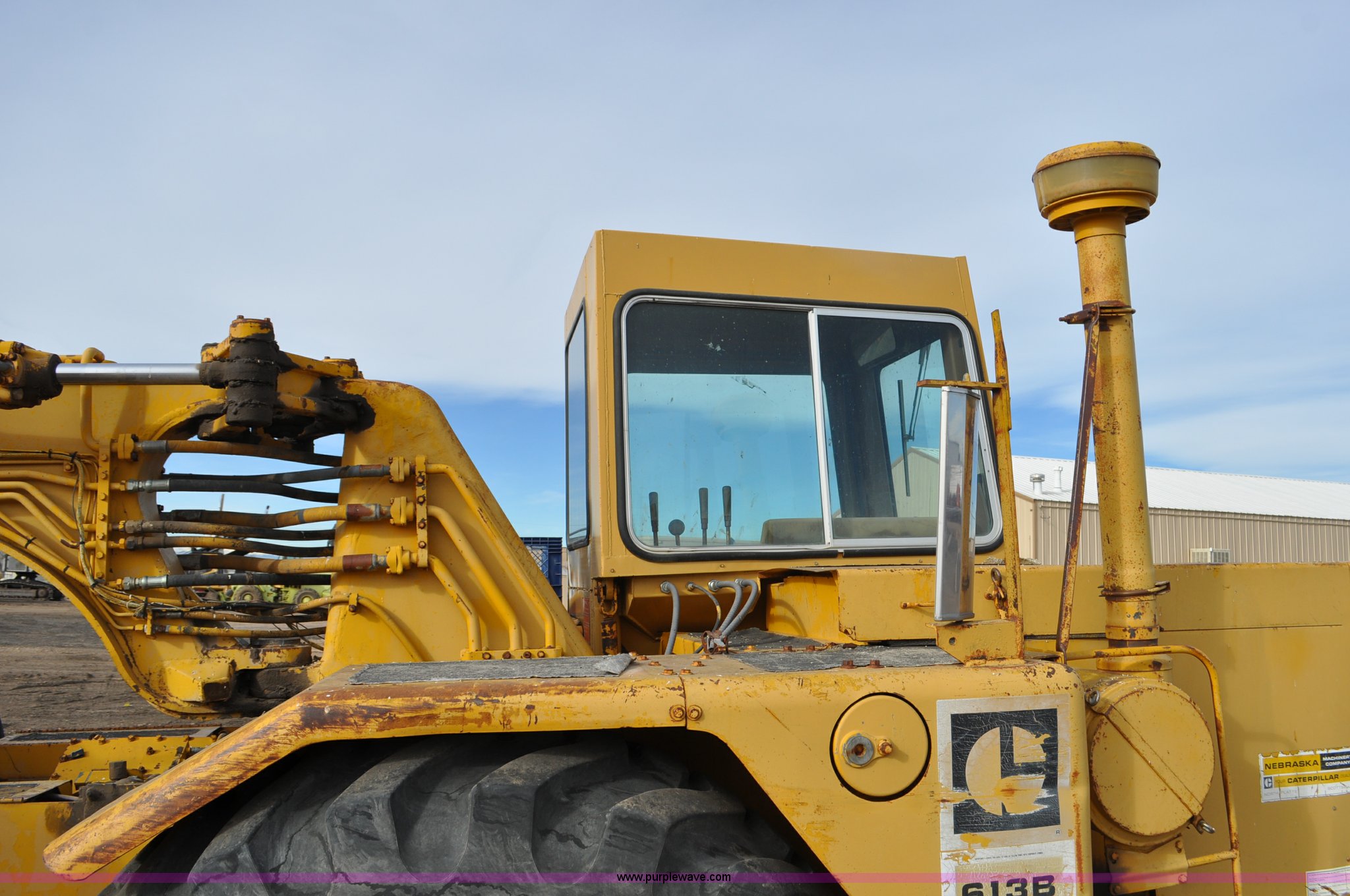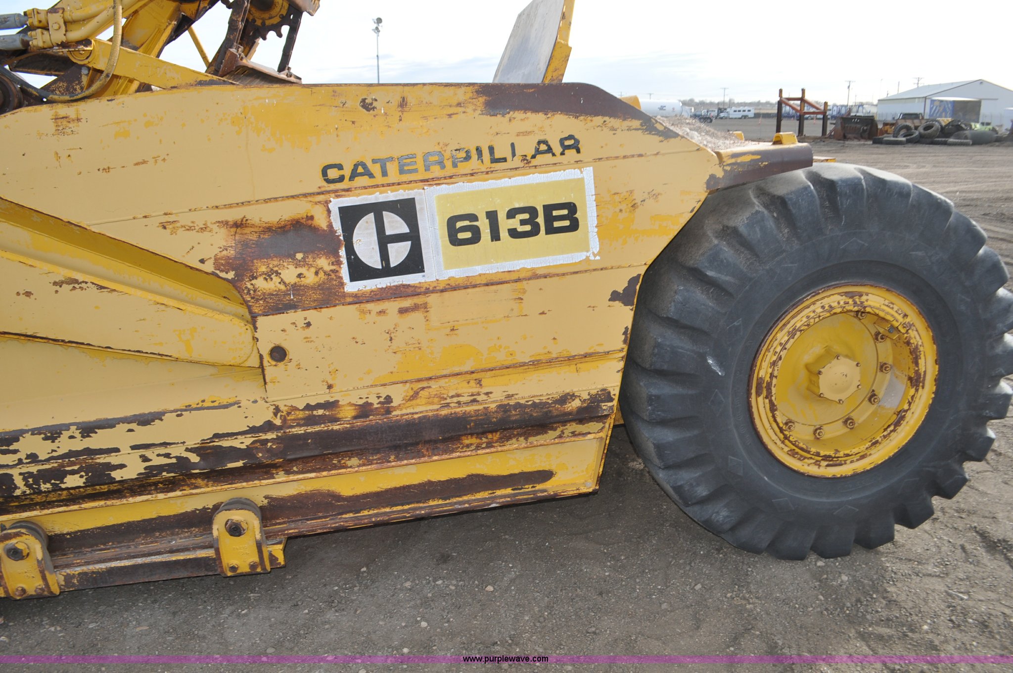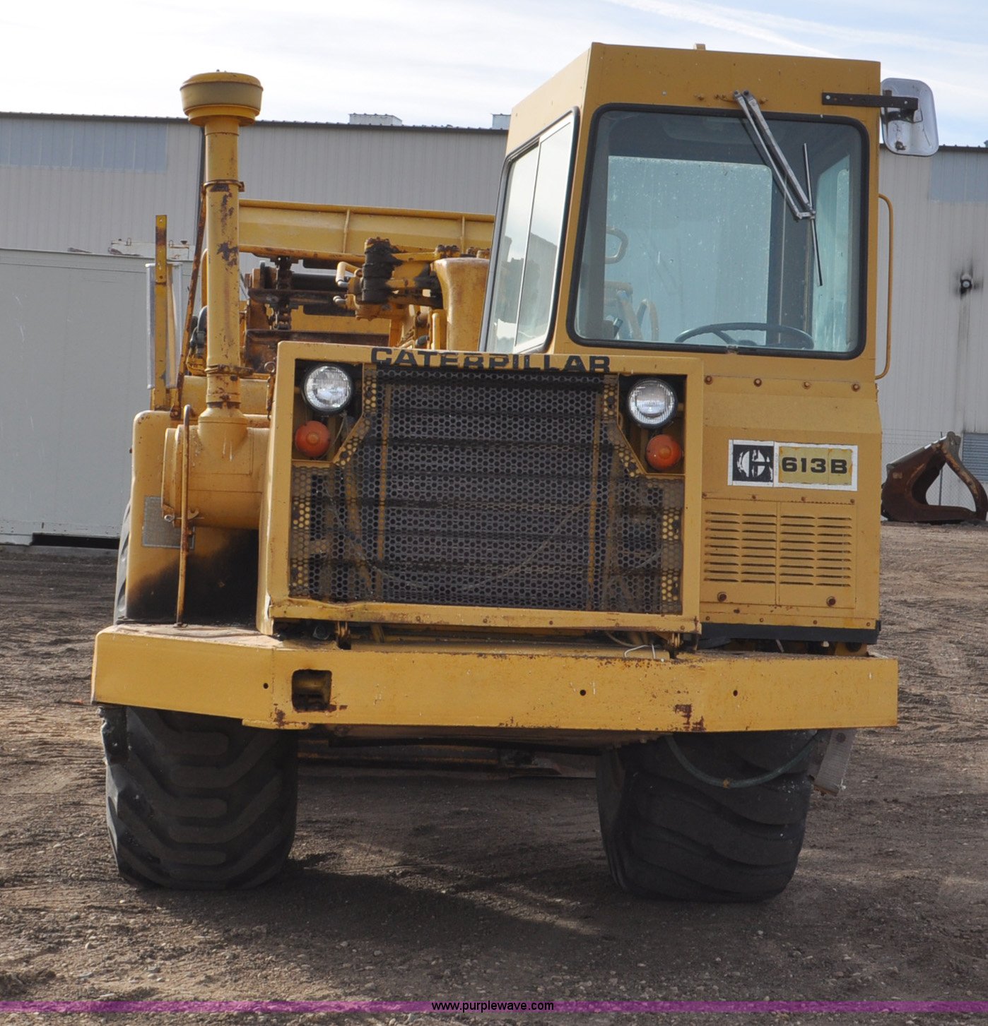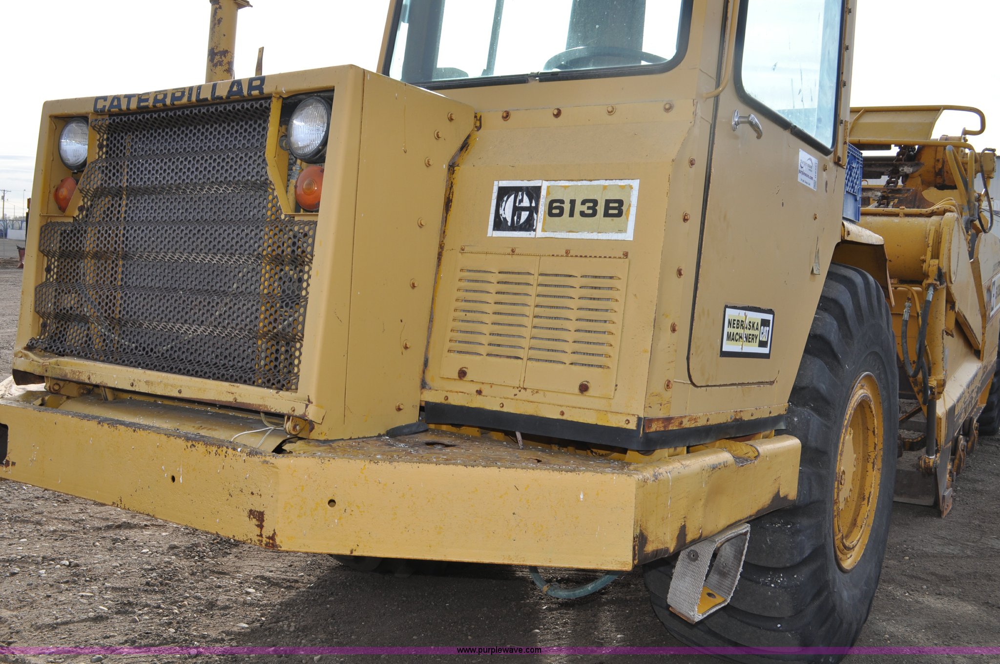 Purple Wave is selling a used Elevating Scraper in Colorado. This item is a 1977 Caterpillar 613B elevating scraper with the following: 681 hours on meter, Caterpillar 3208 diesel engine, 150 HP, 4F-2R gears, 11 cu. yd. capacity, 23.5x25 tires, Previous county machine, Serial 38W4754