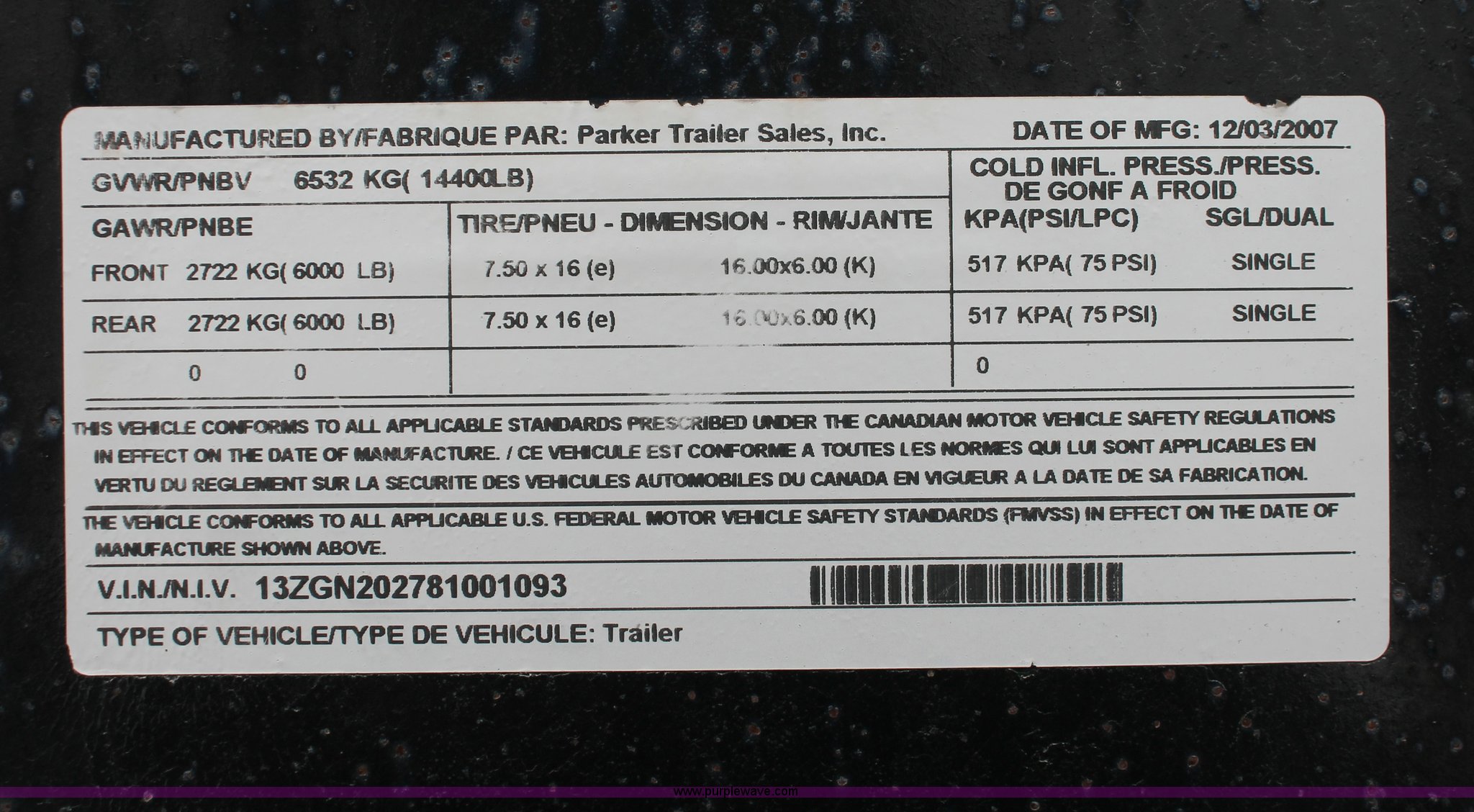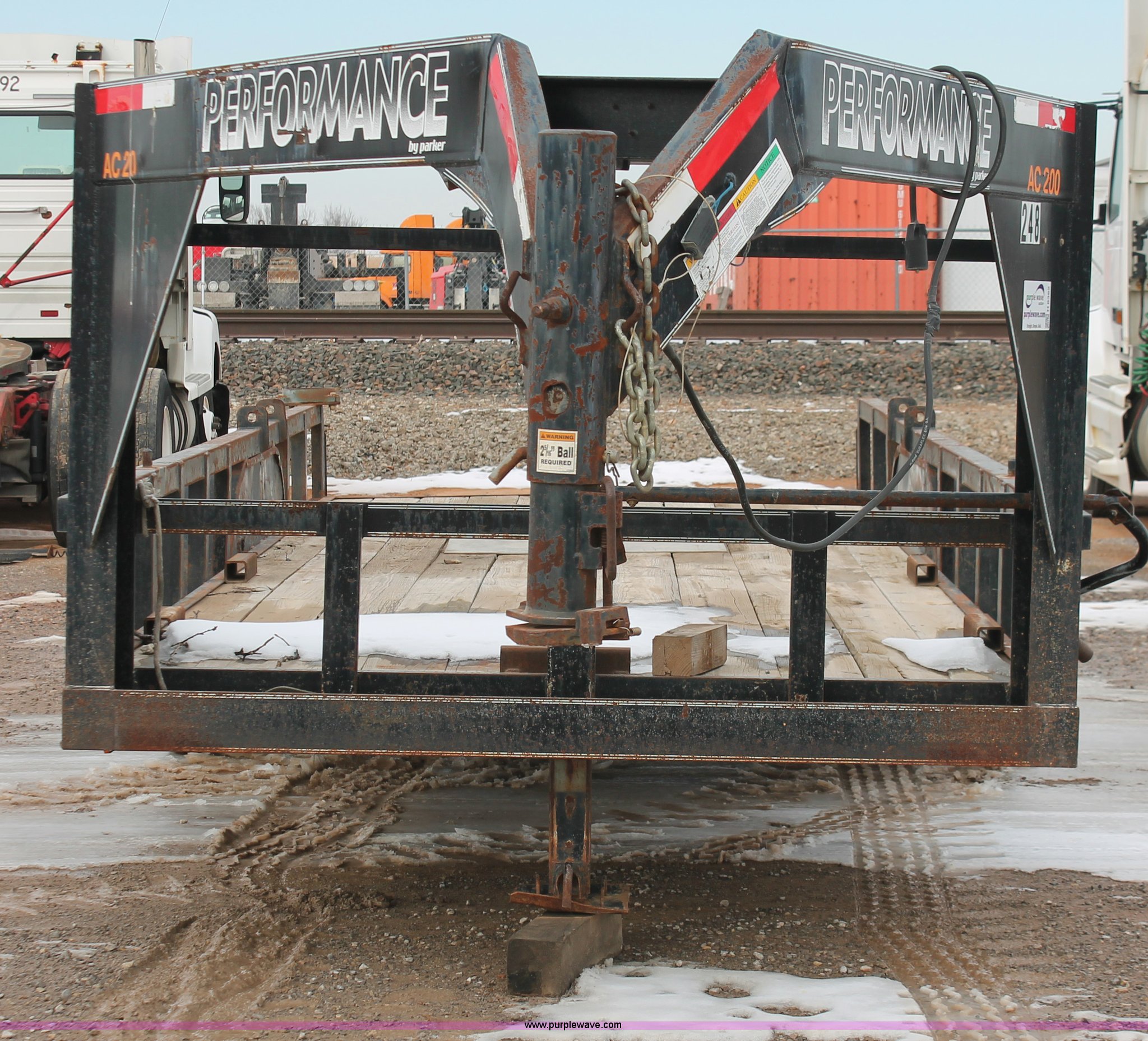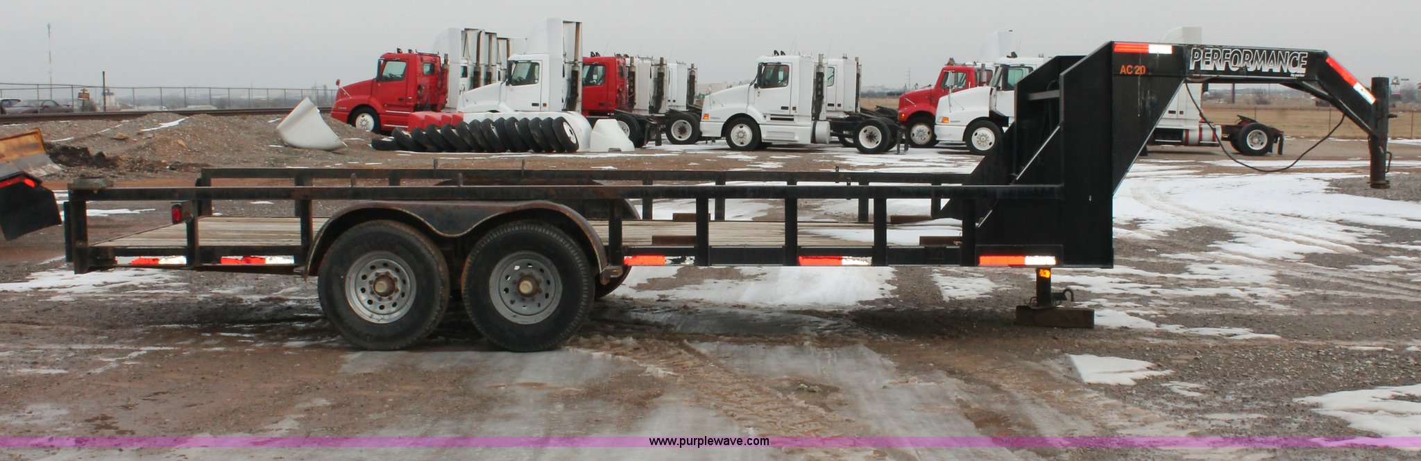 Purple Wave is selling a used Equip. Trailer in Oklahoma. This item is a 2008 Parker Performance tandem axle gooseneck trailer with the following: 20'L deck, 8'L neck, 96"W, 15"H side rails, Steel frame with wood decking, Manual landing gear, 7.50-16ST tires, GVWR 14,400 lbs, GAWR 6,000 lbs