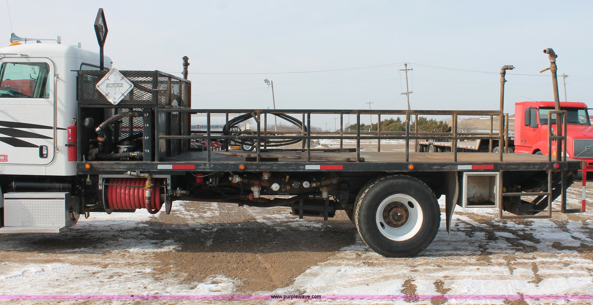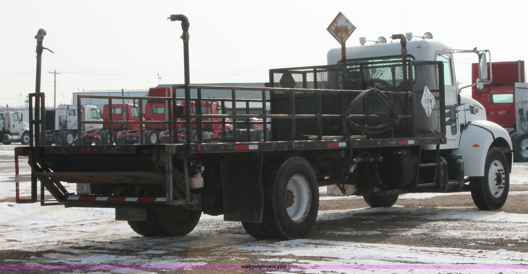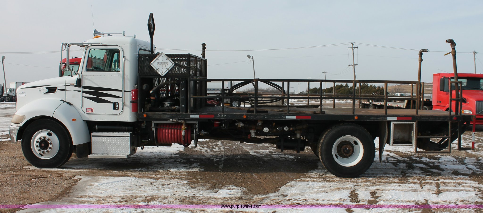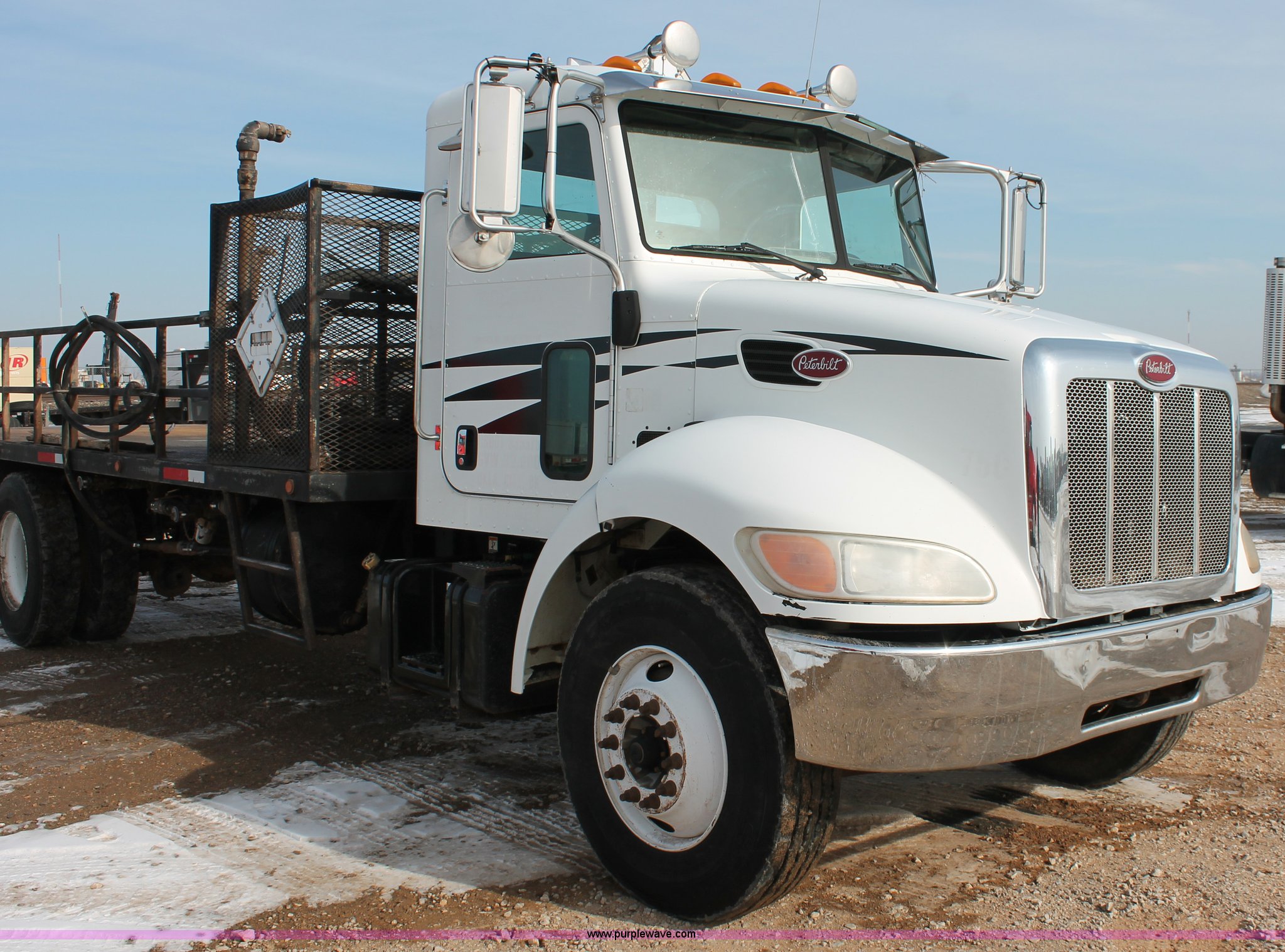Purple Wave is selling a used Flat Bed Truck in Oklahoma. This item is a 2006 Peterbilt 335 flatbed truck with the following: 312,389 miles on odometer, 13,189 hours on meter, Caterpillar C7 Acert 7.2L L6 diesel engine, 300 HP, Eaton Fuller nine speed manual transmission, AC and heat, Tilt, Cruise, AM/FM/cassette, Passenger daylight door, Air suspension seat, Stainless steel diamond plate step up rail, 20' flatbed, Dual oil tanks, Three valve control, Distribution and recovery capabilities, Front, rear, driver's side, and passenger's side shut-off capabilities, Schlumberger pump, 150 gpm, 2" plumbing, Assorted hoses included, Maxon Tuk-A-Way lift gate, 2,500 lbs capacity,, Exterior visor, 50 gallon fuel tank, PTO, Air brakes, 230" wheelbase, 11R22.5 tires, GVWR 33,000 lbs, FAWR 12,000 lbs, RAWR 21,000 lbs
