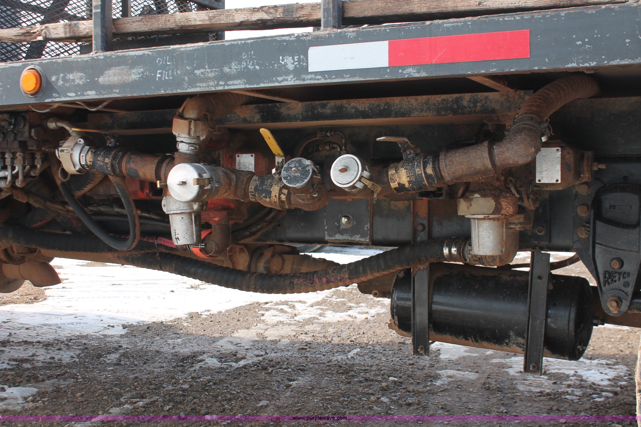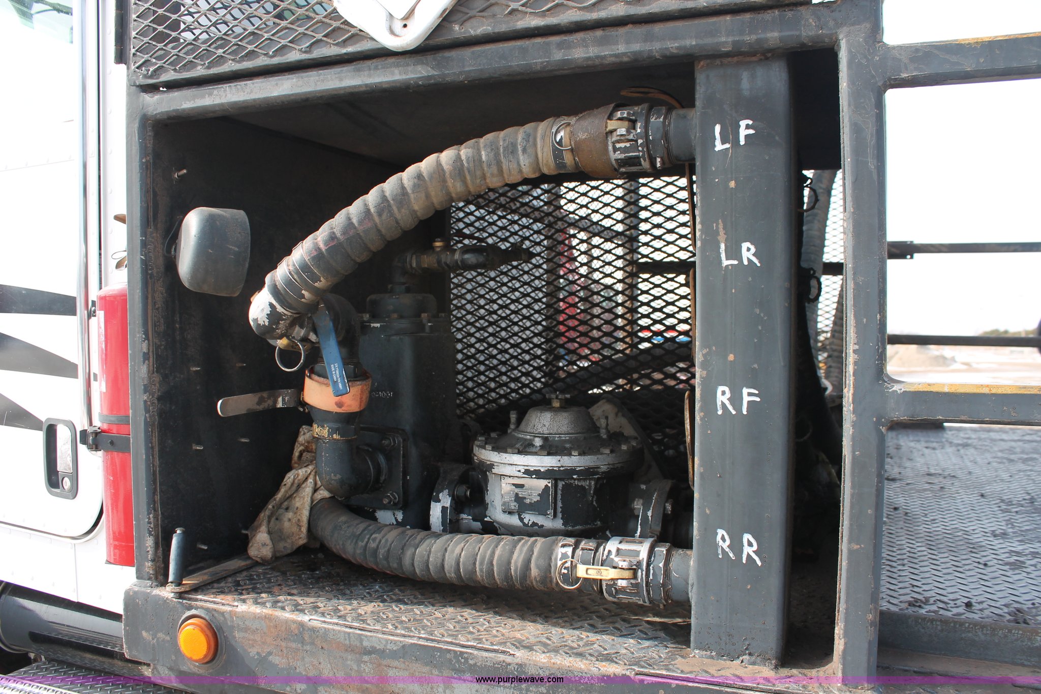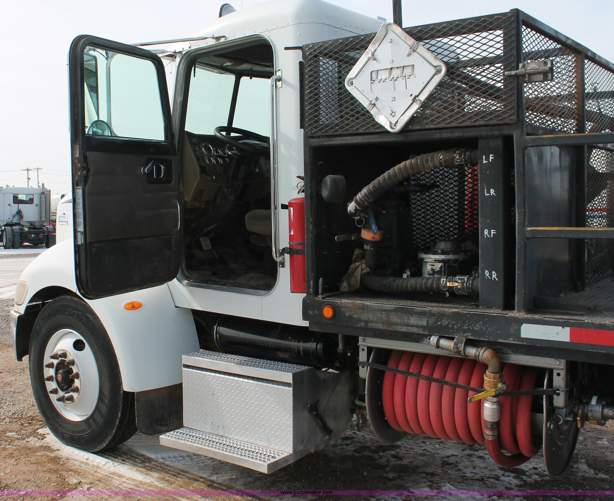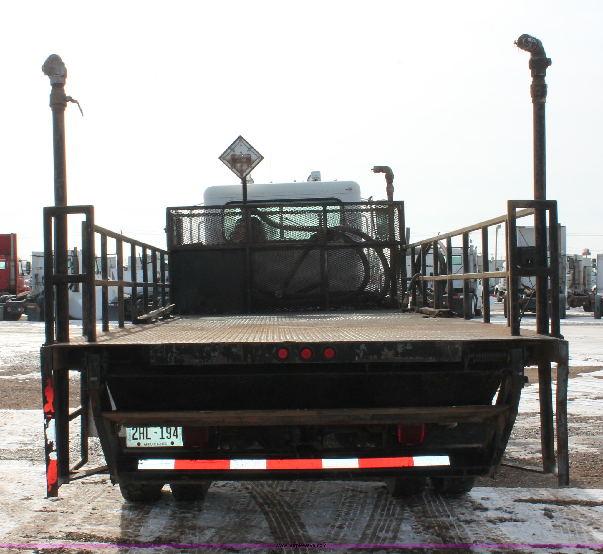 Purple Wave is selling a used Flat Bed Truck in Oklahoma. This item is a 2006 Peterbilt 335 flatbed truck with the following: 312,389 miles on odometer, 13,189 hours on meter, Caterpillar C7 Acert 7.2L L6 diesel engine, 300 HP, Eaton Fuller nine speed manual transmission, AC and heat, Tilt, Cruise, AM/FM/cassette, Passenger daylight door, Air suspension seat, Stainless steel diamond plate step up rail, 20' flatbed, Dual oil tanks, Three valve control, Distribution and recovery capabilities, Front, rear, driver's side, and passenger's side shut-off capabilities, Schlumberger pump, 150 gpm, 2" plumbing, Assorted hoses included, Maxon Tuk-A-Way lift gate, 2,500 lbs capacity,, Exterior visor, 50 gallon fuel tank, PTO, Air brakes, 230" wheelbase, 11R22.5 tires, GVWR 33,000 lbs, FAWR 12,000 lbs, RAWR 21,000 lbs