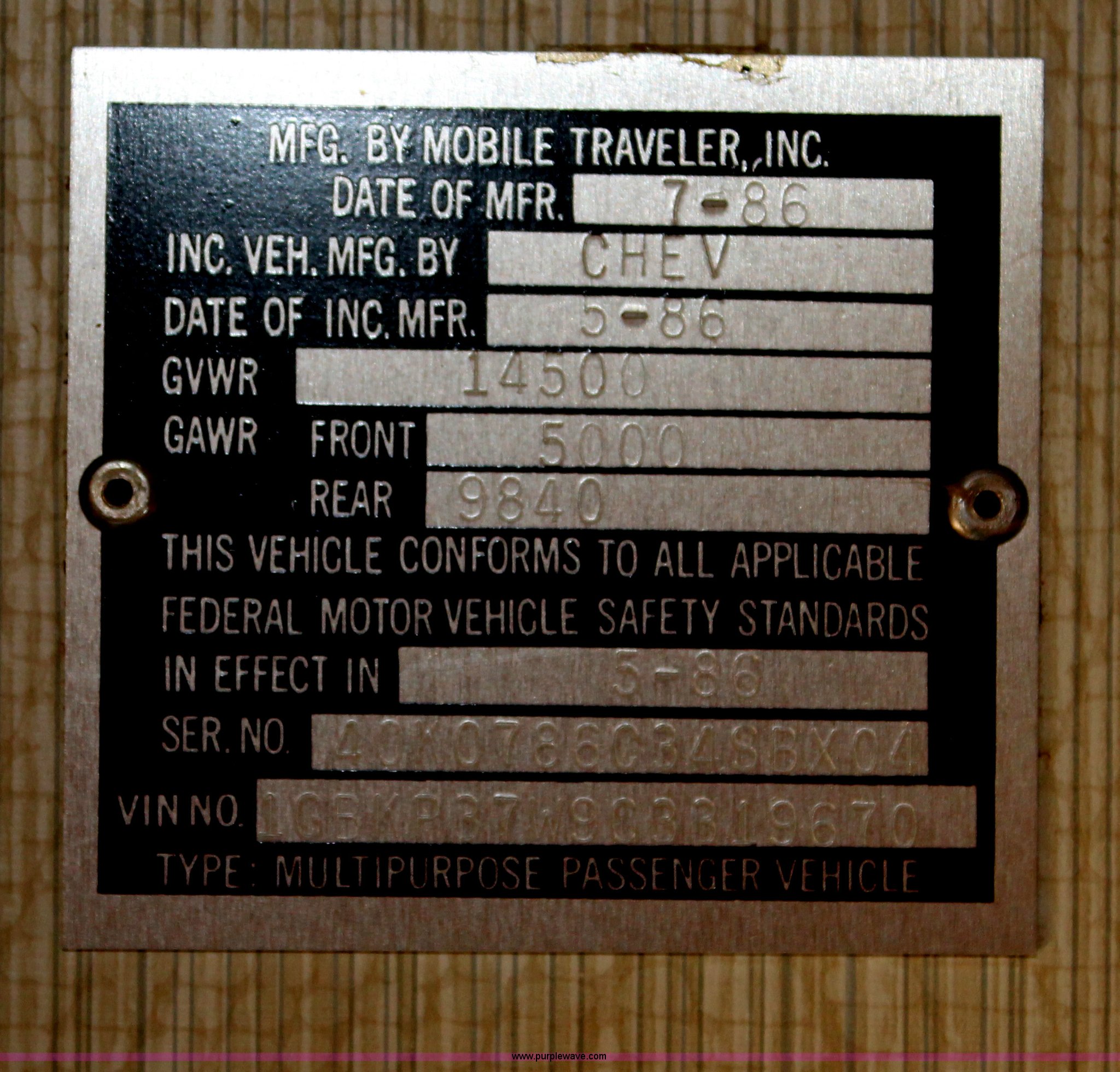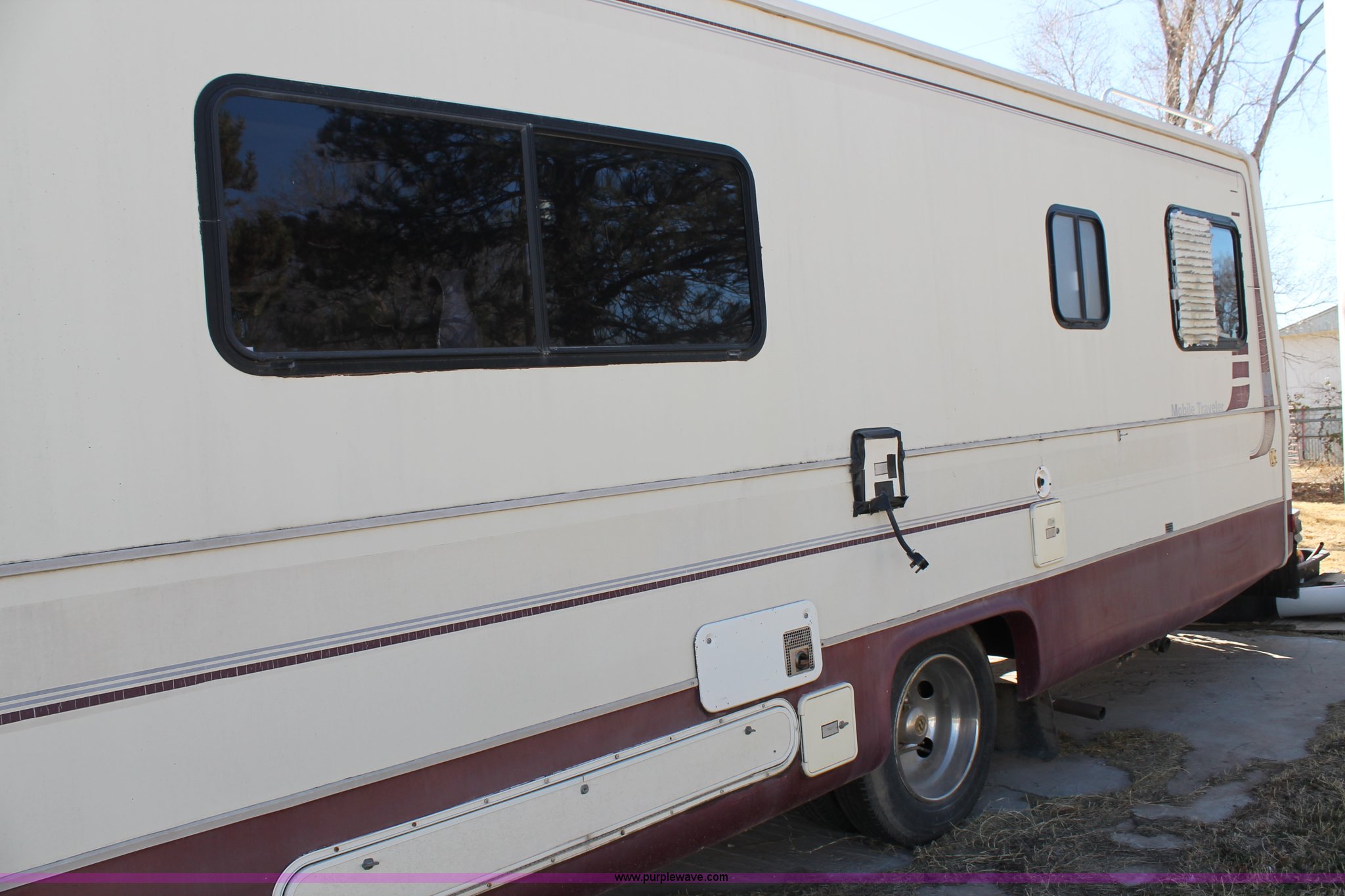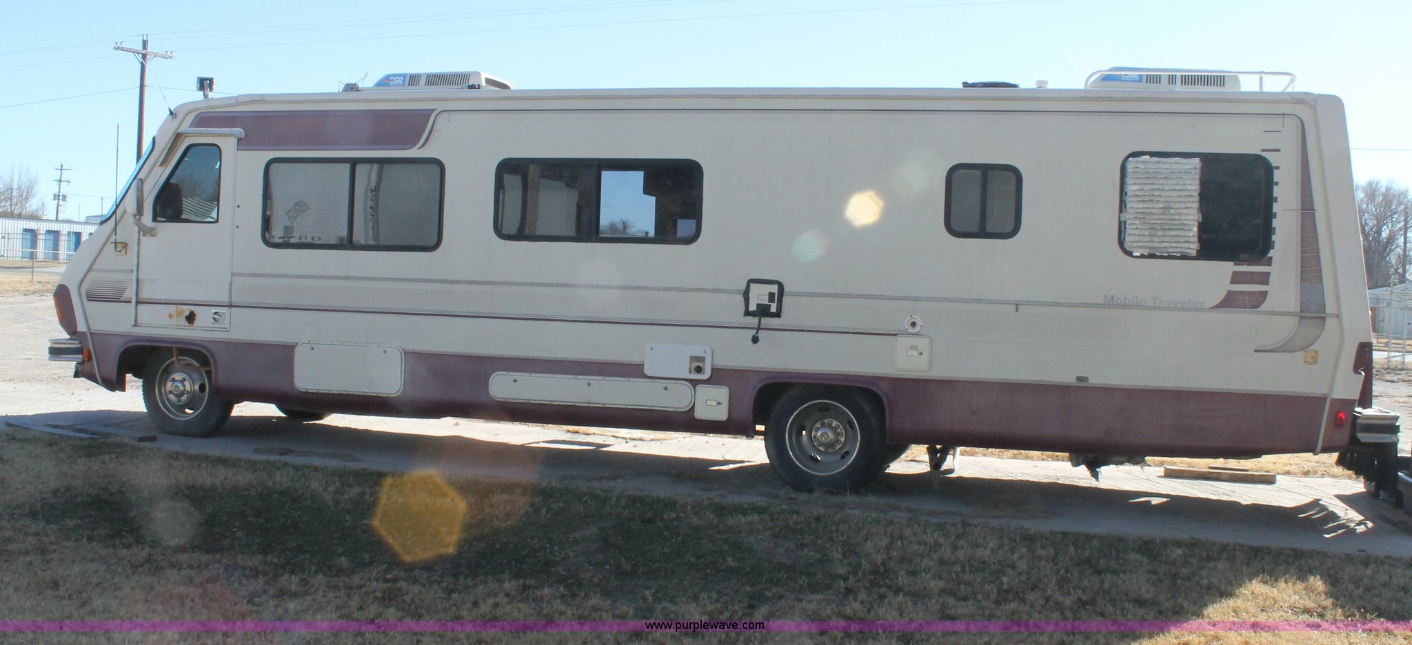 Purple Wave is selling a used RV in Texas. This item is a 1987 Chevrolet P30 Mobile Traveler 31' motorhome with the following: 76,806 miles on odometer, Chevrolet 454 C.I.D. V8 gas engine, Automatic transmission, AC and heat, On-board generator, Sink, Stove, Refrigerator, Overhead storage throughout, Full size shower, Bedroom, Couch folds into bed, Dining seats fold into bed, Bathroom, Sink and toilet, Front captains chairs, AM/FM/cassette, CB radio, Chrome wheels, 8R19.5 tires, GVWR 14,500 lbs, FAWR 5,000 lbs, RAWR 9,800 lbs