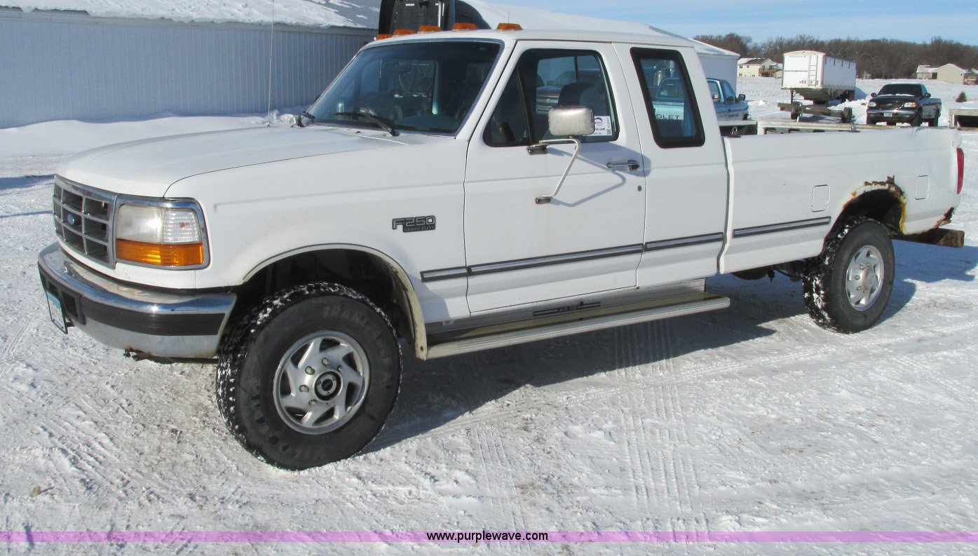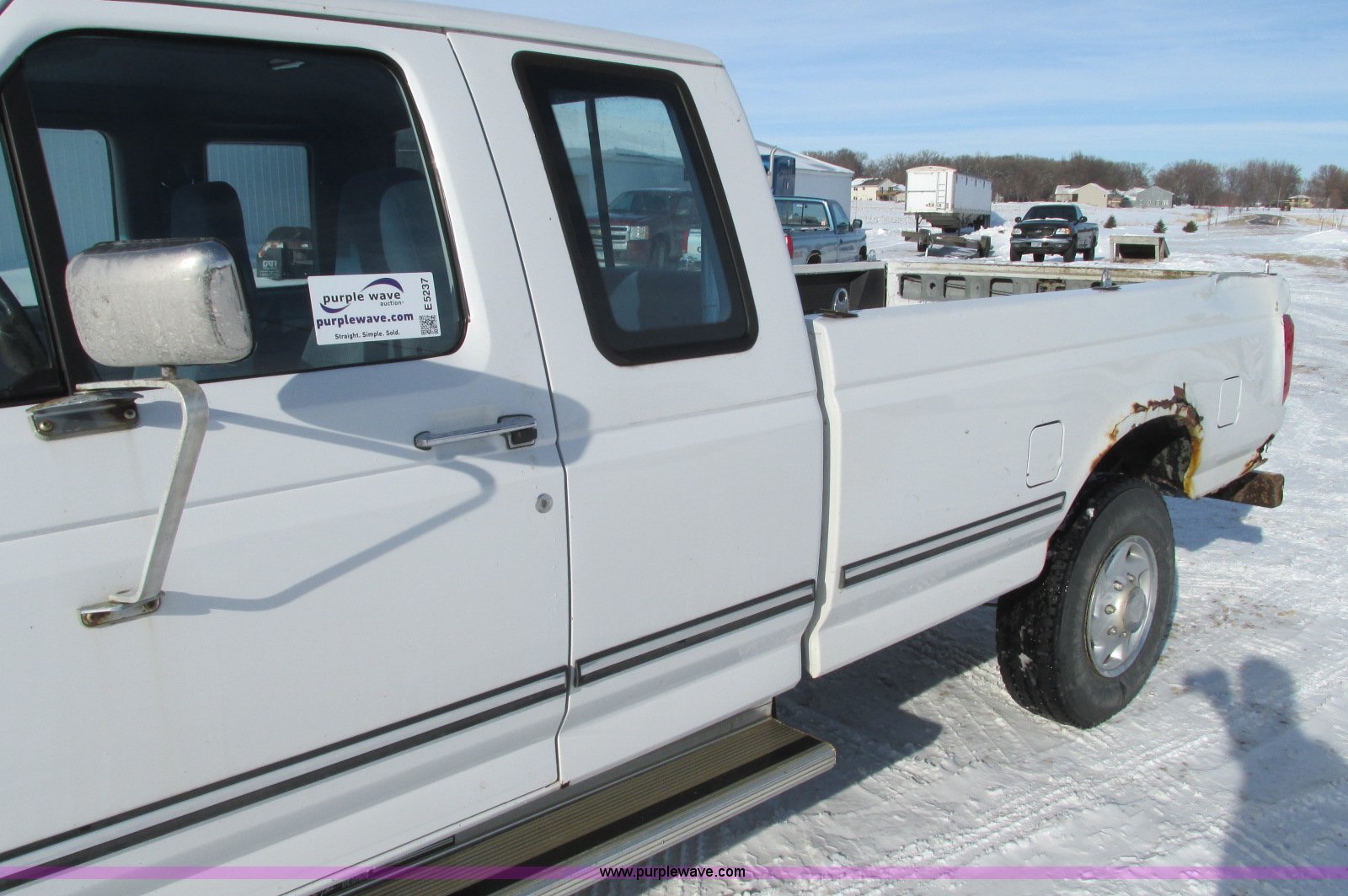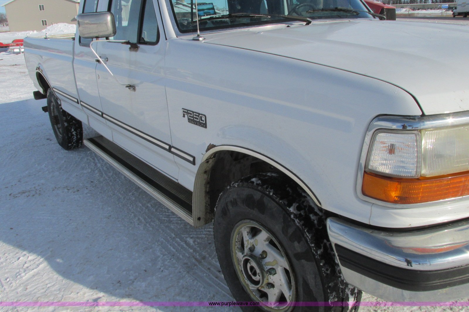 Purple Wave is selling a used 3/4 or 1 Ton Pickup or Van in Minnesota. This item is a 1997 Ford F250 SuperCab pickup truck with the following: 173,186 actual miles, 7.5L V8 VIH 16V gas engine, Automatic transmission, Four wheel drive, AC and heat, Tilt, Cruise, AM/FM/cassette, Power windows and locks, Power lumbar only, Cloth interior, Roof lights, Running boards, Long bed, Fifth wheel ball, Bed liner, P&H Manufacturing heavy duty rear bumper, Trailer wiring, LT235/85R16 tires, Body damage, Body rust, Driver's door does not seal, ABS warning light on, Tailgate mechanism broken, Dual fuel tanks