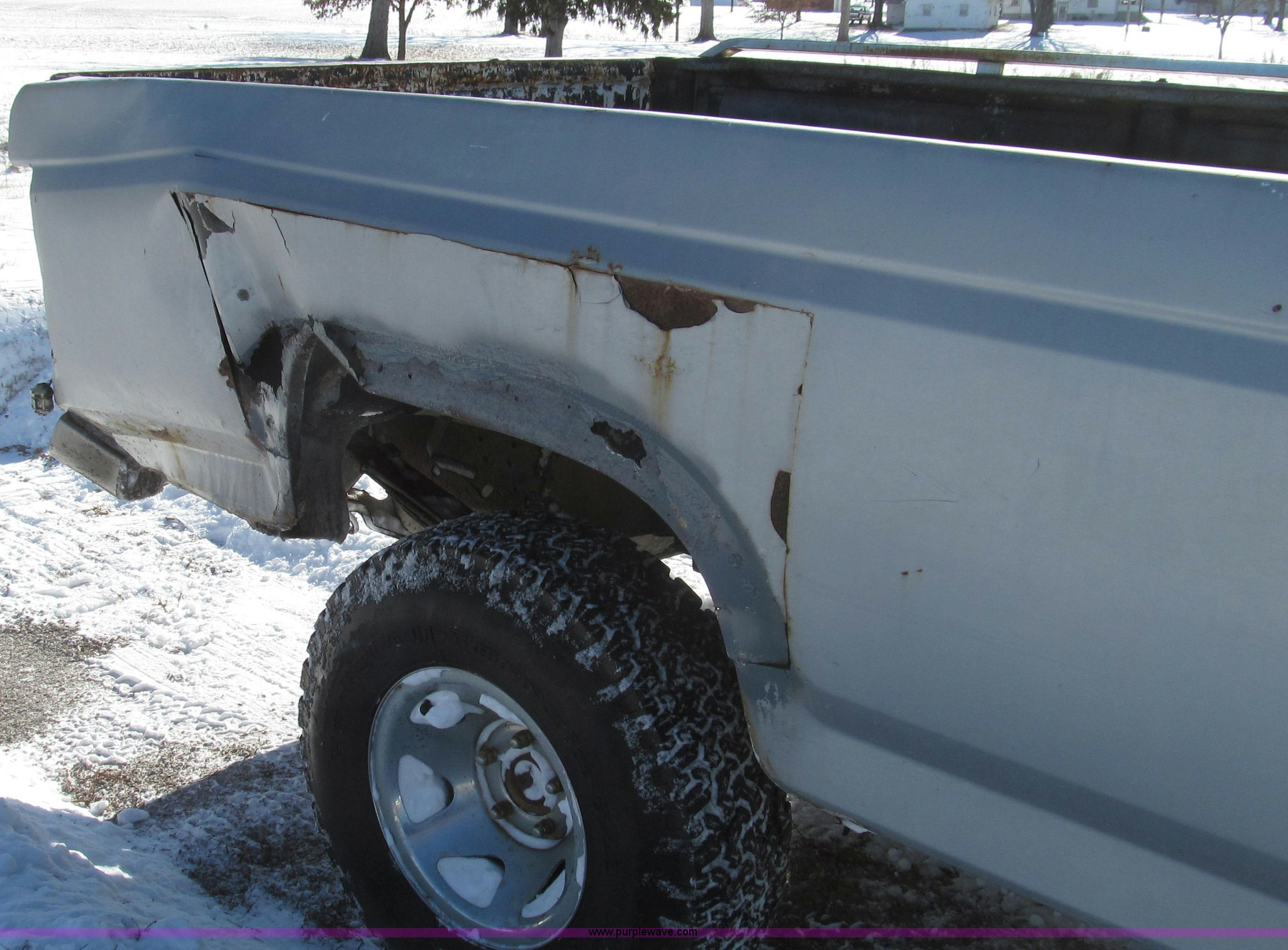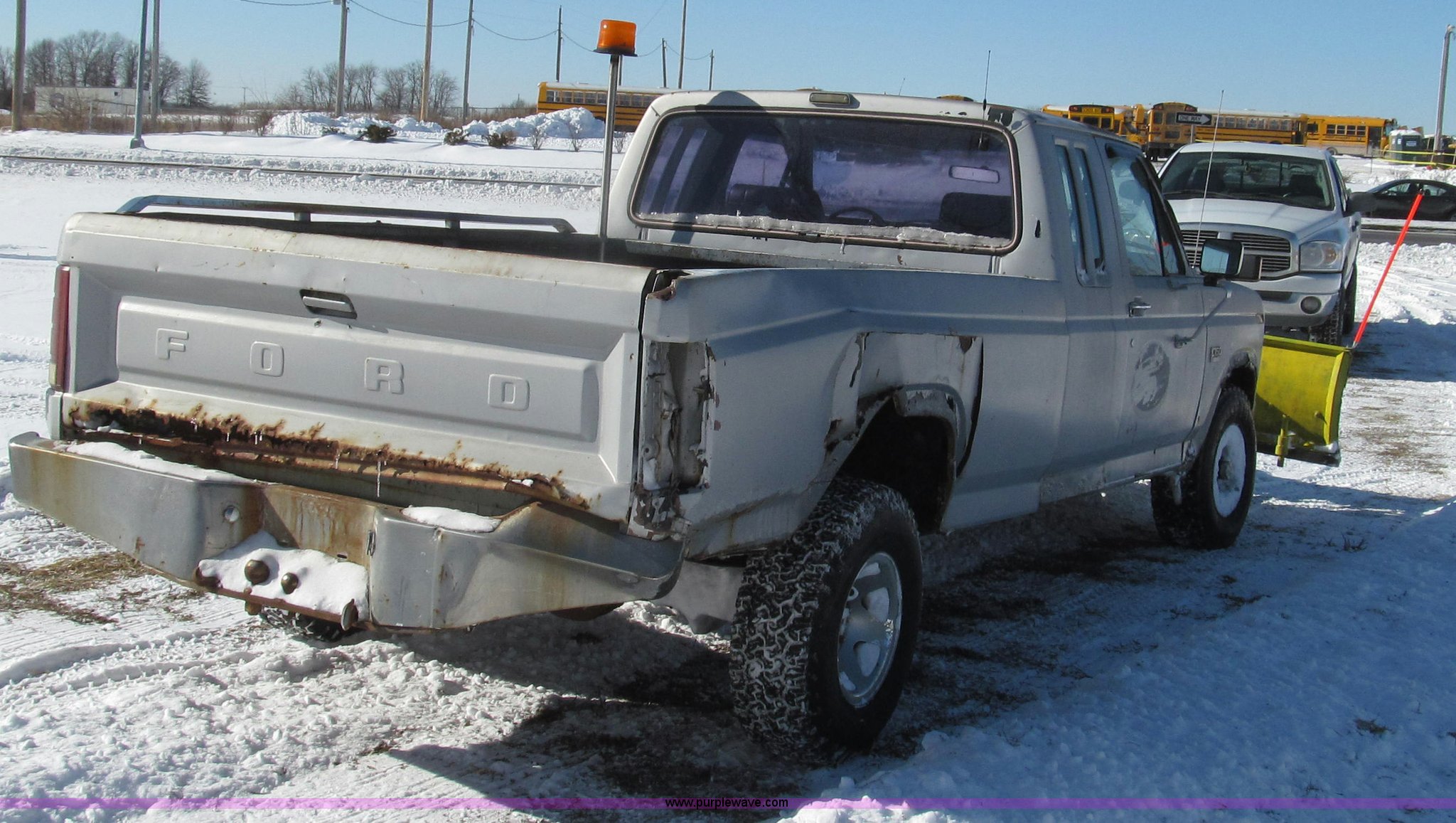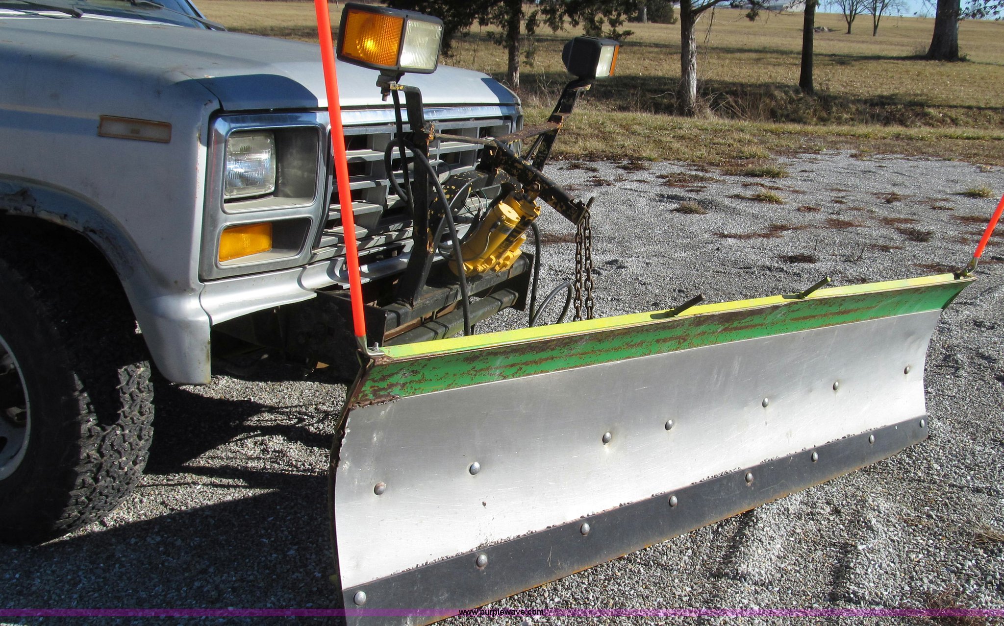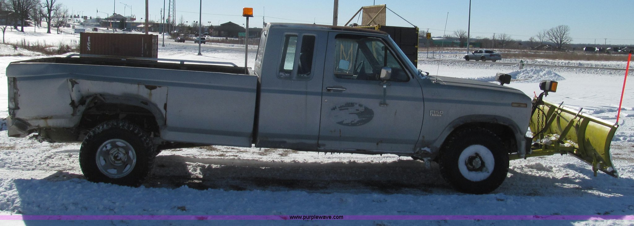 Purple Wave is selling a used 1/2 Ton Pickup or Van in Missouri. This item is a 1984 Ford F150 XLT SuperCab pickup truck with the following: 44,428 miles on odometer, Mileage will vary, unit in use, 5.8L V8 OHV 16V gas engine, Automatic transmission, Four wheel drive, AC and heat, Unknown operating condition of AC, AM/FM/CD, Power windows and seats, Power windows inoperable, Vinyl and cloth interior, Amber caution light, Long bed, Meyer snow plow, 90"W, Electric over hydraulic, In-cab controls, Raise, lower, and tilt, Joystick controls, Bolt-on cutting edge, Dual fuel tanks, Trailer wiring, 31x10.00-15 tires, Recently replaced front lock-out hubs, Interior/exterior cosmetic damage, Exterior rust, Headliner torn, Right rear quarter panel, tail light, and bumper damage