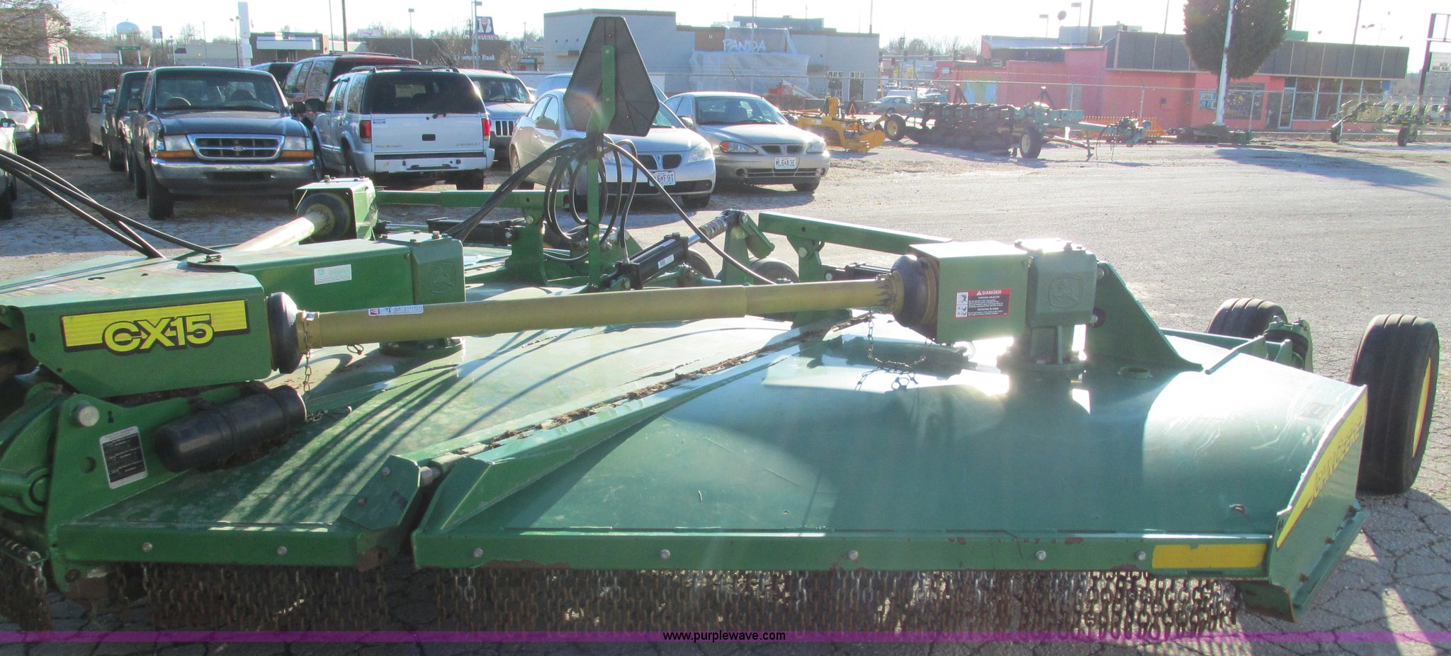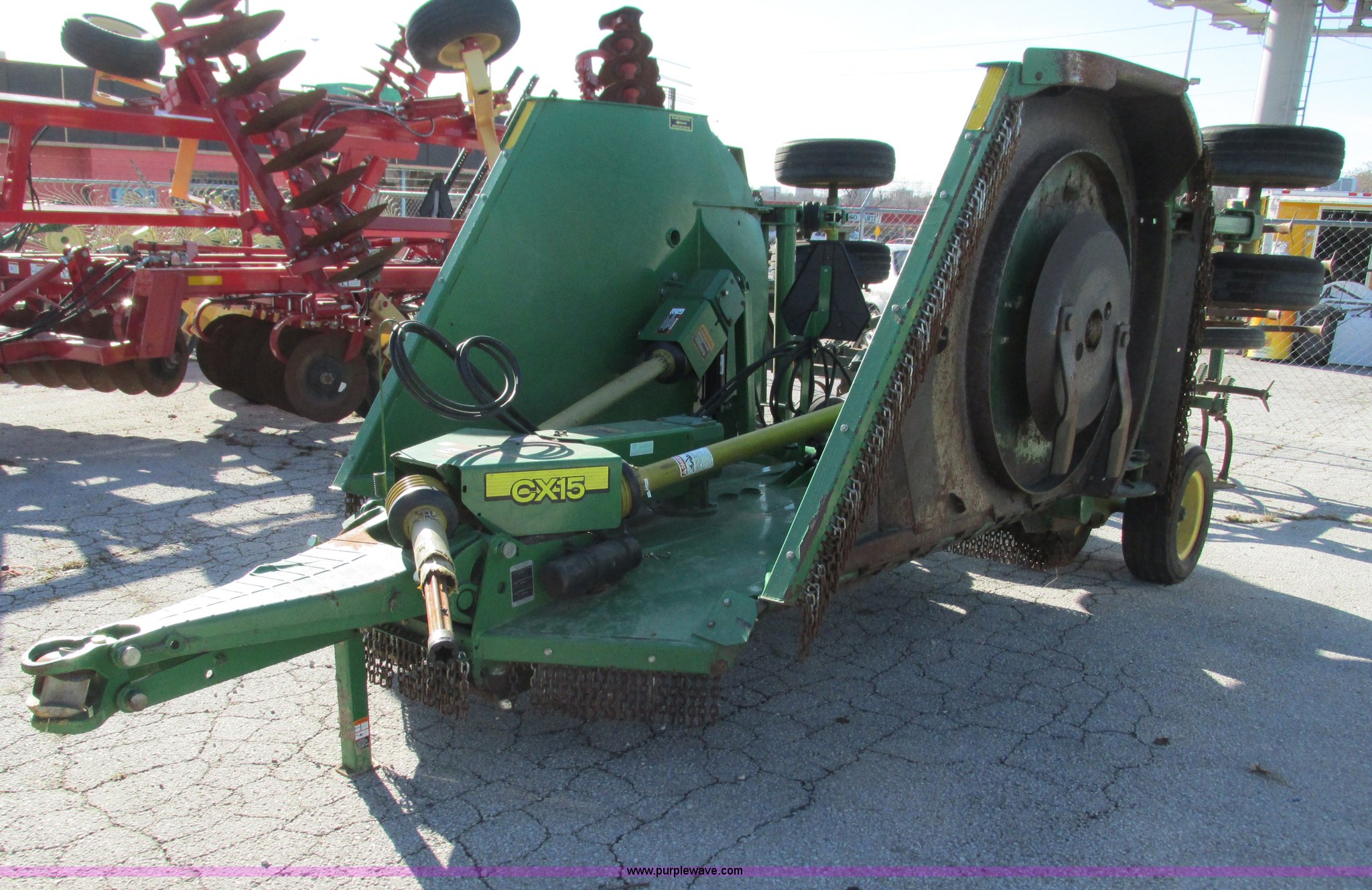 2009 John Deere CX15 batwing mower. 15'W, Pin hitch, Pins included, 12.5-15 tires, Recently replaced PTO shaft and safety shields installed, Owner/operators manual included, Serial W0CX15E007638. Nitsch Cattle Feeders. Springfield, MO 65809