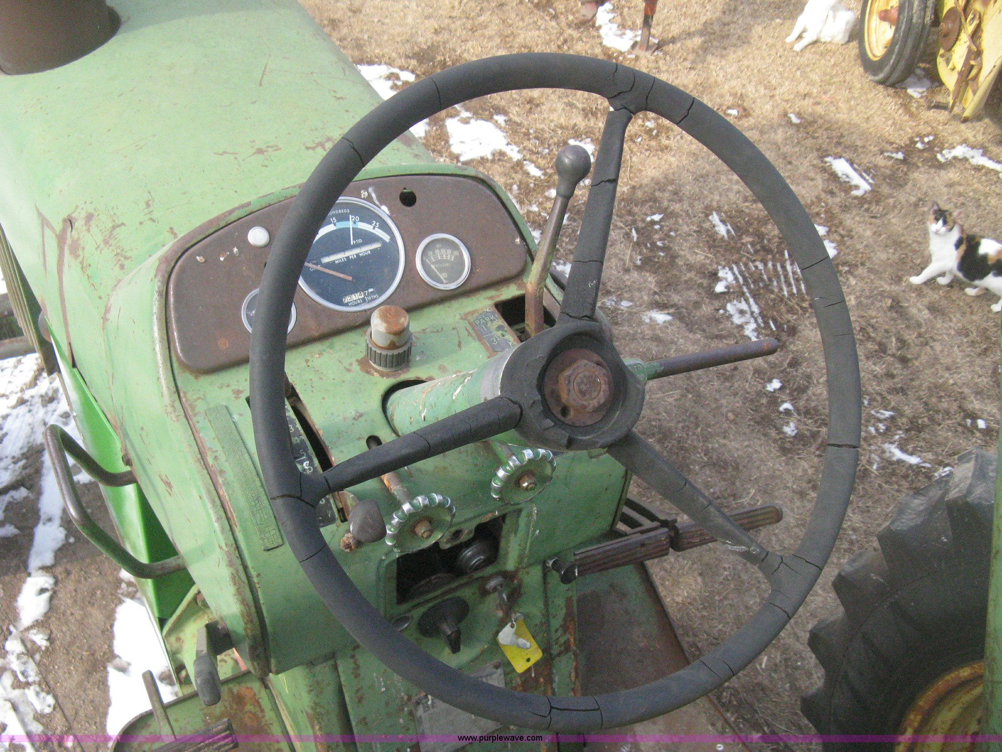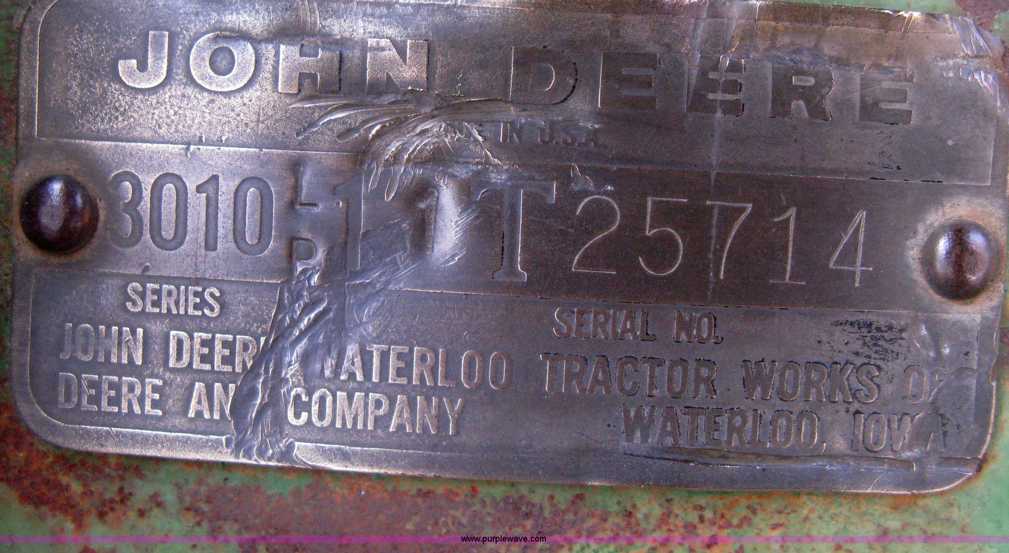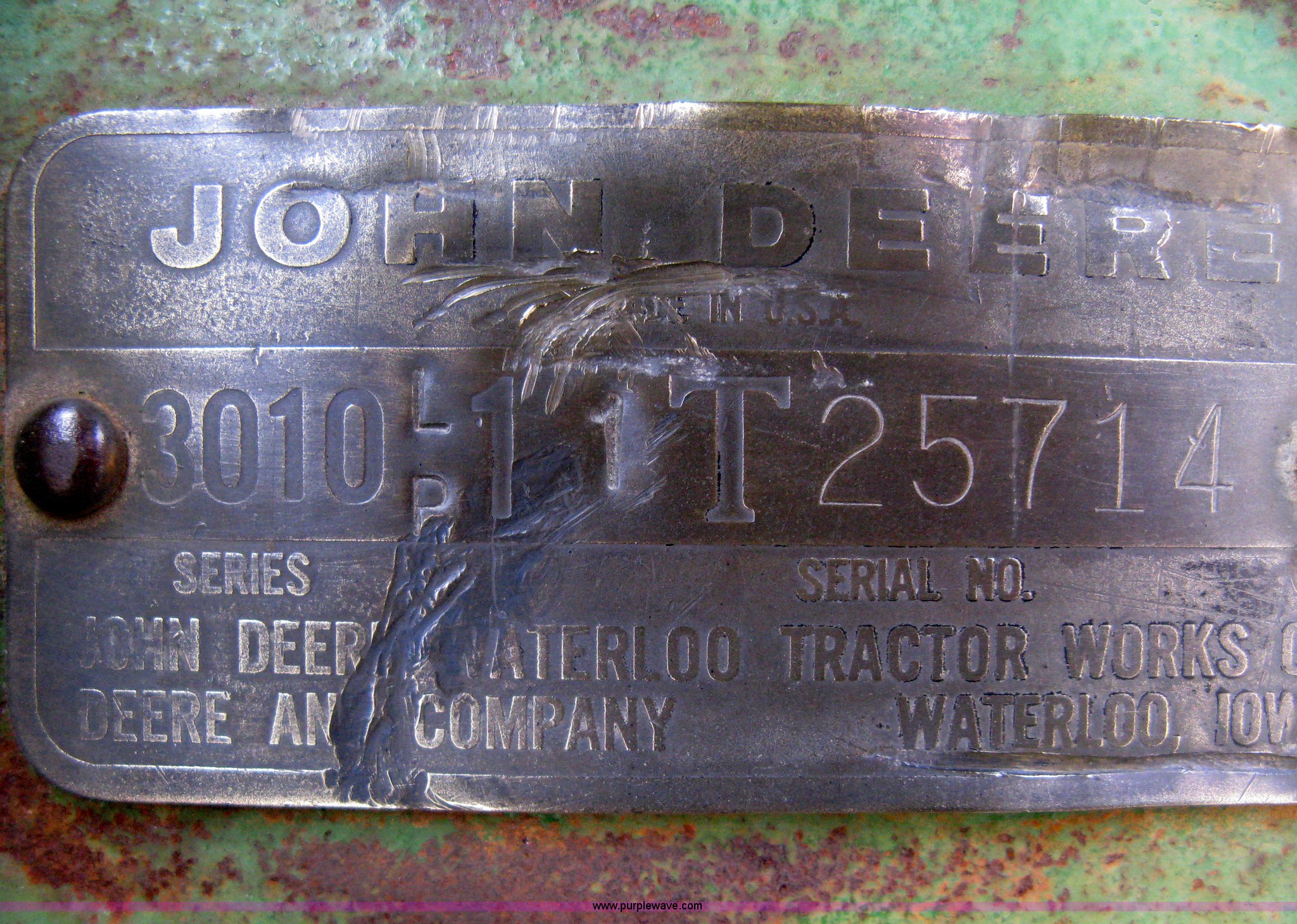 Purple Wave is selling a used Tractor in Kansas. This item is a 1962 John Deere 3010 tractor with the following: 7,314 hours on meter, Four cylinder LP engine, Eight speed transmission, Two speed reverse, Three point, Top link included, Draw bar, 540 PTO, Rear hydraulic remotes, Akuret 7.5L-15 front tires, Titan 15.5-28 rear tires, Recently replaced tires and seat, Regulator needs some work, Serial 3010-11T25714