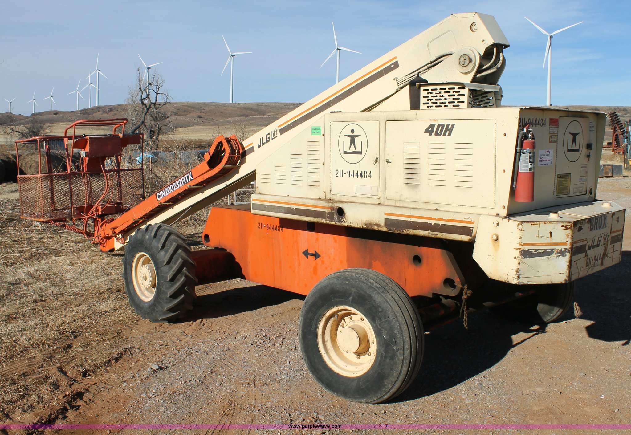 Purple Wave is selling a used Boom Lift in Oklahoma. This item is a 1990 JLG 40H boom lift with the following: 4,274 hours on meter, German Deutz diesel engine, Three stick control, 42 HP, 4.5 mph travel speed, 40' platform height, 46' work height, 33' horizontal outreach, 500 lbs platform capacity, 3' x 4'11" platform size, 7'11" overall width, 2'10" tail swing, 25'2"L x 7'10"H stoved, 92" wheelbase, 11" ground clearance, GVW 11,600 lbs, 12.5L-15 rib front tires, 12.5L-15 rear tires, Serial 0309013702