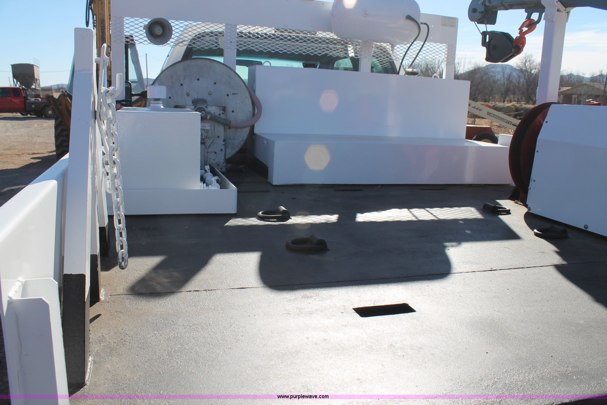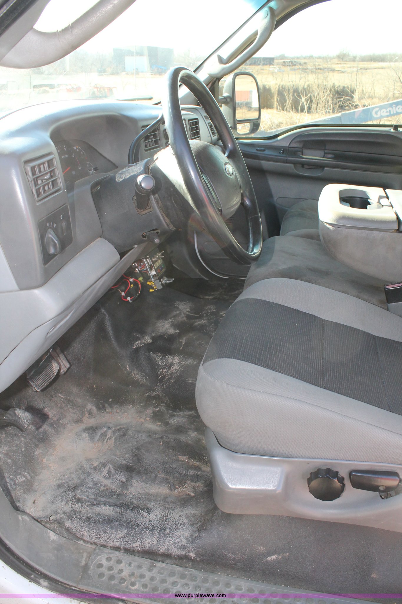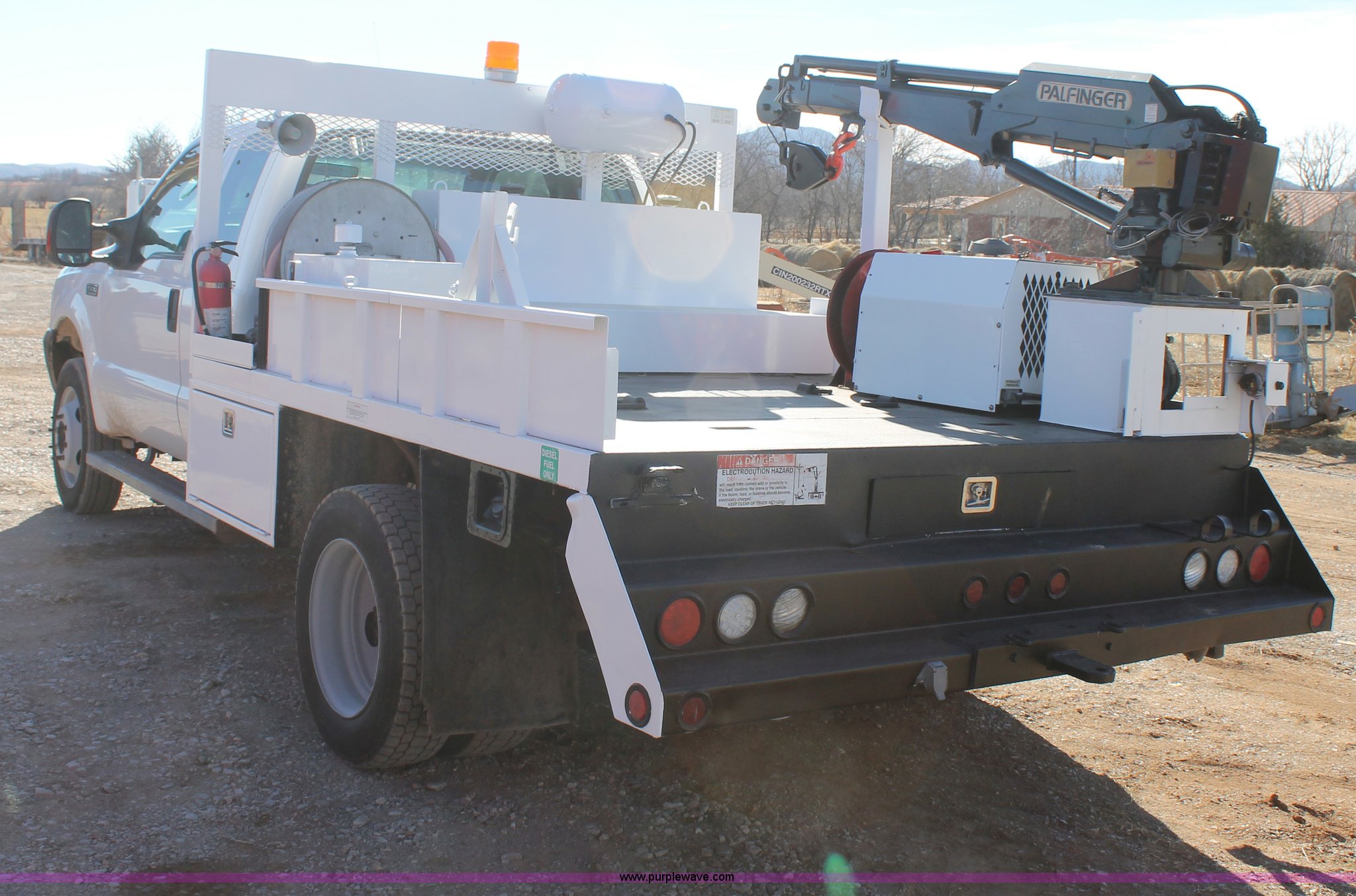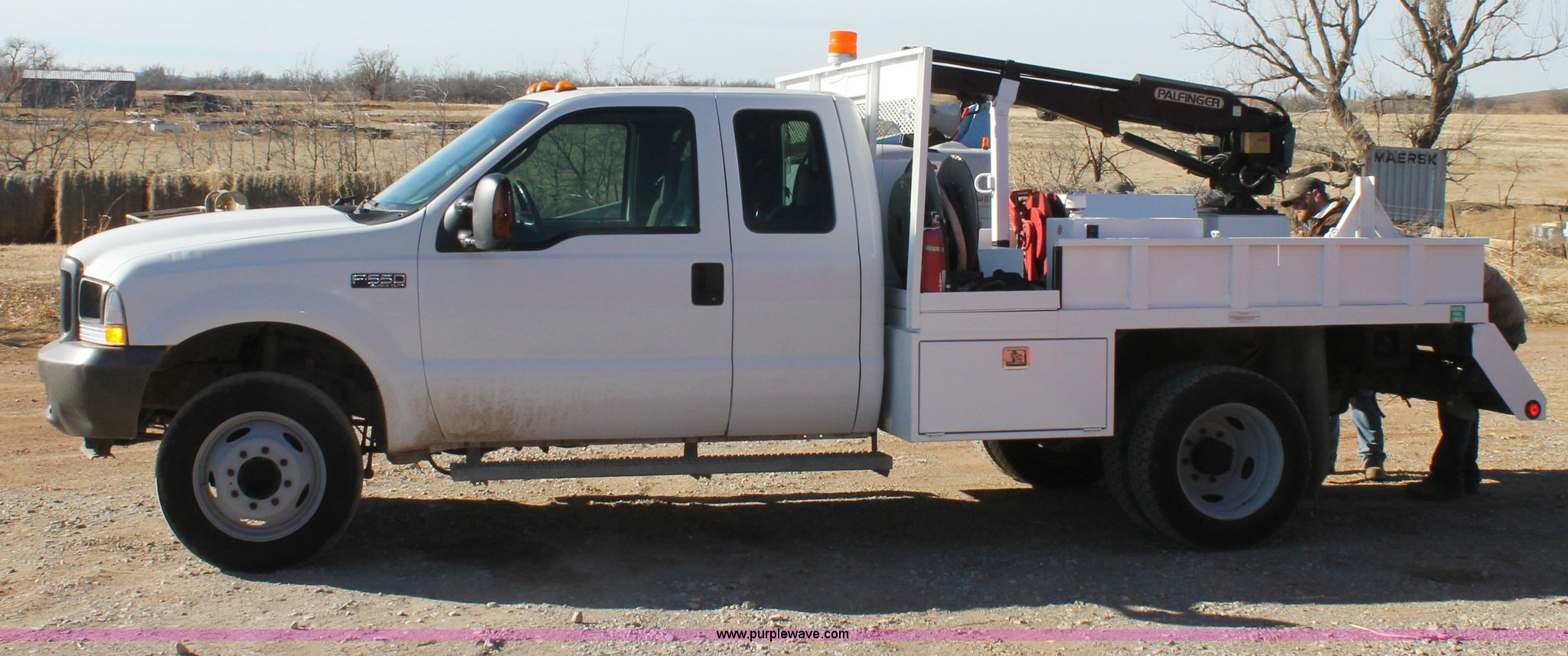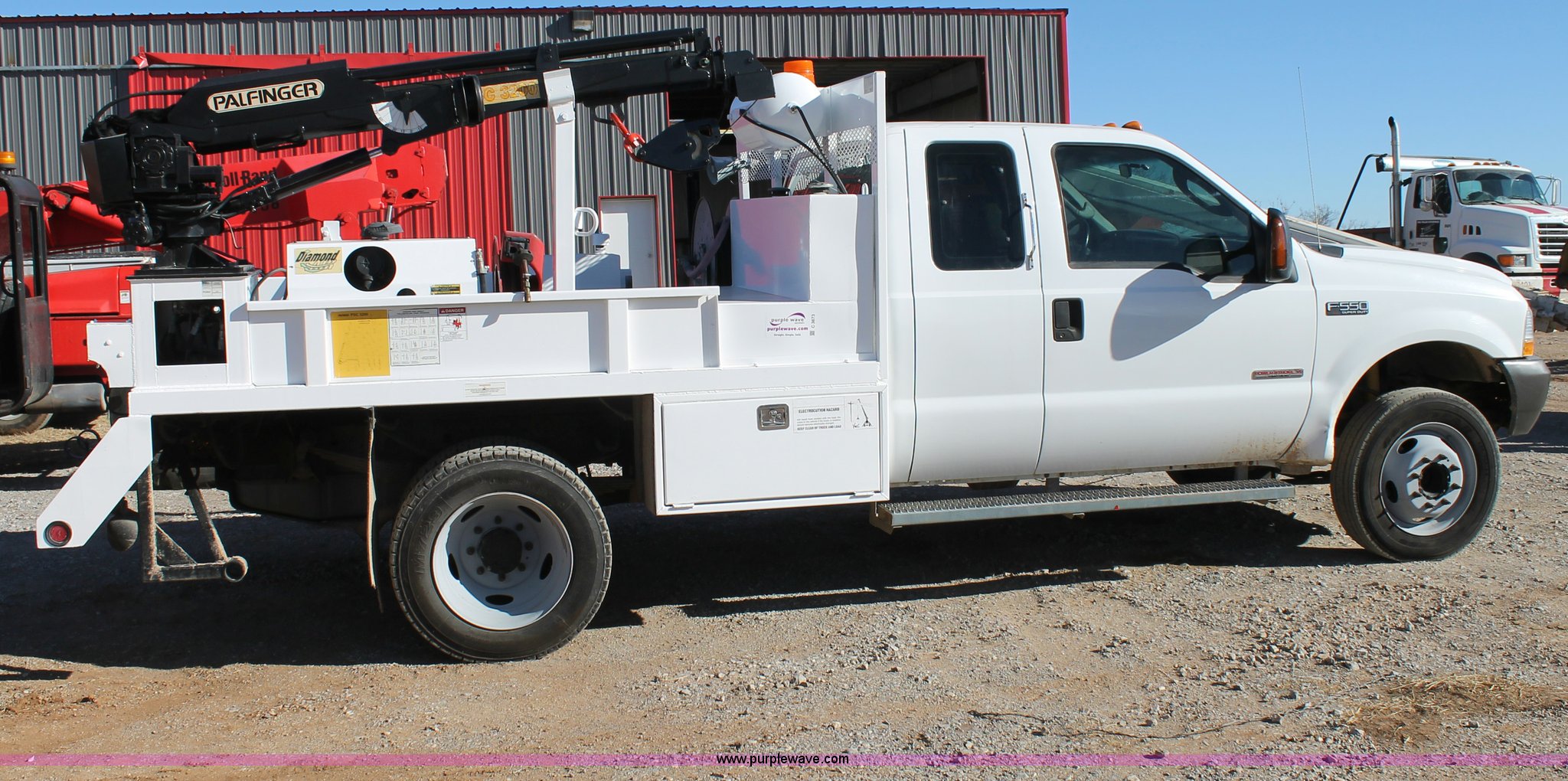 Purple Wave is selling a used Service Truck in Oklahoma. This item is a 2004 Ford F550 SuperCab utility truck with the following: 182,309 actual miles, 6.0L V8 OHV 32V turbo diesel engine, Automatic transmission, AC and heat, Tilt, Cruise, AM/FM/cassette, Power windows, locks, and mirrors, Cloth interior, Utility bed, Palfinger PSC3200 crane, 18' max height, 15' max reach, 3,200 lbs max lift, Diamond air hydraulic air compressor, Fuel tank with filler hose on reel, (2) side mounted under bed toolboxes, Amber roof mounted caution light, Rear under bed compartment, Hydraulic tank, Bed tide down rings, Chelsea PTO operated by in-cab switch, Trailer wiring, 225/70R19.5 tires
