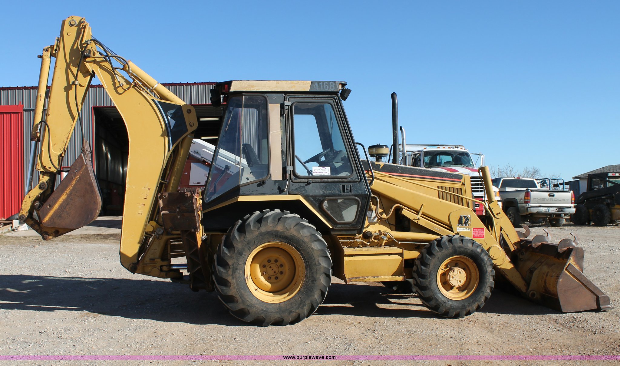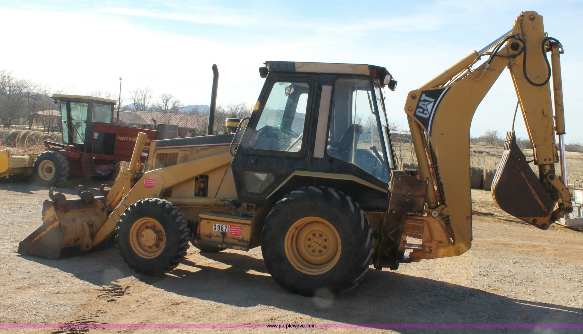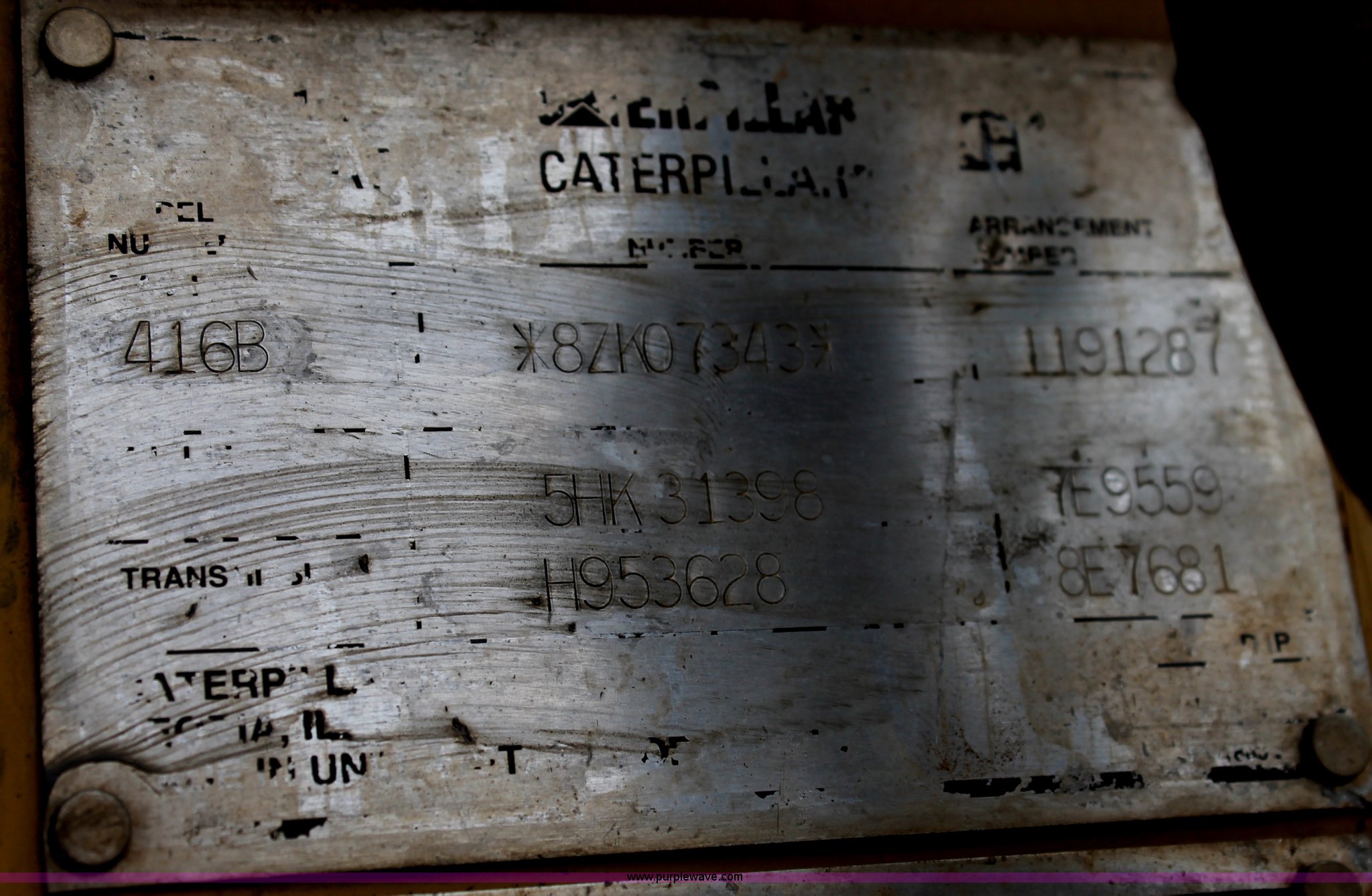 Purple Wave is selling a used Tractor Loader Backhoe in Oklahoma. This item is a 1995 Caterpillar 416B backhoe with the following: 6,647 hours on meter, Caterpillar 3054 268 C.I.D. four cylinder diesel engine, 74 HP, Serial 5HK31398, Four speed manual transmission, Four wheel drive, AC and heat, Backup alarm, Spring suspension seat, Windshield wipers, Tilt steering wheel, Front and rear work lights, 7'W bucket, Bolt-on cutting edge, Bucket leveler, Extendable stick, 2'W bucket, Teeth, Drive train guards, Firestone/Titan 12.5/80-18 front tires, Firestone 19.5L-24 rear tires, 13,700 lbs. base operating weight, Serial 8ZK07343