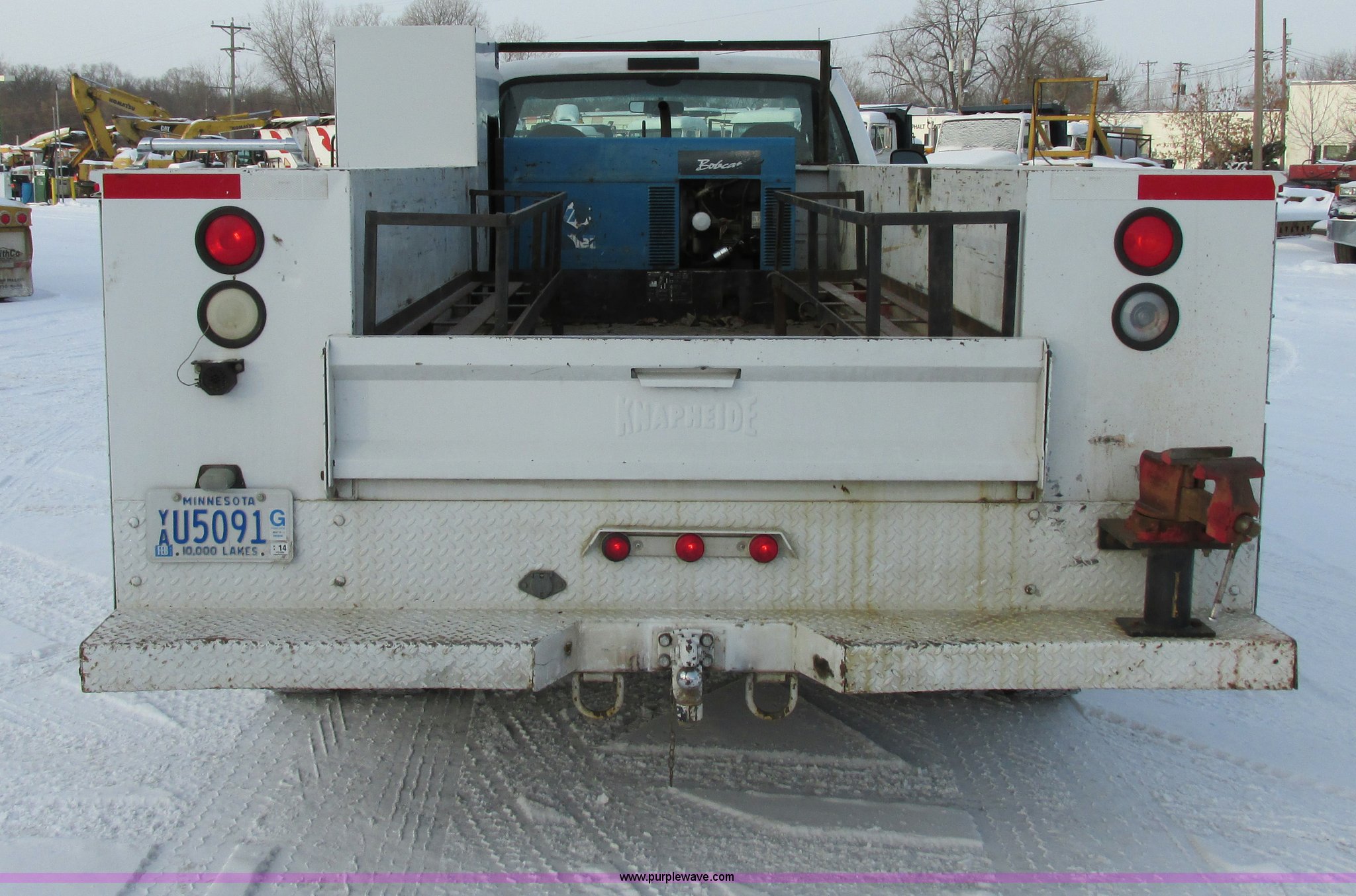Purple Wave is selling a used Service Truck in Minnesota. This item is a 1999 Ford F450 Super Duty XL utility truck with the following: 204,392 actual miles, 7.3L V8 OHV 16V turbo diesel engine, Six speed manual transmission, AC and heat, AM/FM, Manual windows and locks, Cloth interior, Block heater, Backup alarm, Knapheide 11' steel utility bed, Miller Bobcat 225 generator/welder, 132 hours on meter, Leads, 8,000 watts, Rear bumper vise, Serial KK020202, Receiver hitch, Trailer wiring, 225/70R19.5 tires, Service records available by request, Cosmetic damage to bed, Unit# 1121