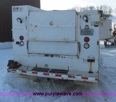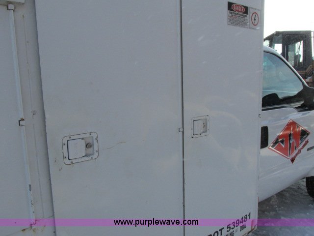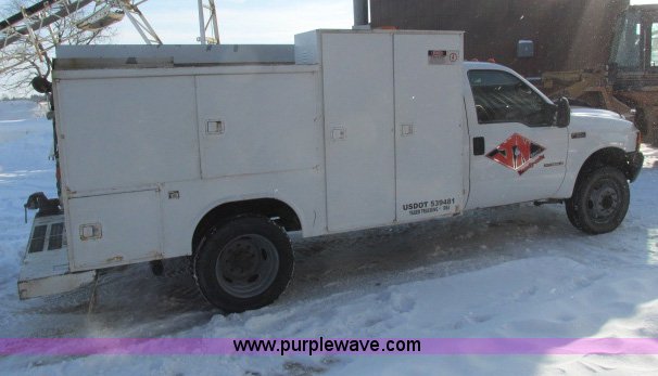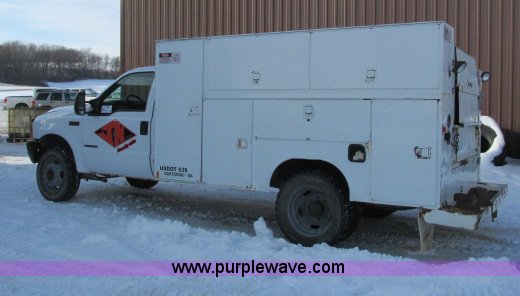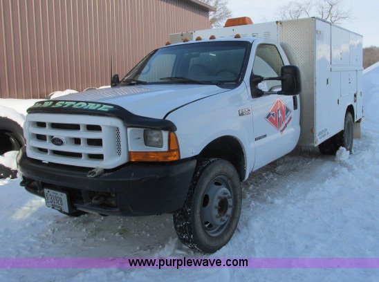 Purple Wave is selling a used Service Truck in Wisconsin. This item is a 2000 Ford F550 utility truck with the following: 114,864 miles on odometer, 7.3L V8 OHV 16V turbo diesel engine, Five speed manual transmission, AC and heat, Tilt, Cruise, AM/FM, Manual windows and locks, Vinyl interior, Reading utilty bed, (10) compartments, (4) oil reservoir containers, No pumps, Rear work vise, Receiver hitch, Trailer wiring, 225/75R19.5 tires, Front bumper and fender dented