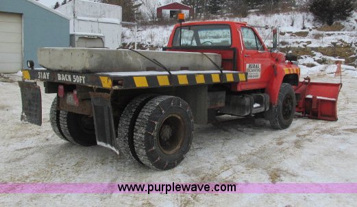 Purple Wave is selling a used Flat Bed Truck in Wisconsin. This item is a 1988 Ford F800 flatbed truck with the following: 138,399 miles on odometer, 7.8L L6 turbo diesel engine, 210 HP, Five speed manual transmission, Two speed rear end, Heat, AM/FM, Manual windows and locks, Spring suspension seat, Block heater, 10'L x 8'W flatbed, 11'W snow plow, Hydraulic angle and height adjustment, 10.00R20 tires