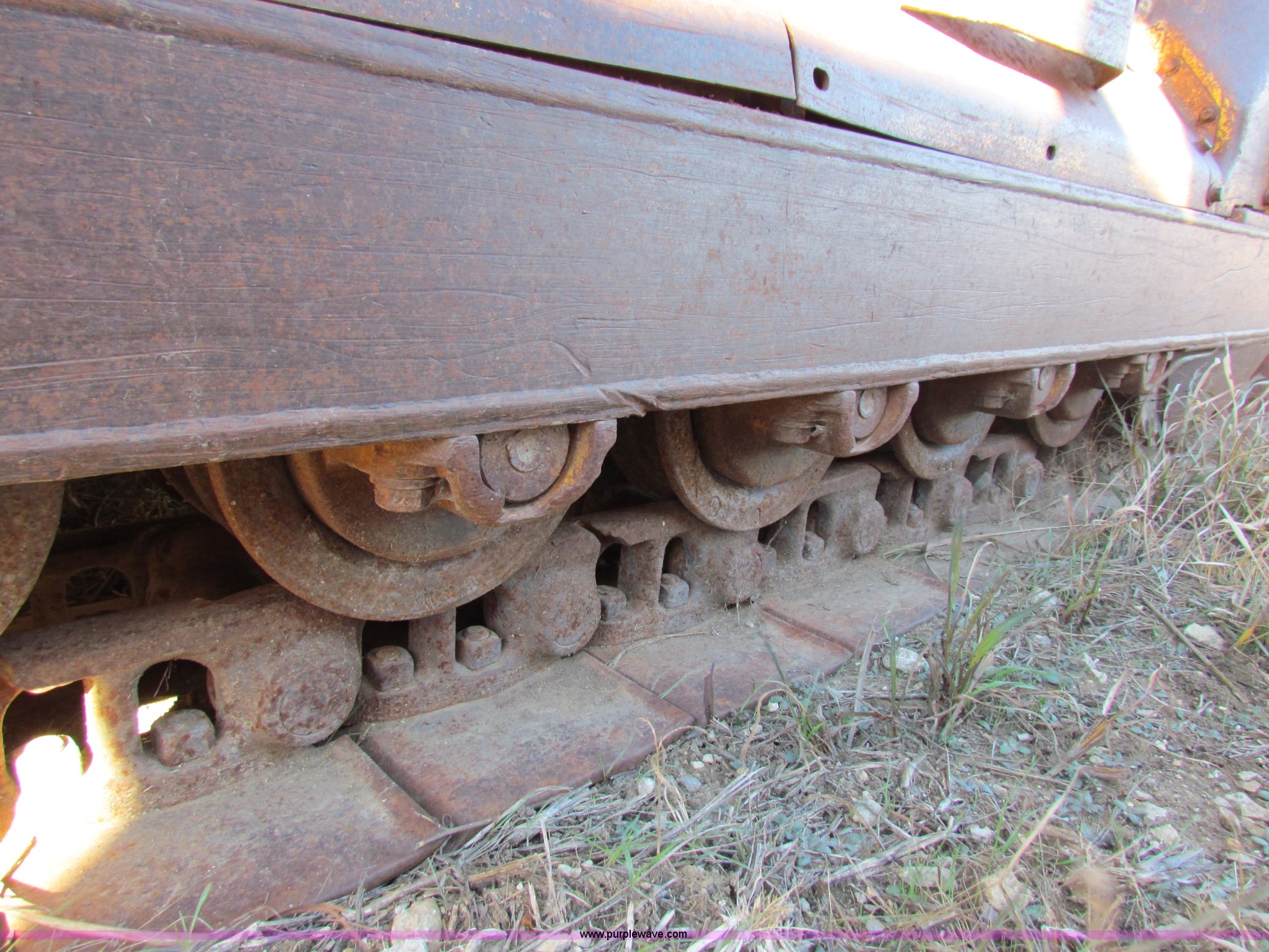 1974 Caterpillar 955L track loader. Approx. 6,240 hours, Four cylinder diesel engine, Three speed powershift transmission, Enclosed cab, 85" eight tooth bucket, Rear pin hitch, (6) bottom rollers, 15" tracks, 33,126 lbs. base operating weight, Needs batteries, Serial 85J8167. Kansas Department of Wildlife and Parks. Reading, KS 66868
