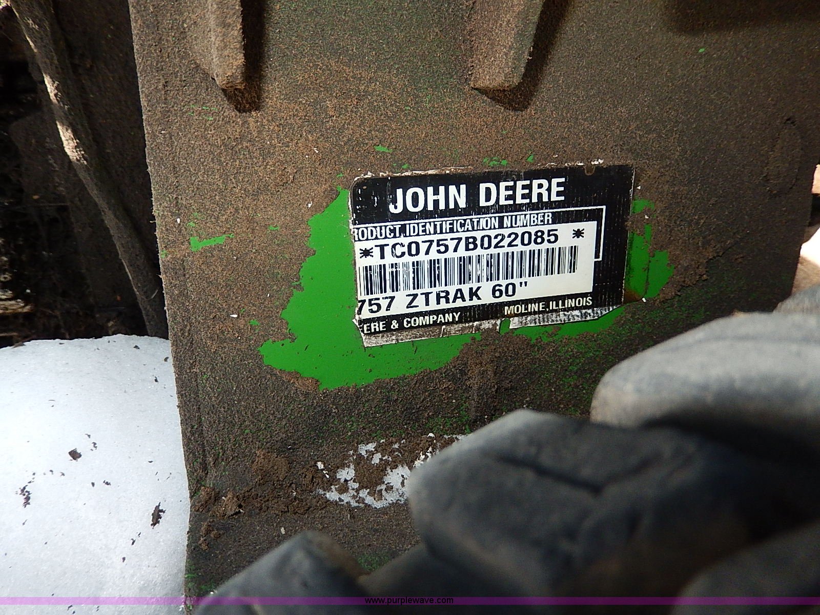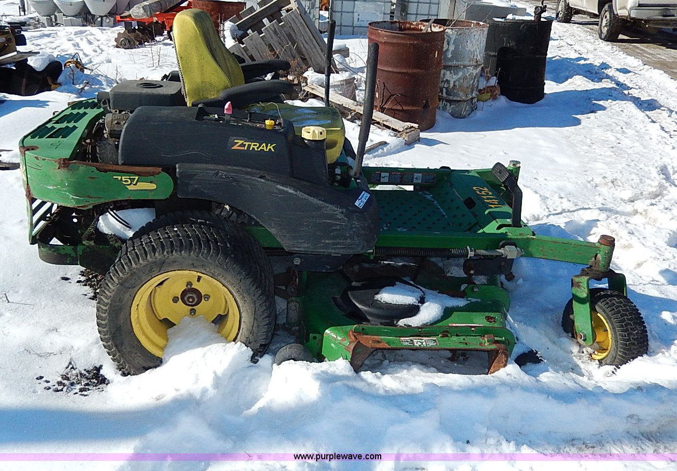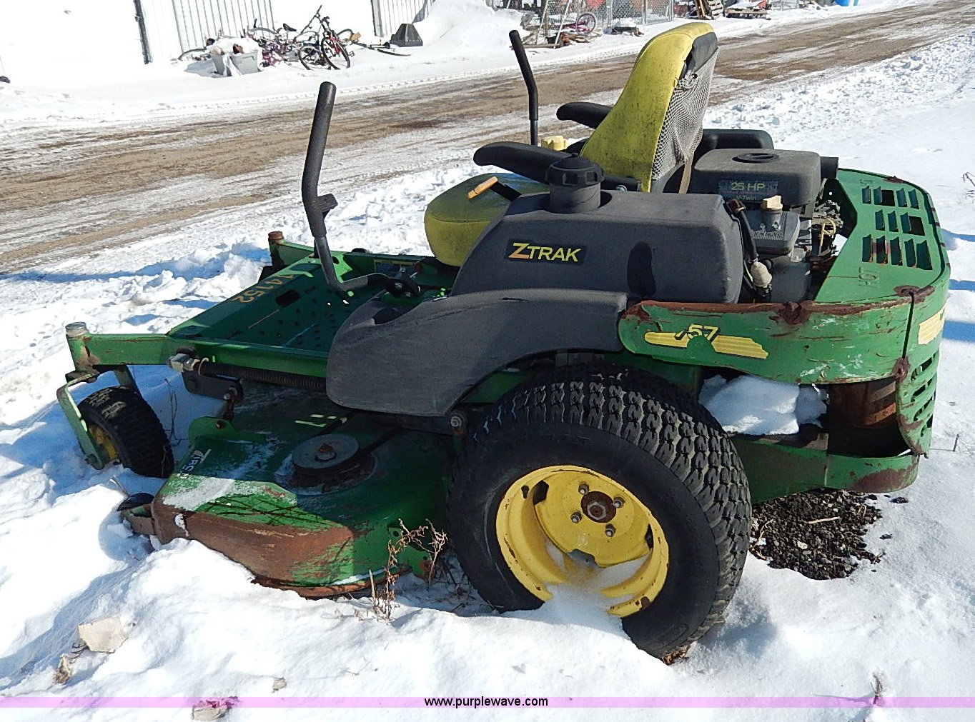 Purple Wave is selling a used Commercial Turf Mower in Kansas. This item is a John Deere 757 Ztrak lawn mower with the following: 5'W cut, Kawasaki V-twin 25 HP gas engine, Vinyl seat, 13 x 5.00-6 front tires, 24 x 12.00-12 rear tires