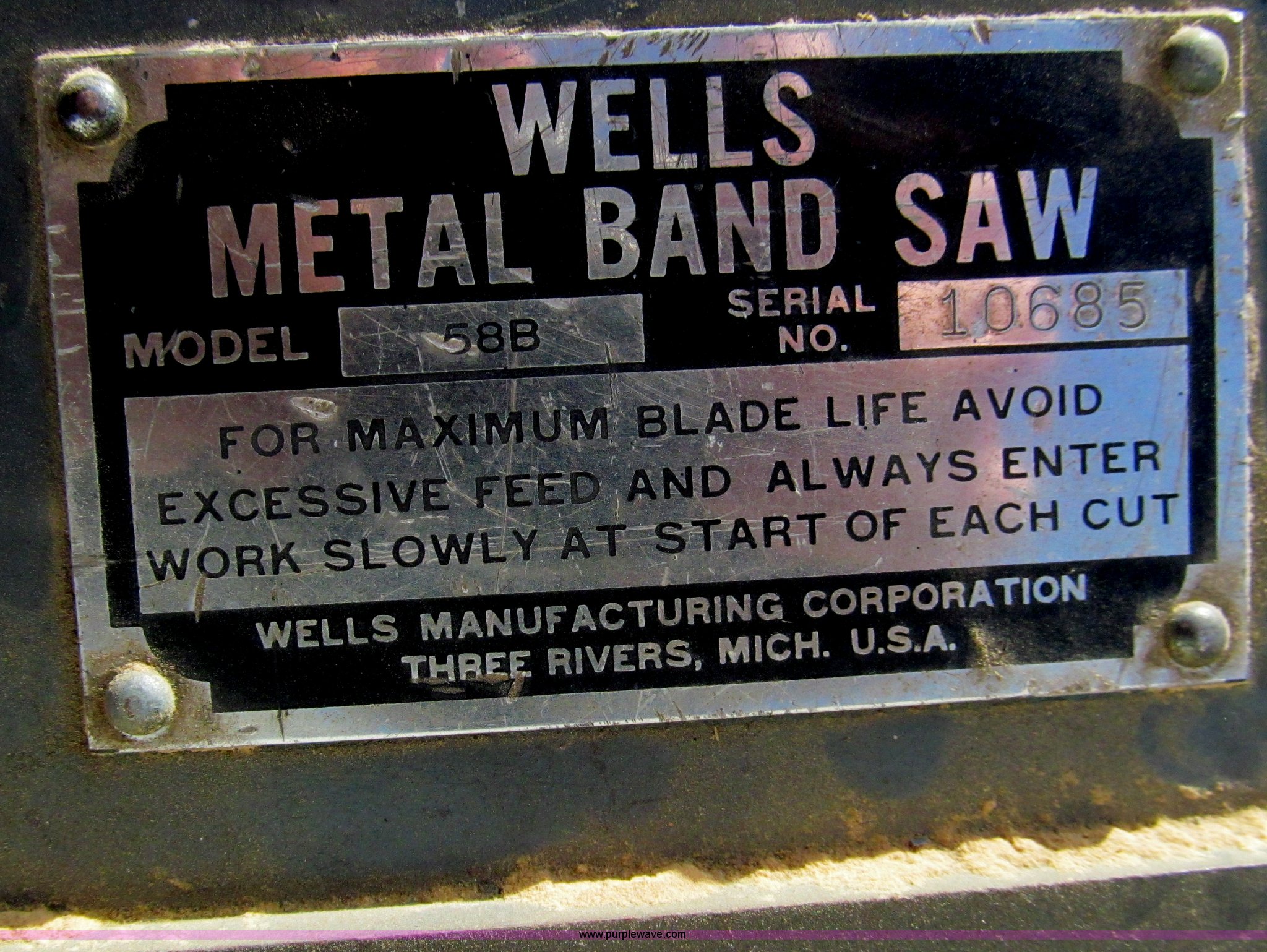 Purple Wave is selling a used Tools in Kansas. This item is a Wells 58B metal band saw with the following: 1/3 HP electric motor, Single phase, Serial 10685